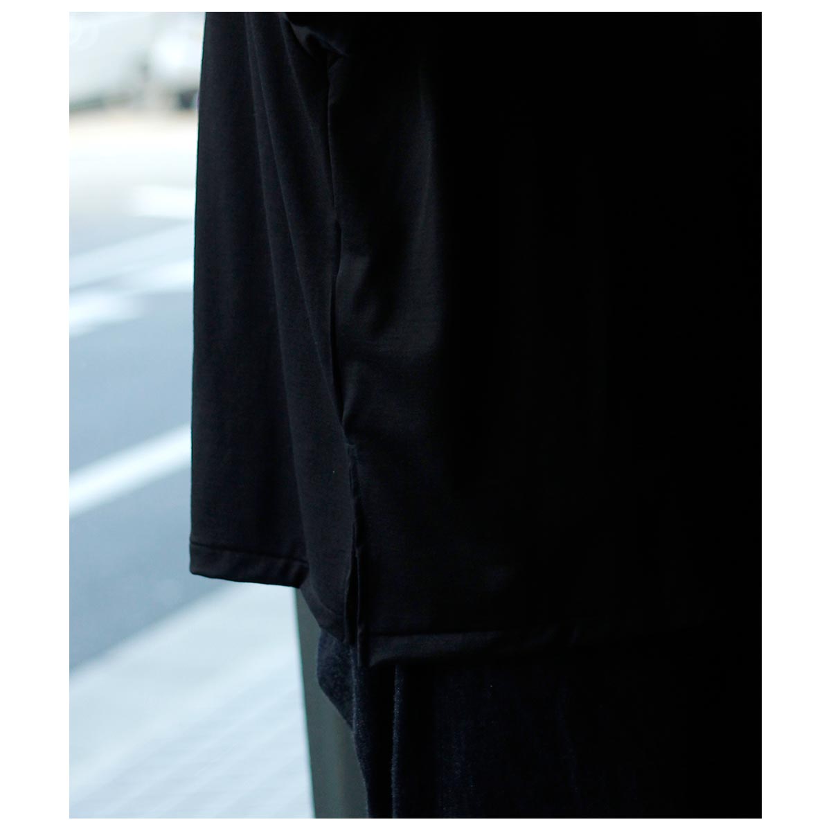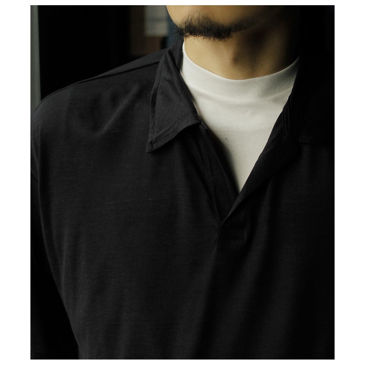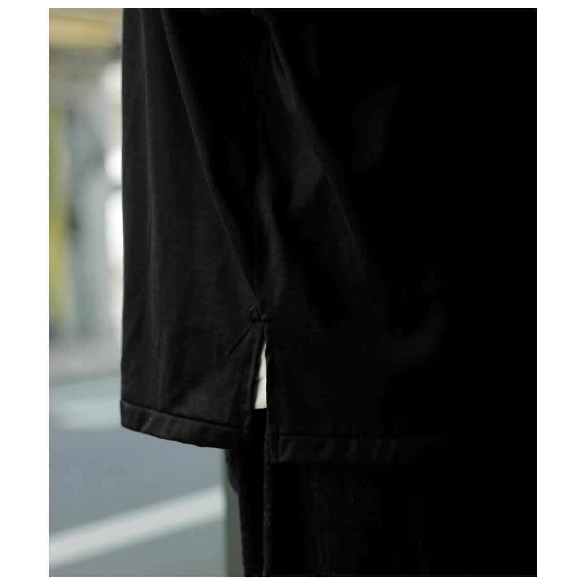 エクストラファインメリノによる48番単糸を使用したオリジナルのウール天竺生地。生機の時点で強い光沢感があるものの、整理加工時にさらに特殊加工を施し光沢感となめらかな表面感、美しい落ち感を表現しています。