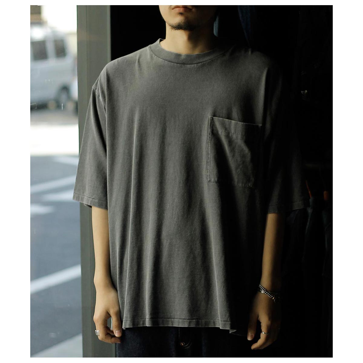 アメリカ製タフTシャツを着想源に、身巾・肩巾・ アームホール・袖口を極端に大きくとったハイパービッグTシャツ。着丈はやや短めに設定し、全体のバランスにも配慮。サイドスリットと前後差を加え、動きのあるシルエットに仕上げました。 フロントに大きなポケット付き。国内メリヤス専業工場で縫製し、裾は熟練職人による天地引き、 ネックは強度に優れたタコバインダーを採用。