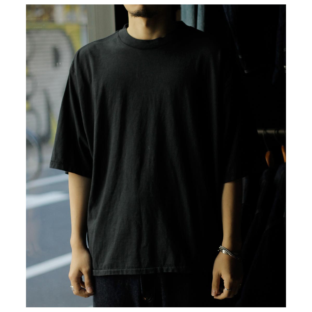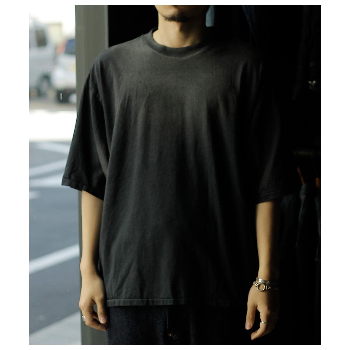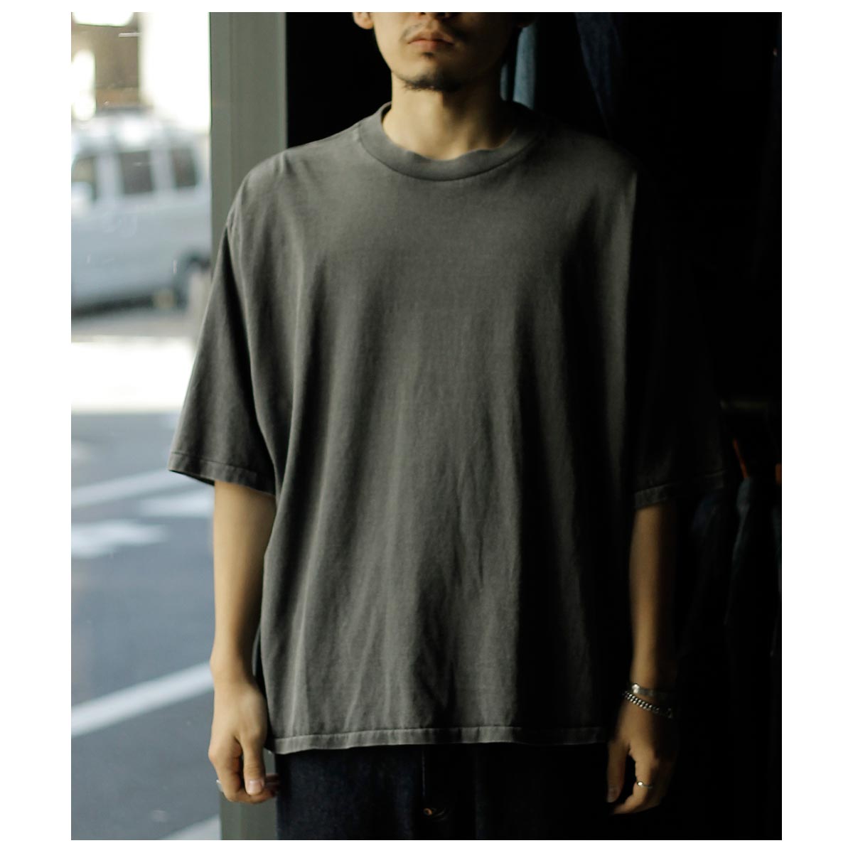 アメリカ製タフTシャツを着想源に、身巾・肩巾・ アームホール・袖口を極端に大きくとったハイパービッグTシャツ。着丈はやや短めに設定し、全体のバランスにも配慮。サイドスリットと前後差を加え、動きのあるシルエットに仕上げました。国内メリヤス専業工場で縫製し、裾は熟練職人による天地引き、 ネックは強度に優れたタコバインダーを採用。