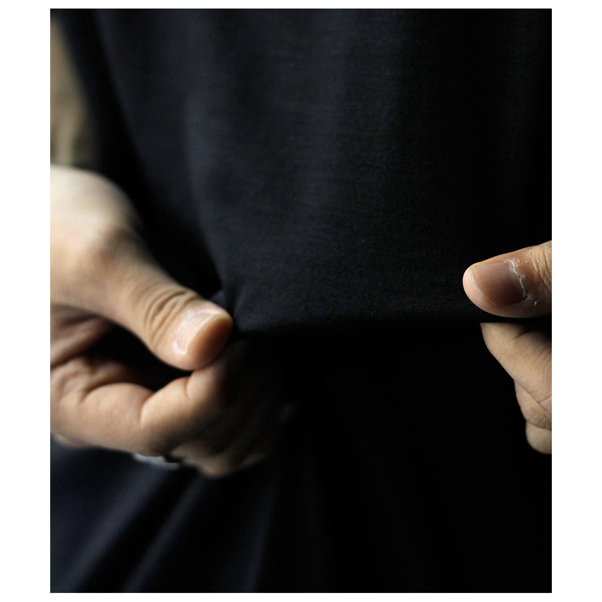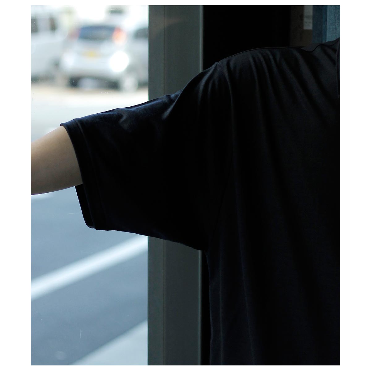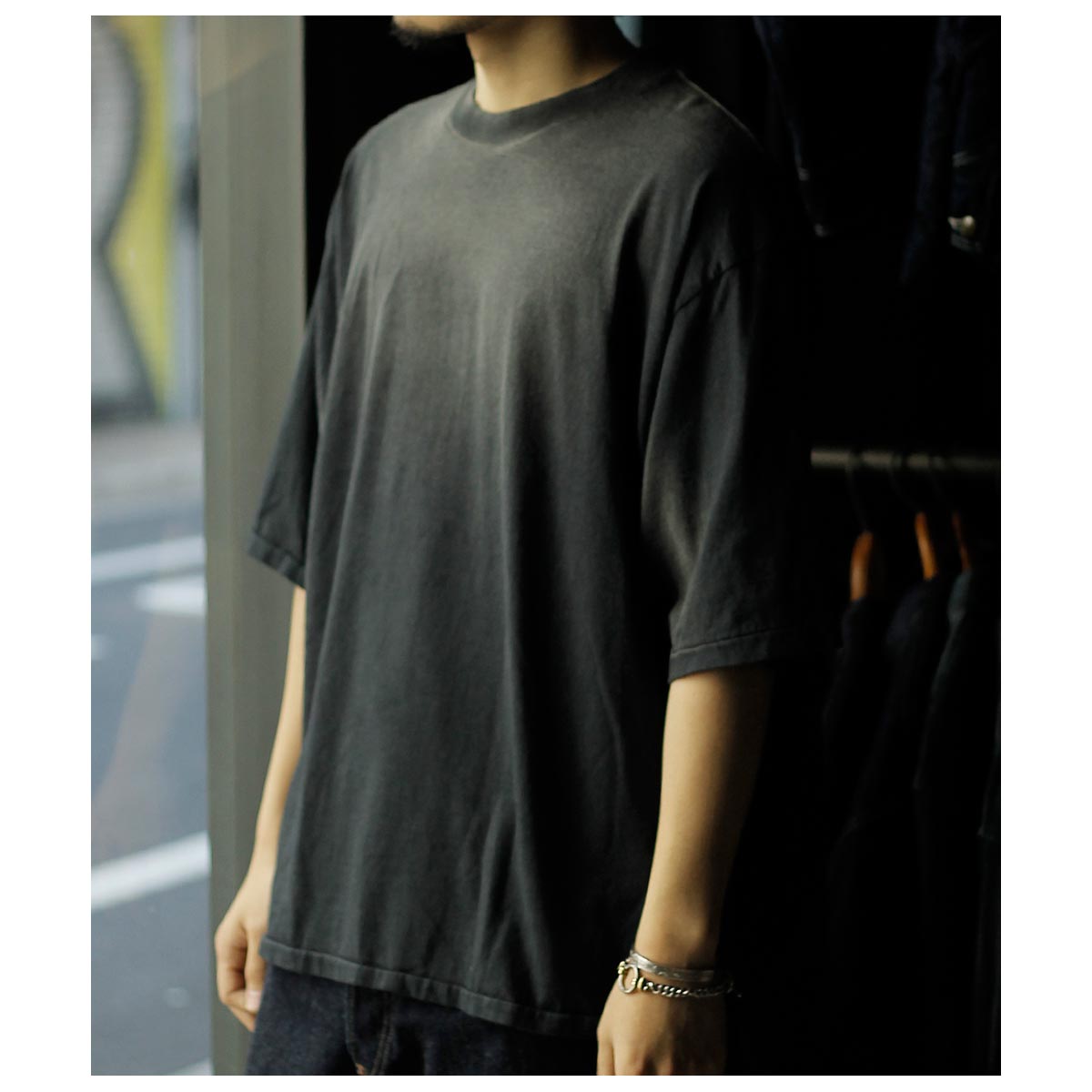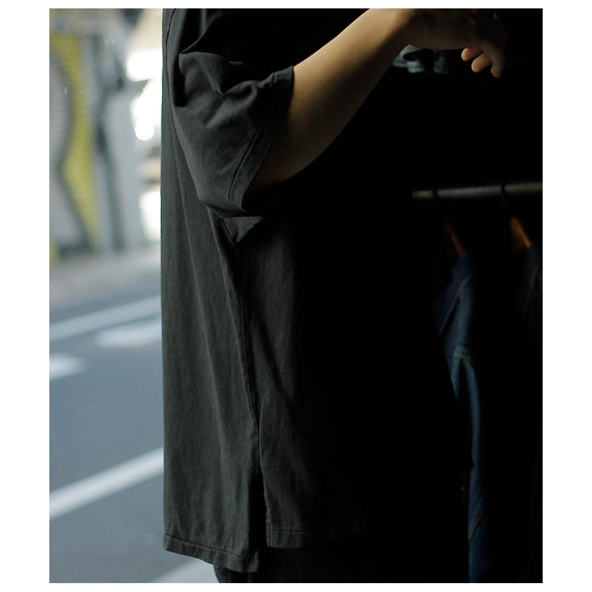 アメリカ製タフTシャツを着想源に、身巾・肩巾・ アームホール・袖口を極端に大きくとったハイパービッグTシャツ。着丈はやや短めに設定し、全体のバランスにも配慮。サイドスリットと前後差を加え、動きのあるシルエットに仕上げました。国内メリヤス専業工場で縫製し、裾は熟練職人による天地引き、 ネックは強度に優れたタコバインダーを採用。