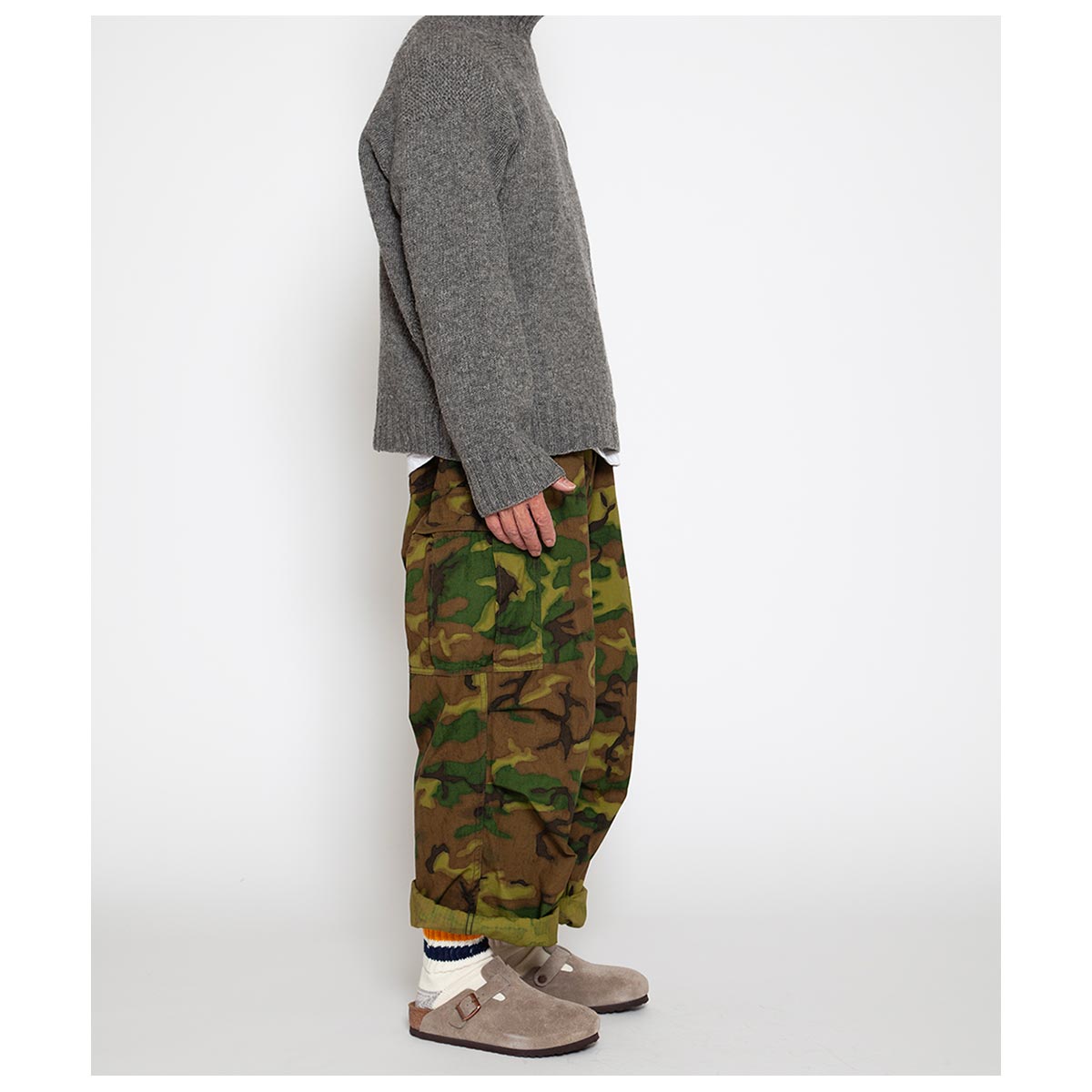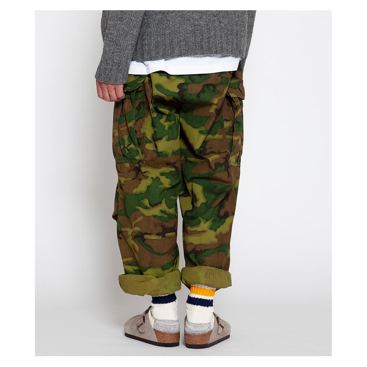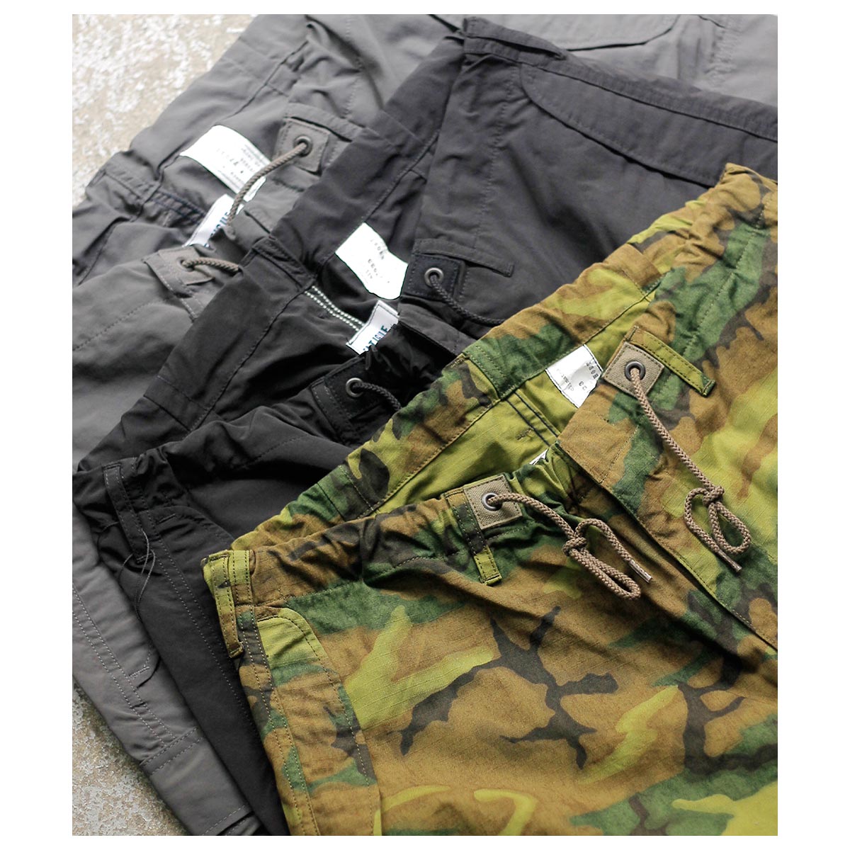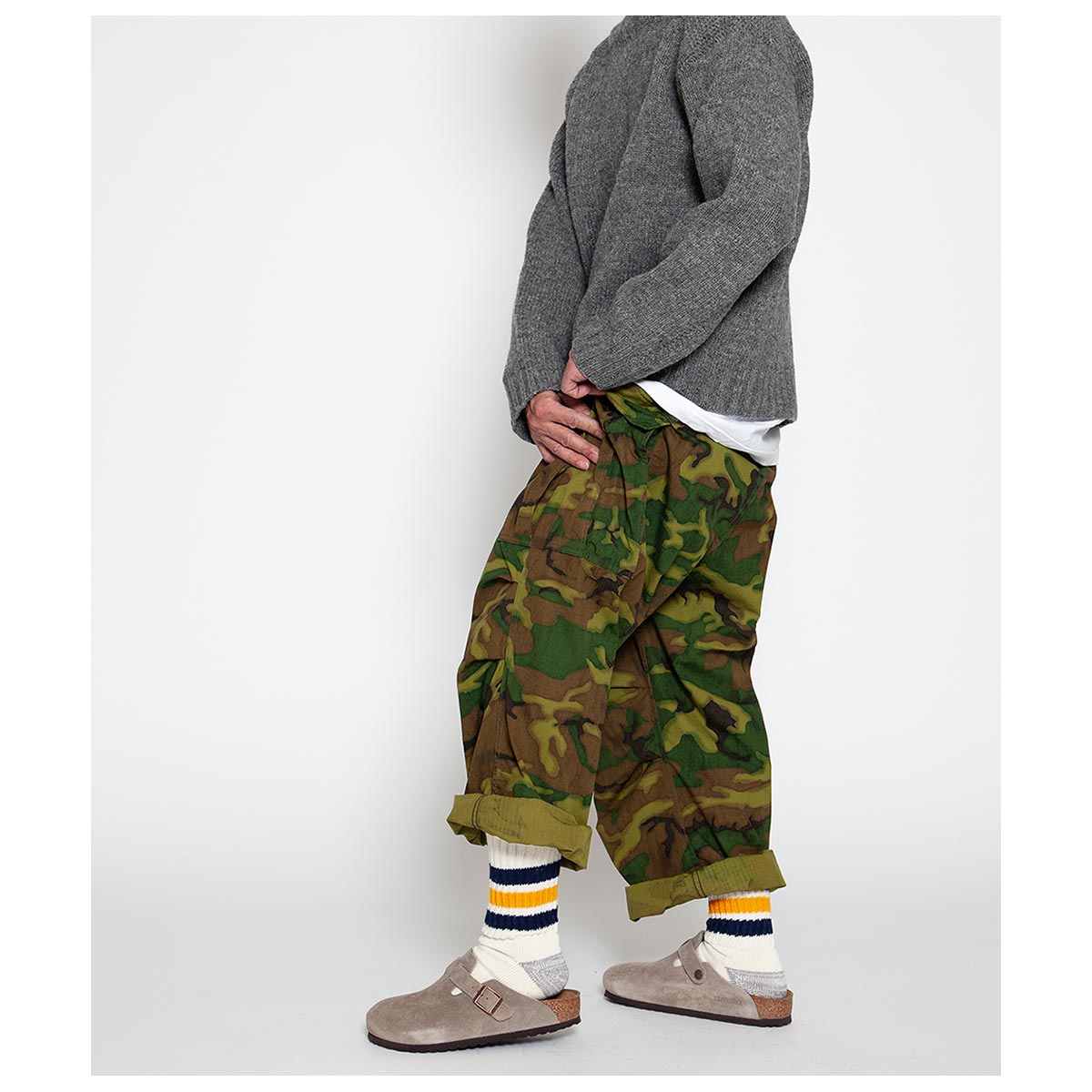 1950年代のミリタリーオーバーパンツをフィーチャーしたモデル。 現在、FATIGUE SLACKSのラインナップの中で最もワイドなシルエットのパンツとなります。 ウエストはドローコードで調整するイージーパンツ仕様で、深い股上と膝に入った2本のタックが立体感を生み、非常にリラックスした穿き心地を実現しています。
