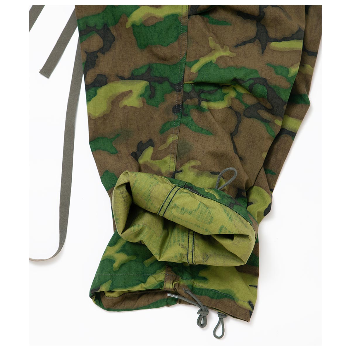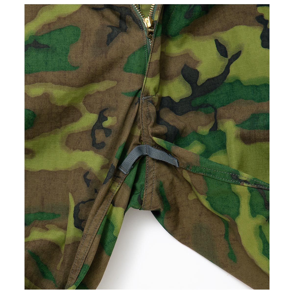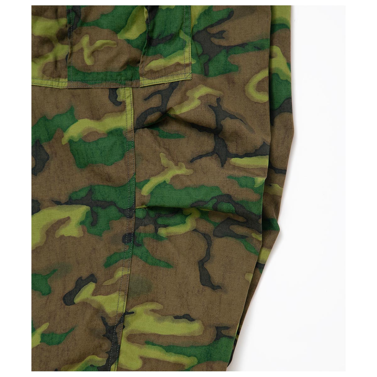 ハリ感の強い薄手のコットンリップストップに、60年代の米軍迷彩・ERDLグリーンリーフパターンをプリントした生地。滲んだような柄のプリント手法が特徴です。