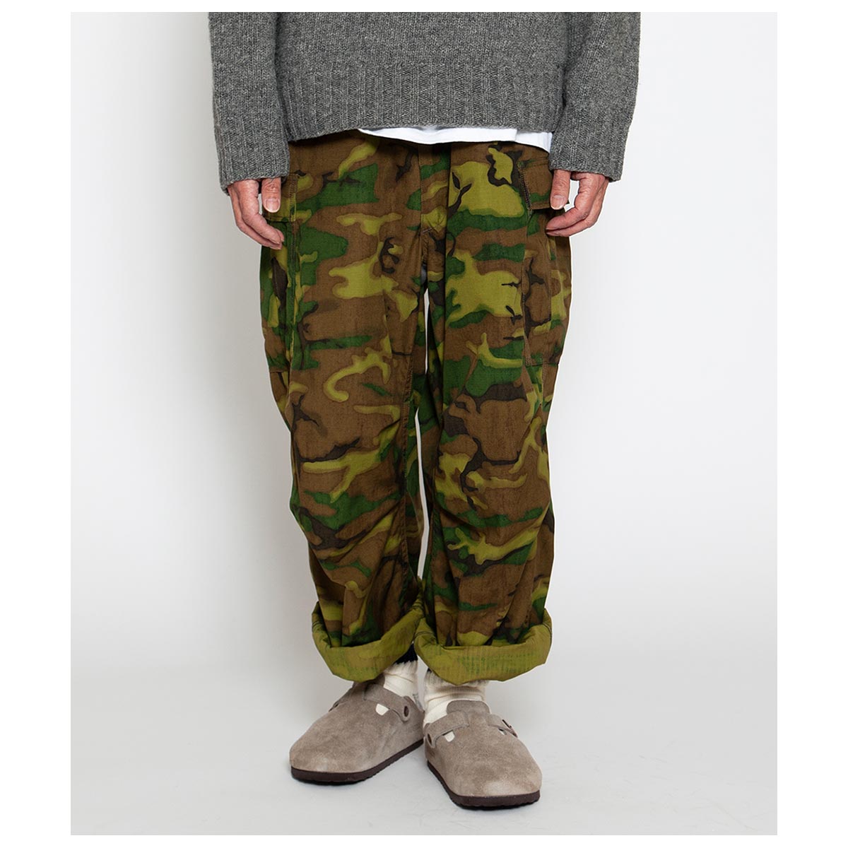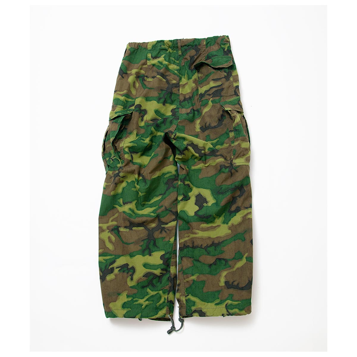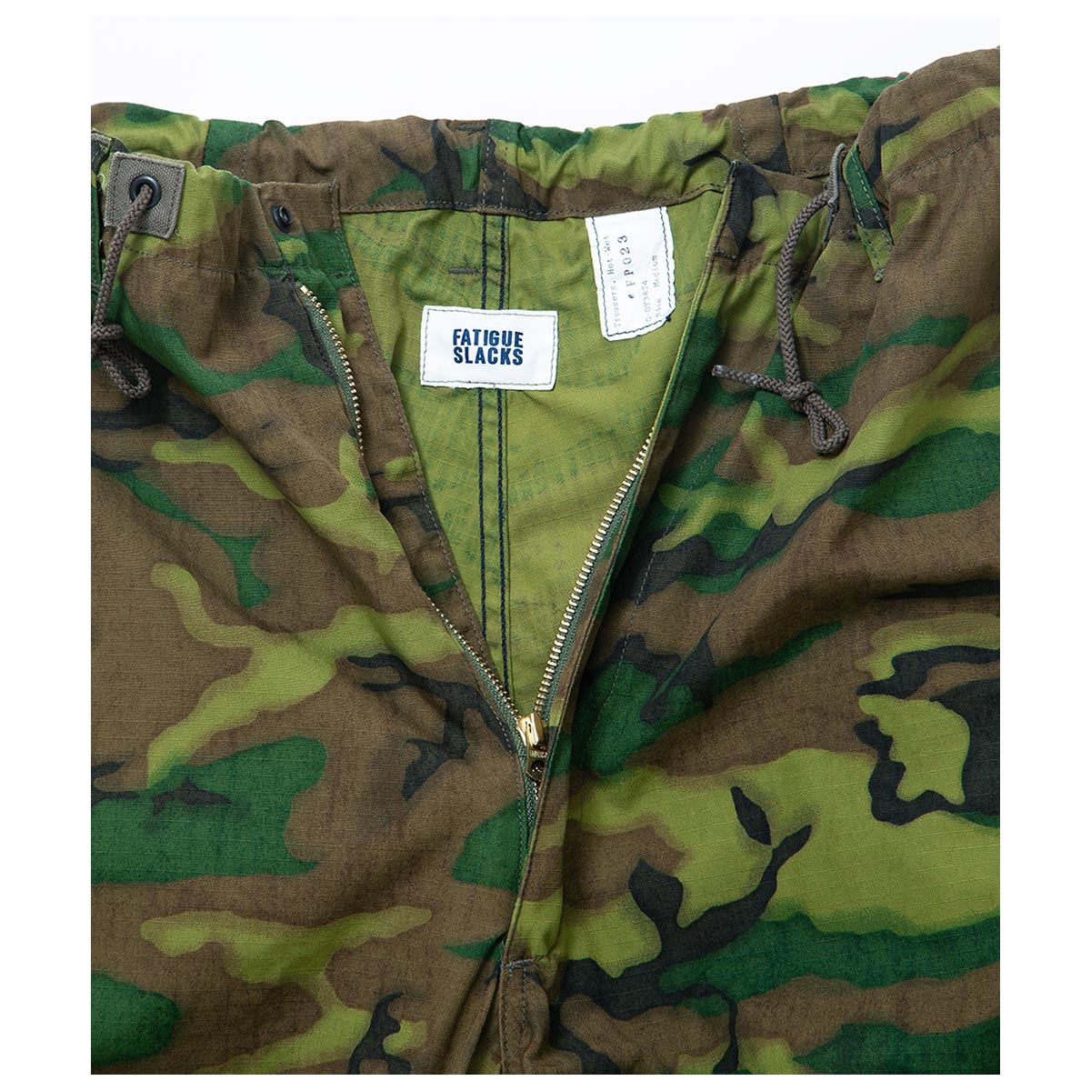 ハリ感の強い薄手のコットンリップストップに、60年代の米軍迷彩・ERDLグリーンリーフパターンをプリントした生地。滲んだような柄のプリント手法が特徴です。