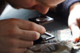 Pinwaleとは細畝という意味。 コーデュロイなどのwaleとは正に畑で土を盛り上げた線上の畝を指しています。 ベースとなった生地は家具用に開発された非常に硬い生地で、それを服用に改良して出来たのがこの生地で す。経糸にレーヨンフィラメント、緯糸にはレーヨンの黒モール糸、黒ウール糸、コットンリネンのスラブ ヤーンの3種を並べて横二重織の変則織り、ブラウンに染めて最後はワッシャーで仕上げました。 非常に立体感のある表情豊かな生地に仕上がっています。
