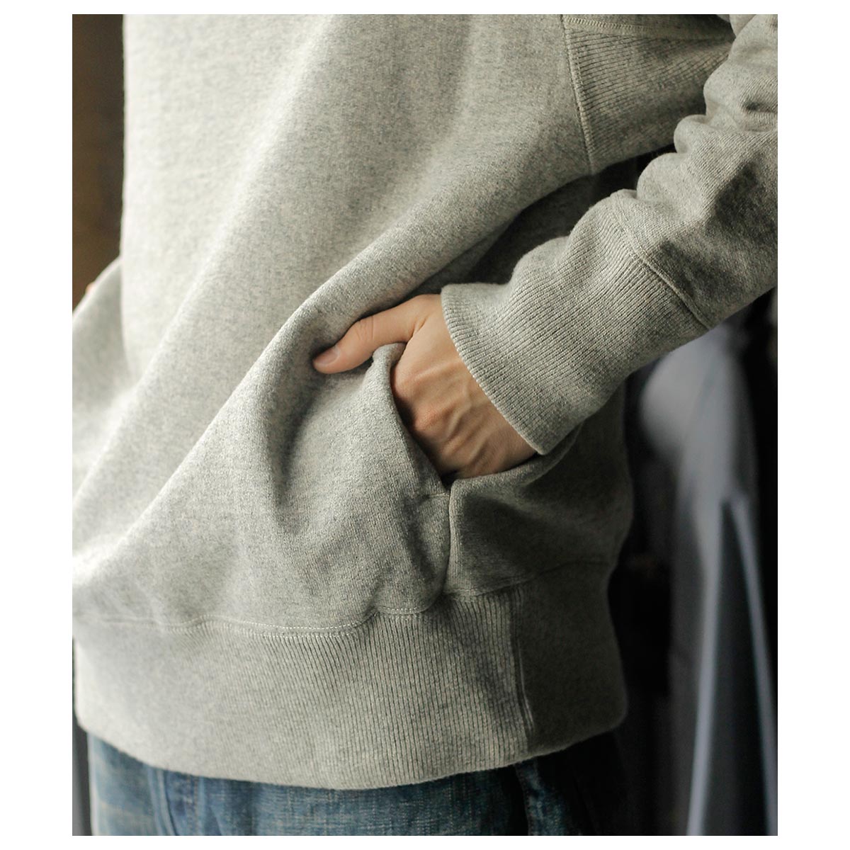 ヴィンテージの資料で見たモックタートルのスウェットシャツをイメージしたモデル。編立てを生かし衿のみ編み組織を変えたリブで、セーターのようなニュアンスに仕上げている。機能性とゆったりした着やすさの為に、 脇下にはマチを入れている。ポケットは少し前に脇線を振って手を入れやすくしている。
