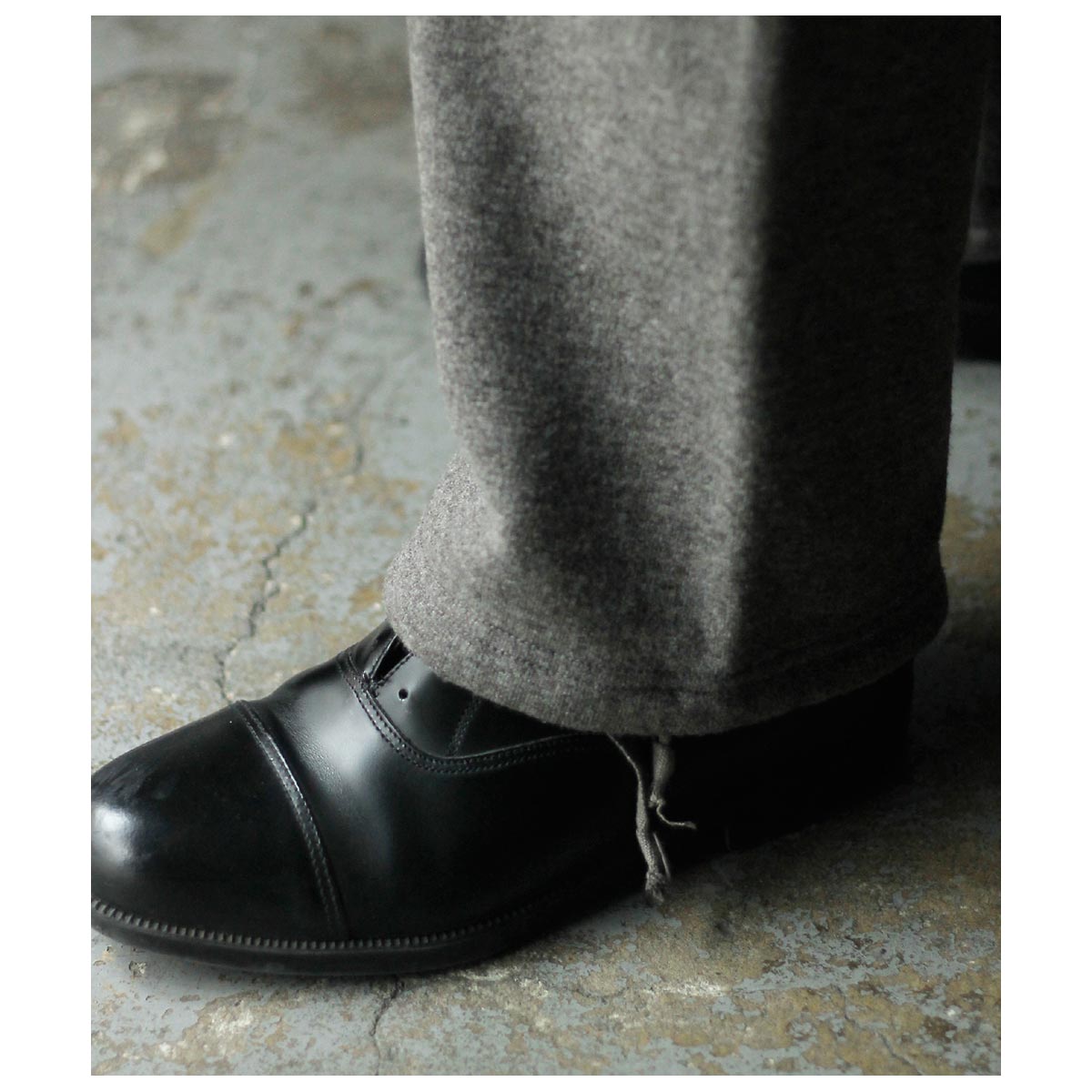 ヴィンテージのトラックパンツのイメージで、股下にマチを入れたパターン。フラットでイージーなパターンのヴィンテージのパンツとは違い、しっかりした生地の肉感を考慮して、体の動き分量を考えた前後差のあるパターンで制作している。動きやすく、暖かく、外着としてサマになる優れもの。 大き目のサイズ感なので普段よりワンサイズダウンのチョイスをおすすめしてます。トラックパンツのデメリットである膝が抜けるということもほぼ無いので、楽な着心地に反して合わせるアイテムやシーンを選ばな い冬の万能なパンツです。