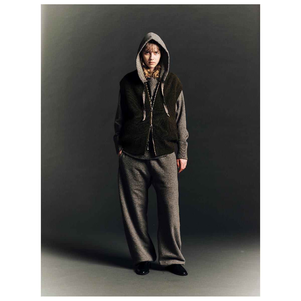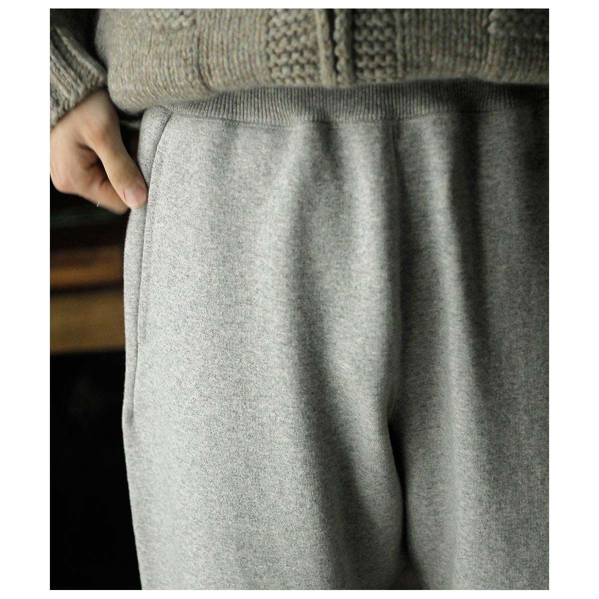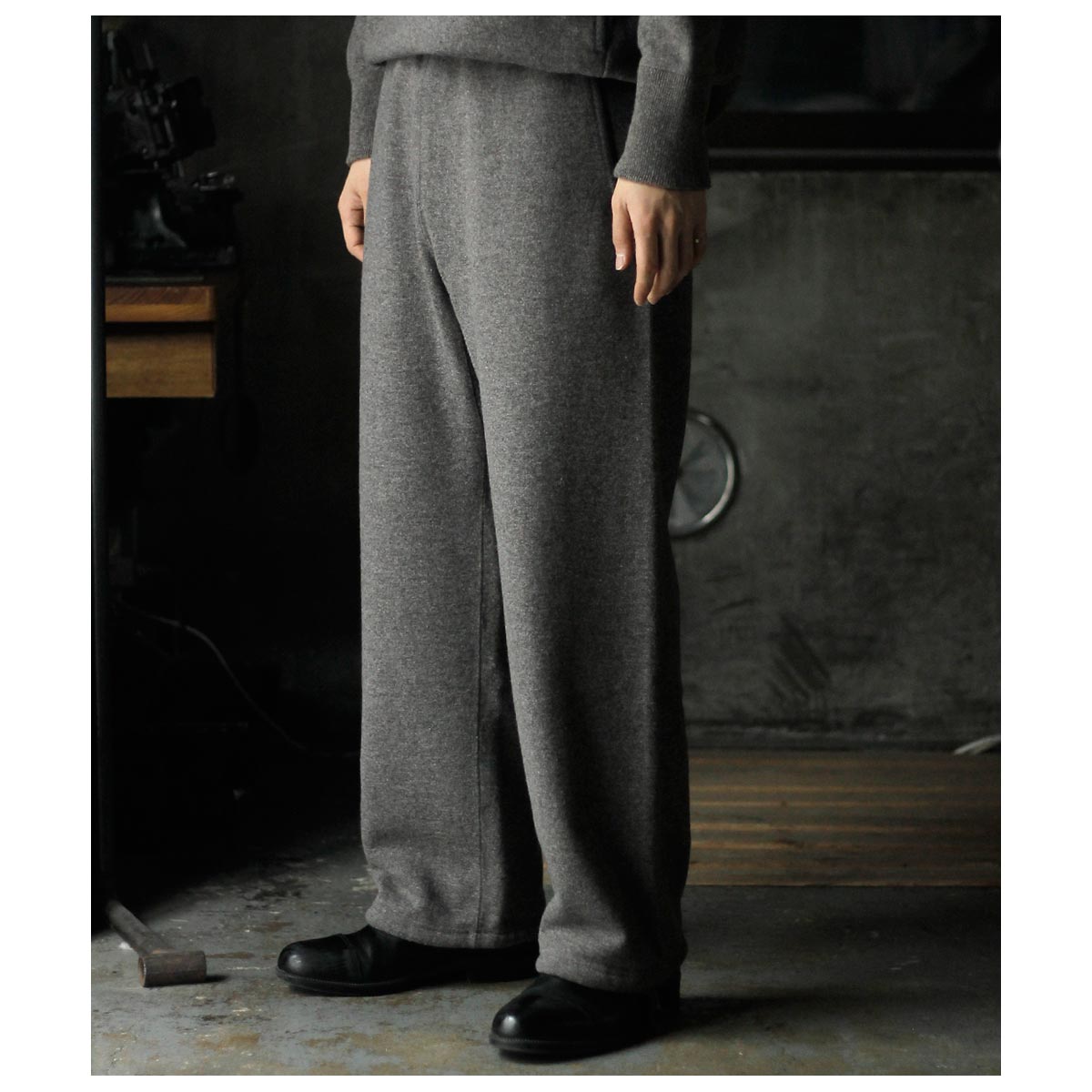 この素材を企画した最初にやりたかったのがトラックパンツ。ボリューム感のあるセーターや紡毛の素材感との合わせに、程よい抜け感を加えてくれるアイテム。