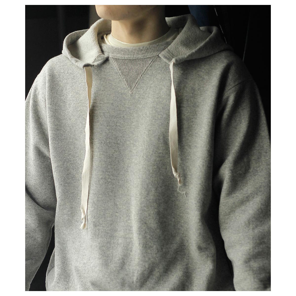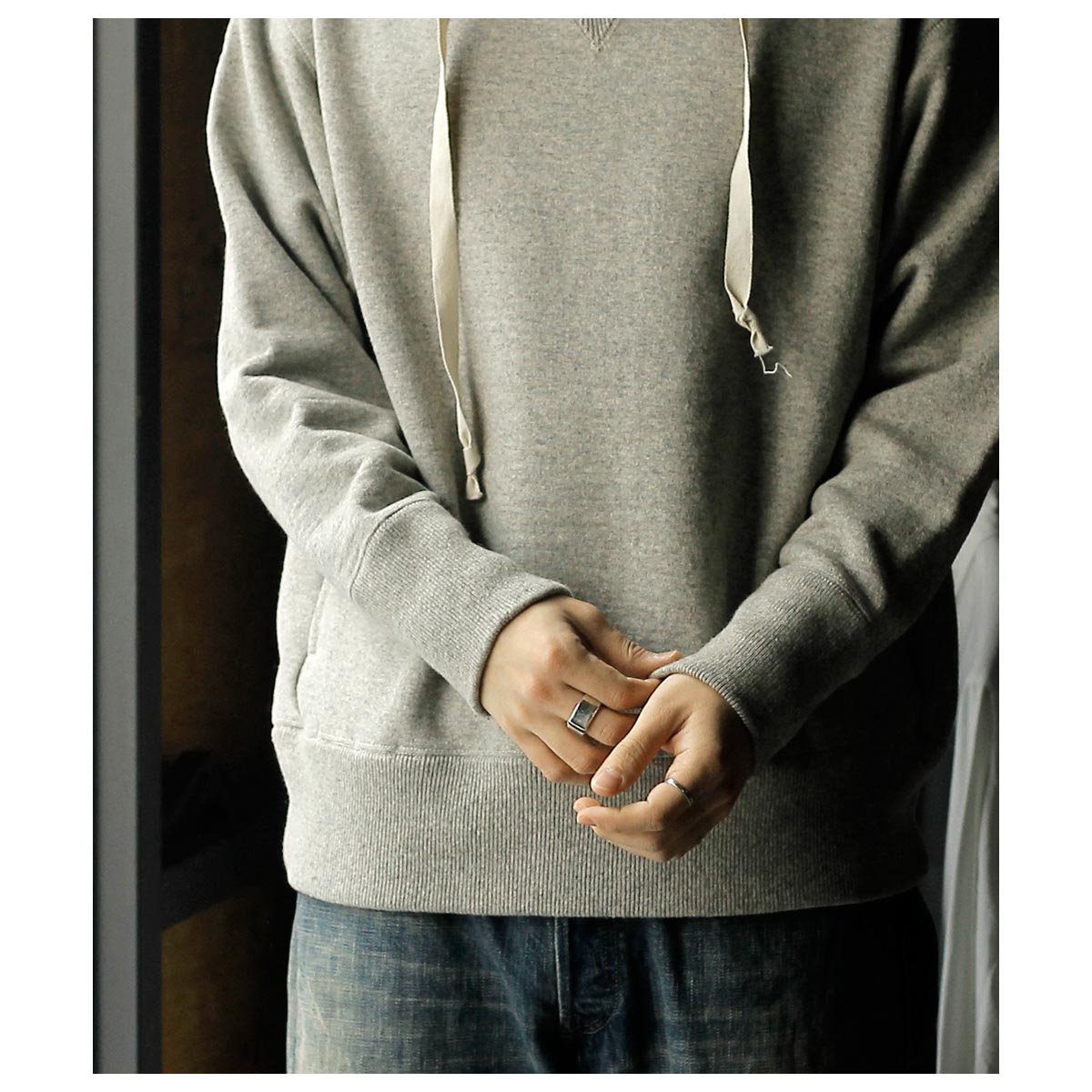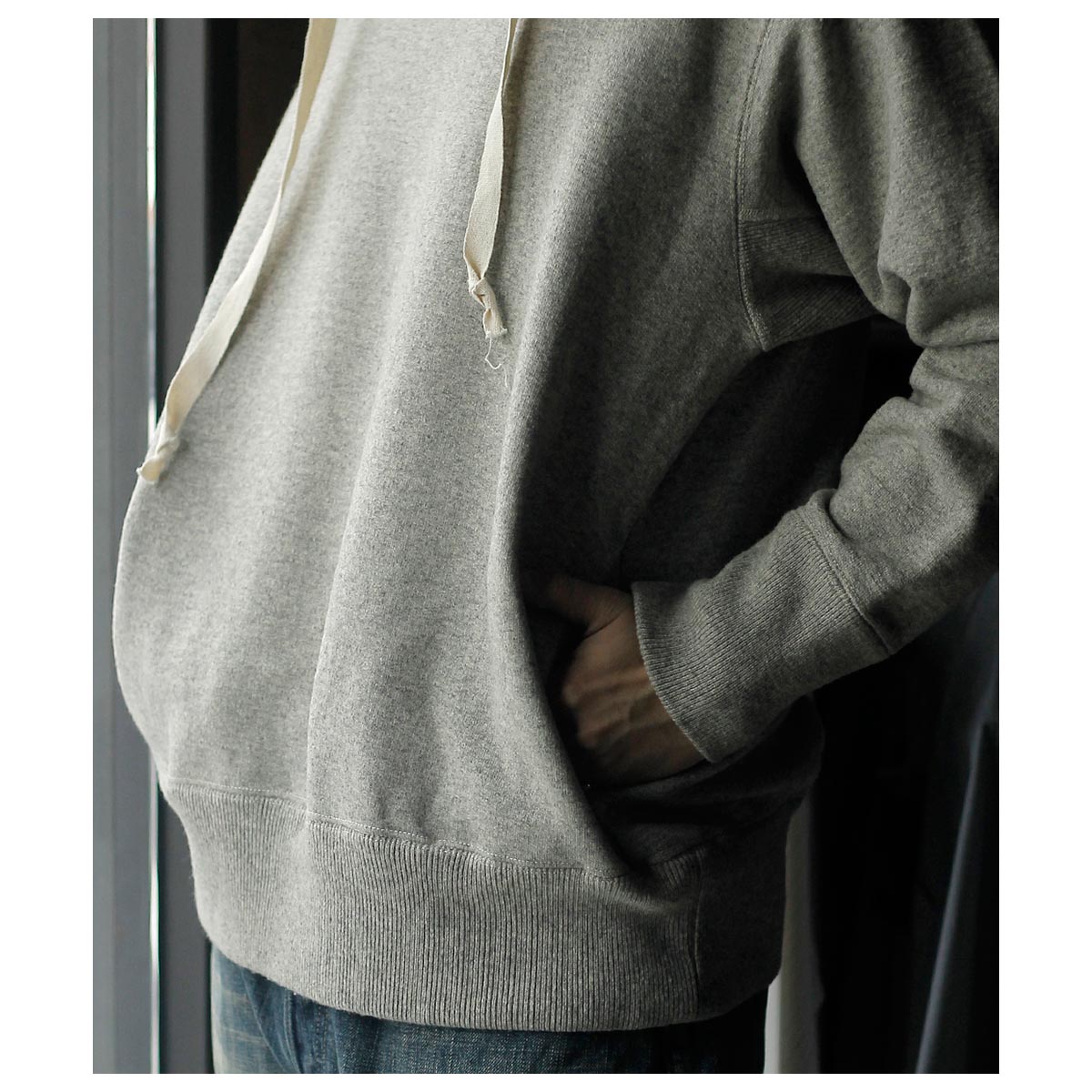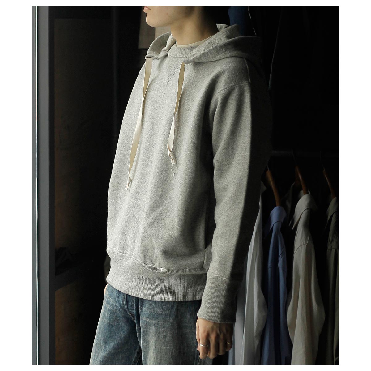 形はヴィンテージ市場では高値で取引される「後付けフーディー(after hoodie)」がモチーフ。 カンガルーポケットよりモダンな印象で着られるよう、スラッシュポケットに。 ヴィンテージらしい雰囲気とすっきりとしたモダンな印象が共存するバランスの良いフーディーです。フードのスピンドルは結べる長さに設定していますが、邪魔な場合カットしてもOKです。
