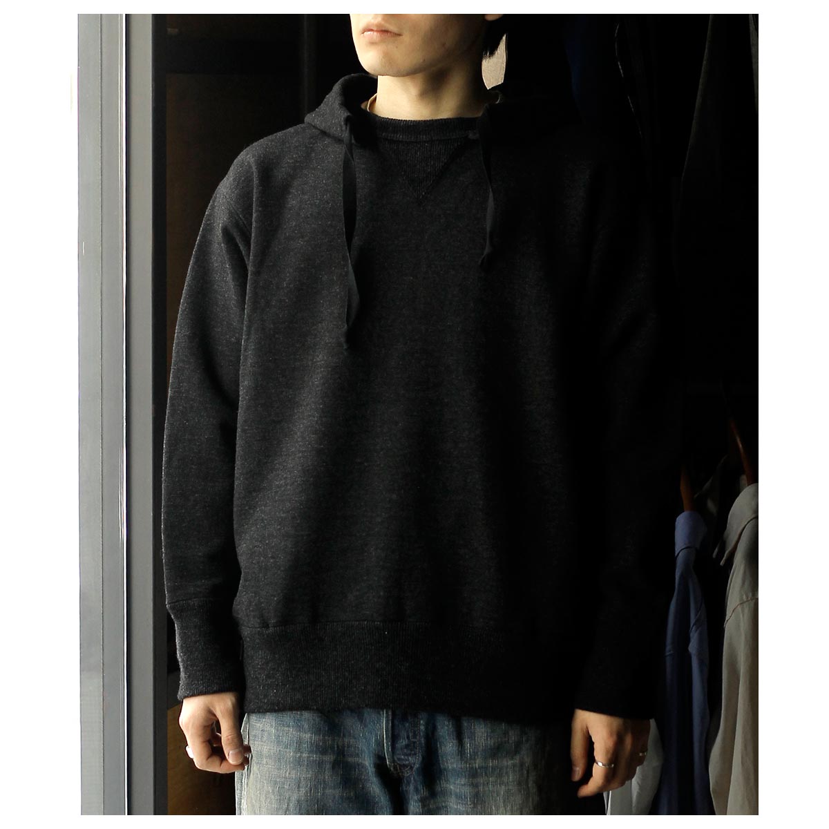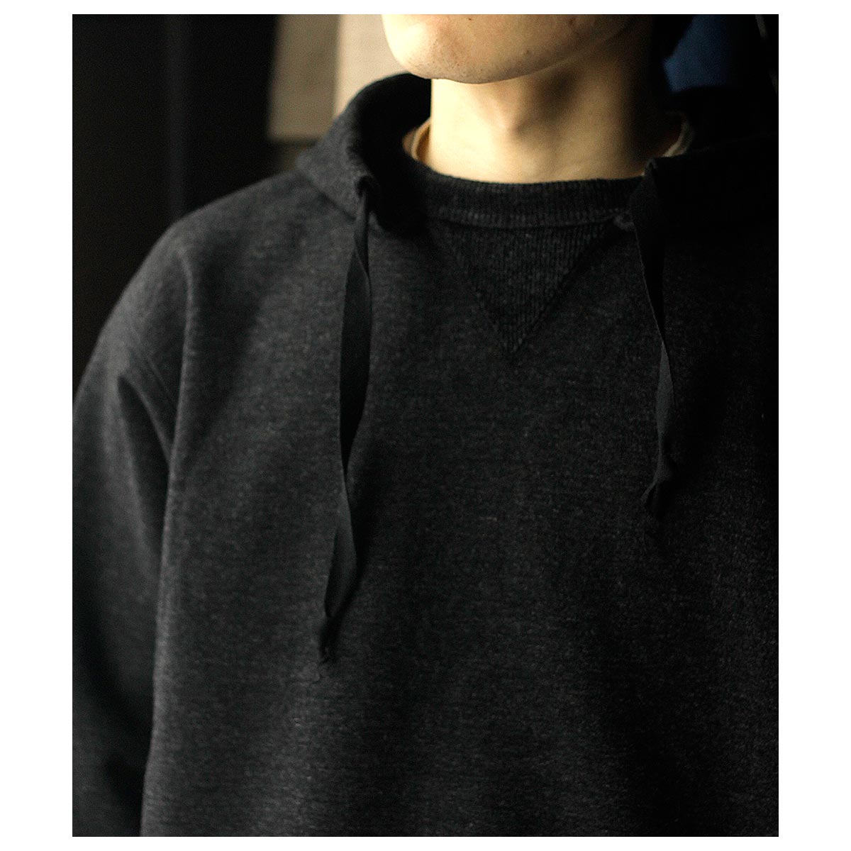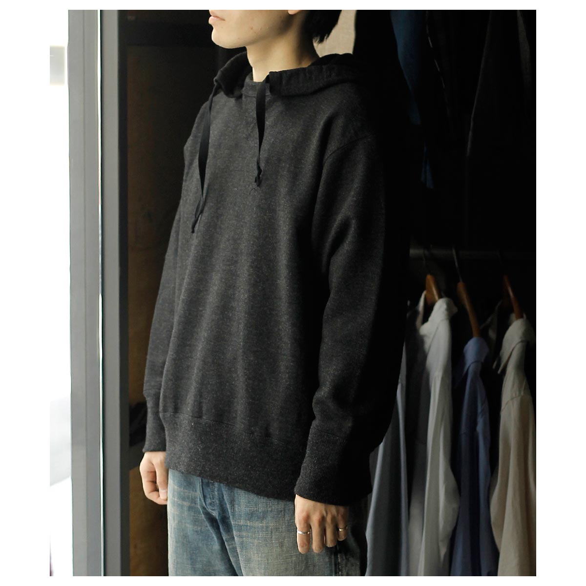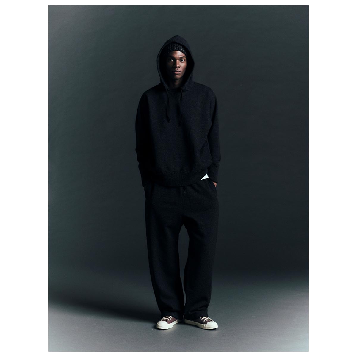 形はヴィンテージ市場では高値で取引される「後付けフーディー(after hoodie)」がモチーフ。 カンガルーポケットよりモダンな印象で着られるよう、スラッシュポケットに。 ヴィンテージらしい雰囲気とすっきりとしたモダンな印象が共存するバランスの良いフーディーです。フードのスピンドルは結べる長さに設定していますが、邪魔な場合カットしてもOKです。