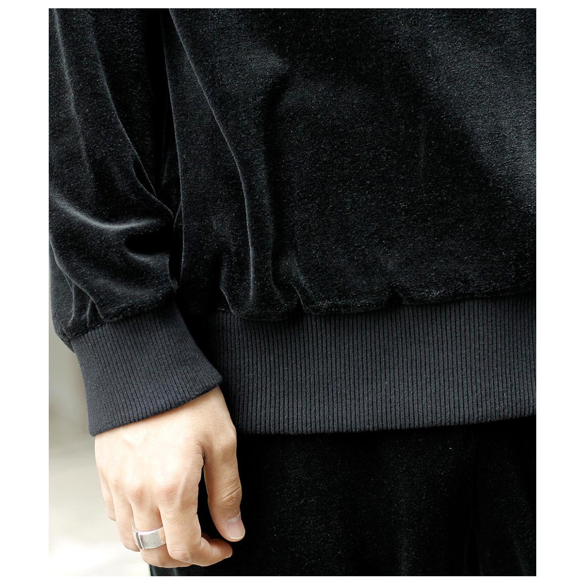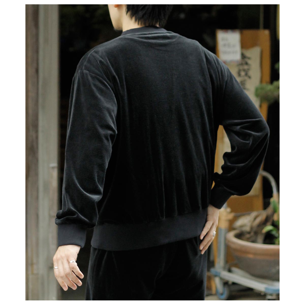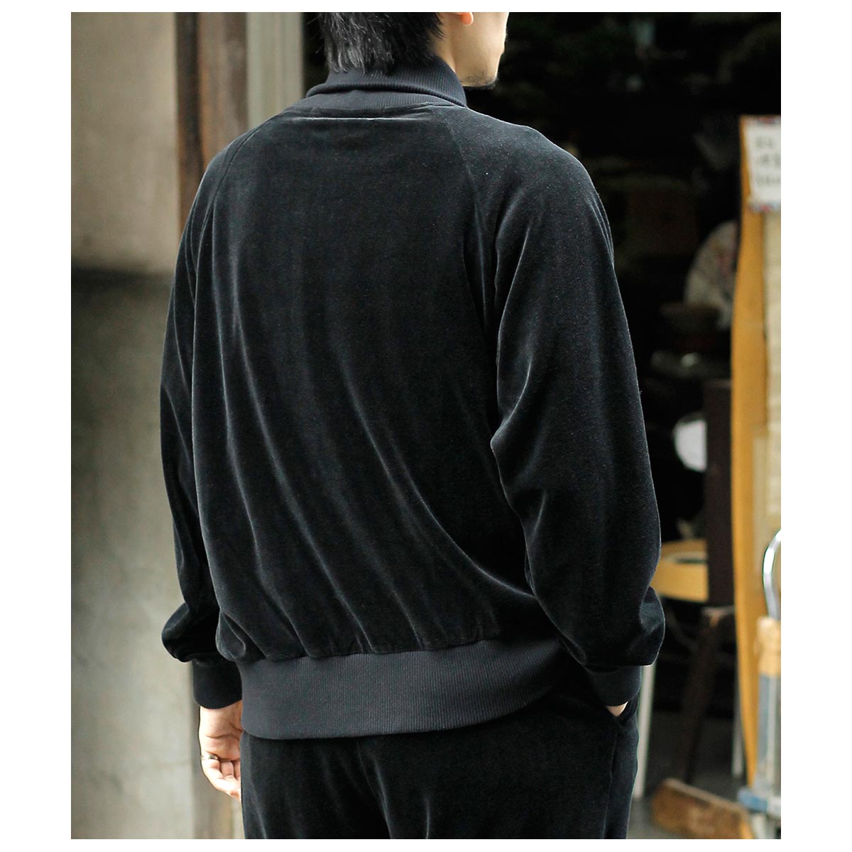 ちょっとスポーティなトラックジャケットやスウェットタイプのプルオーバーをイメージして制作。 古着で見かけるベロアは大体コットンやレーヨンにナイロンやポリエステルが入った混率のものが多い。設計上、起毛部分のパイルの毛抜けを防ぐためにナイロンやポリエステルのような繊維の細く強い糸を絡ませるため。 ただ、それだと少し高級感に欠けカジュアルな仕上がりになるので、無理を言ってナイロンやポリエステルを入れずにできる方法で作ってもらったのがこの素材。パンツに対応できる肉感にもこだわった。 リブ付属は伸びにくいようにコットンにストレッチ糸を入れて編立で作成。