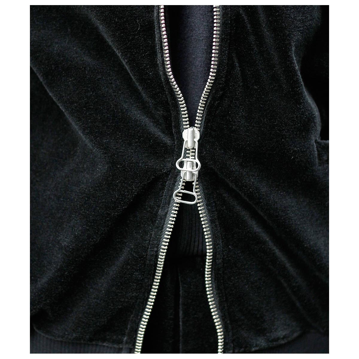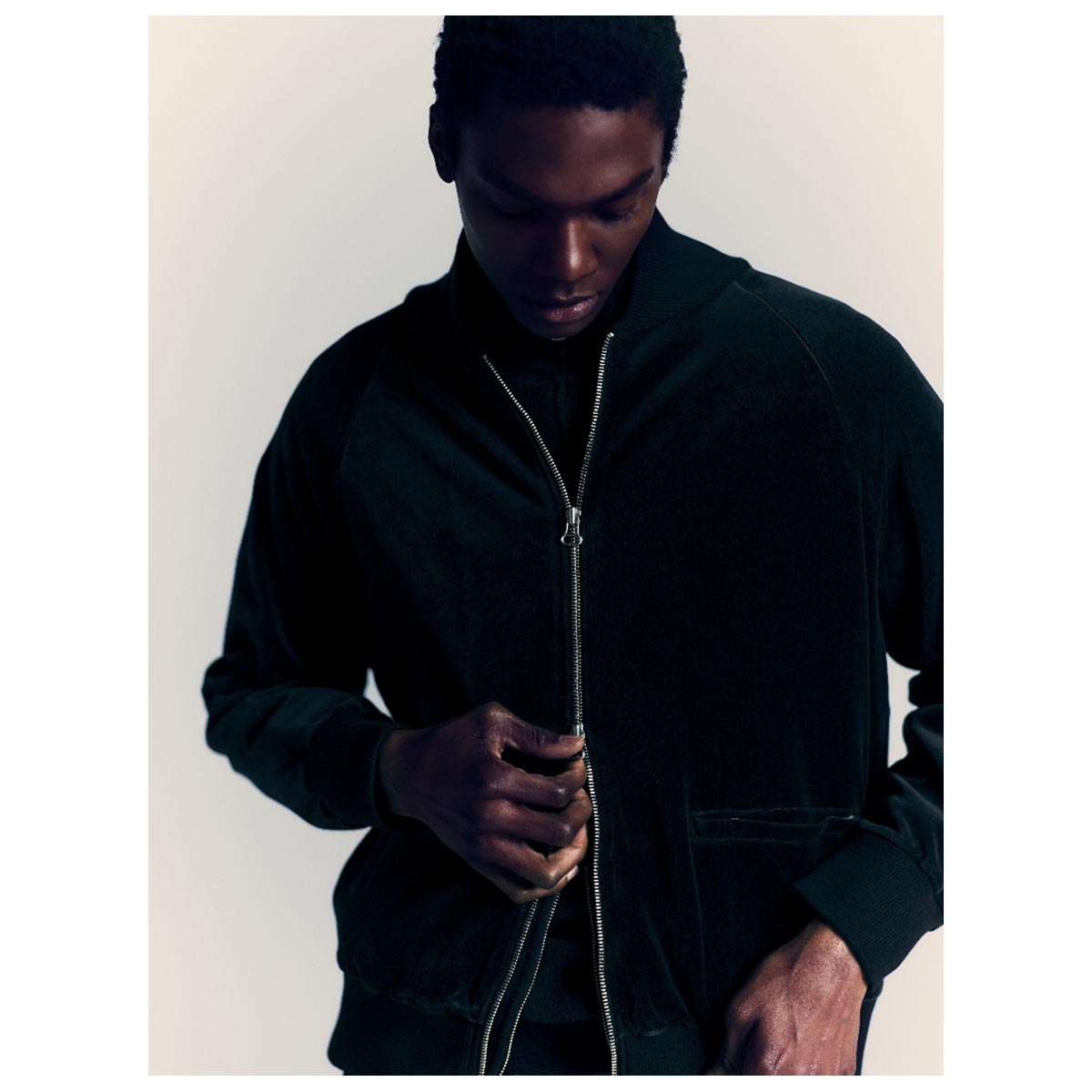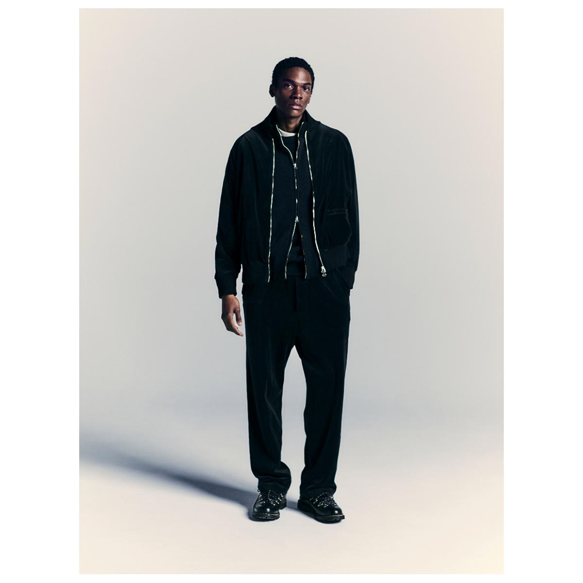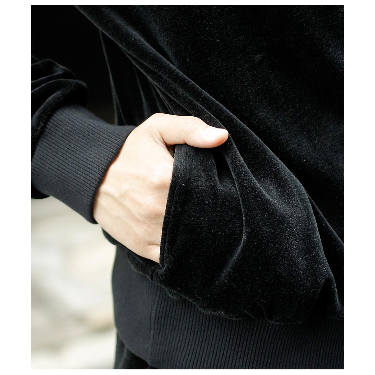 ちょっとスポーティなトラックジャケットやスウェットタイプのプルオーバーをイメージして制作。 古着で見かけるベロアは大体コットンやレーヨンにナイロンやポリエステルが入った混率のものが多い。設計上、起毛部分のパイルの毛抜けを防ぐためにナイロンやポリエステルのような繊維の細く強い糸を絡ませるため。 ただ、それだと少し高級感に欠けカジュアルな仕上がりになるので、無理を言ってナイロンやポリエステルを入れずにできる方法で作ってもらったのがこの素材。パンツに対応できる肉感にもこだわった。 リブ付属は伸びにくいようにコットンにストレッチ糸を入れて編立で作成。