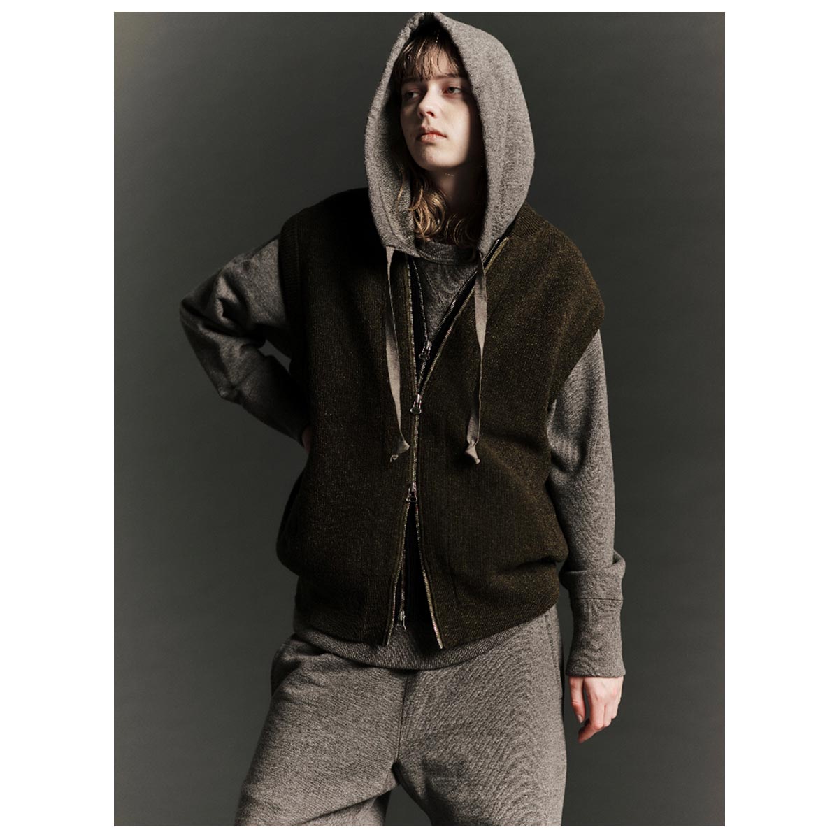 23AWから継続しているSlopeslowオリジナルのウール100%の裏毛素材。表面、裏面(ループ面)ともに編み機に入る限界の太番手紡毛ウールを使用しているので、限界に目が詰まって重量もメーター当たり1kg超え。表と裏を繋ぐ中糸は梳毛ウール を使い、ウール100%で仕上げています。限界に目が詰まっているため風も通さず、ちょっとした雪や雨もはじく紡毛ならではの特性も生きている。なによりも良いのが長時間、長期間、しわにもなりにくく、メルトンのような張りのあるフォルムが崩れないところ。