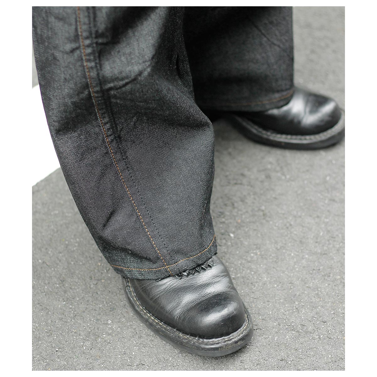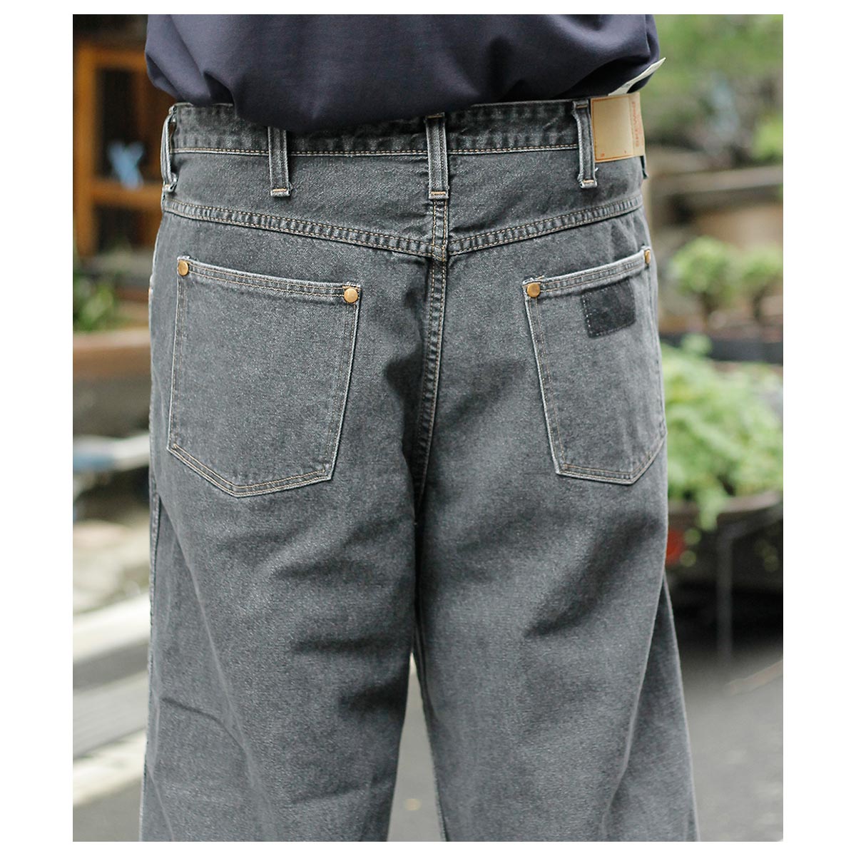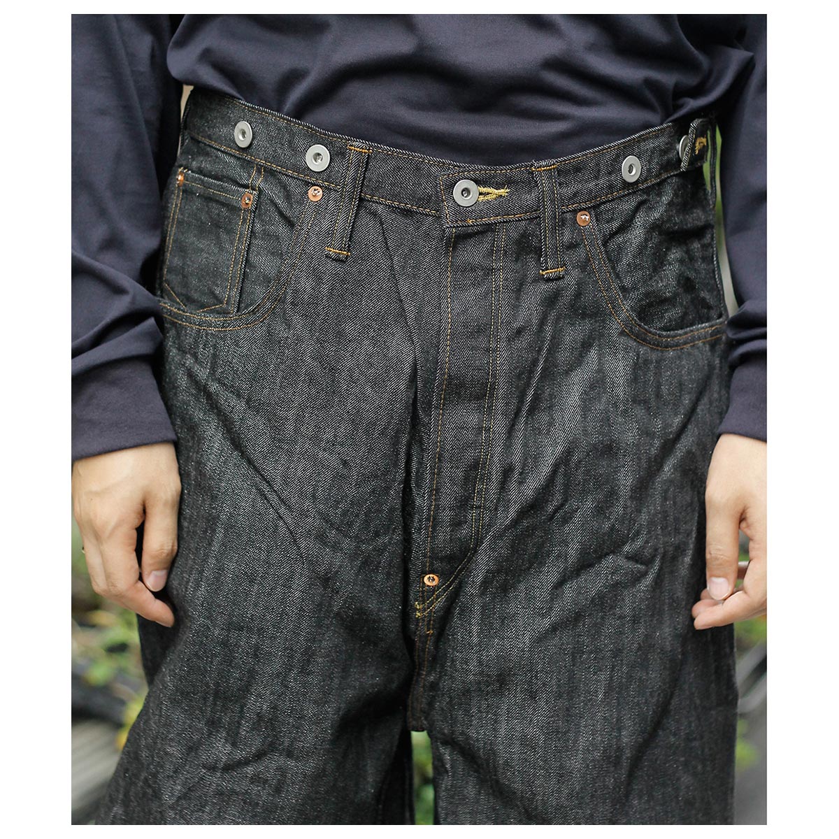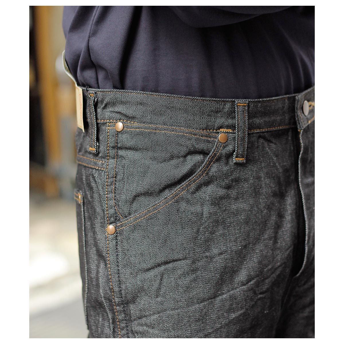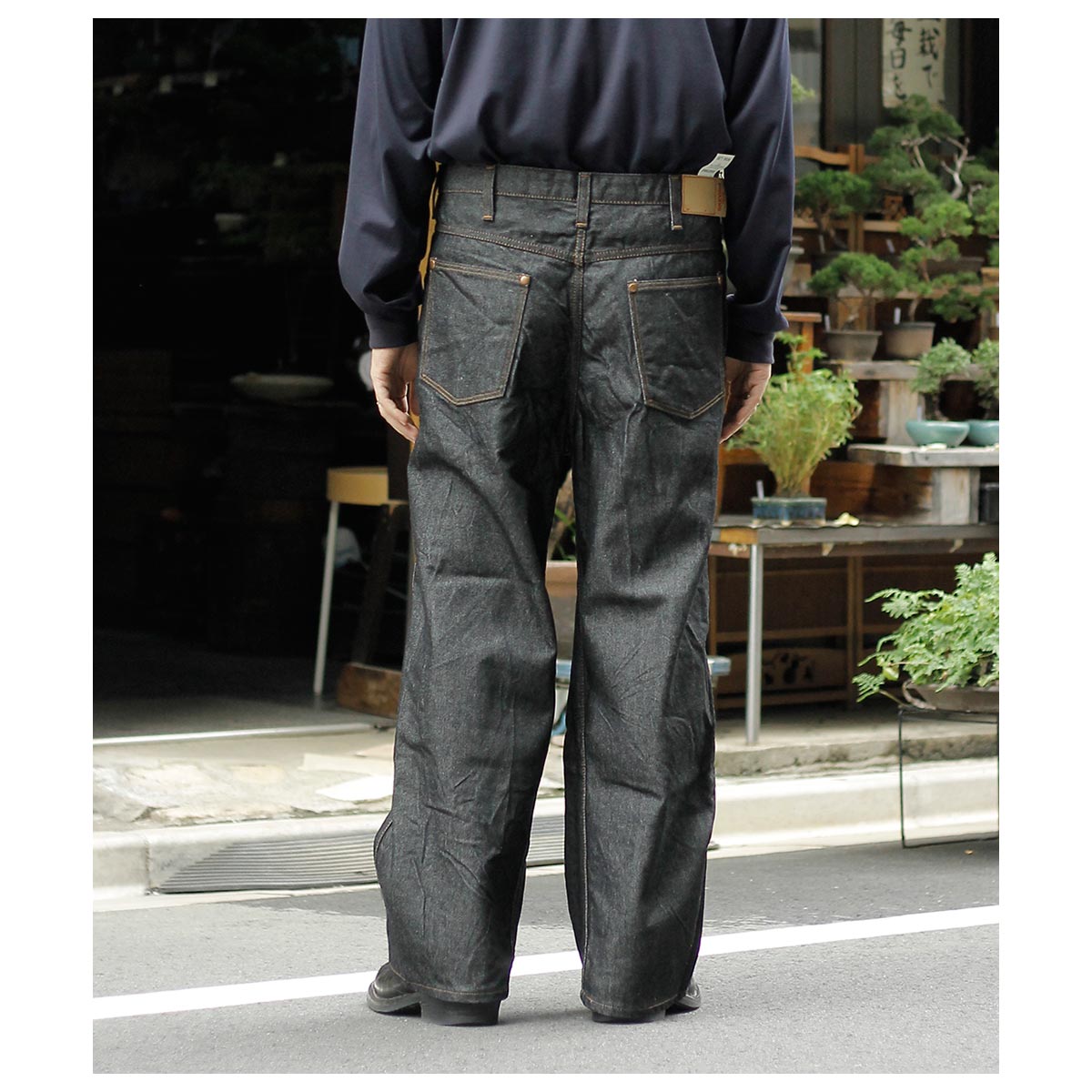 EDWIN「505」シリーズで使用のブラックデニムを採用。 ハリのある生地とブラックデニムらしい始まりの光沢感があり、インディゴとは違った締まりがあります。淡い色落ちが期待できます。