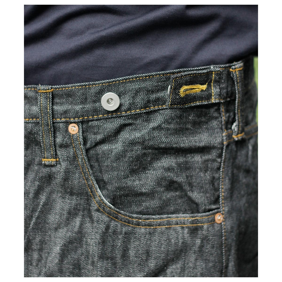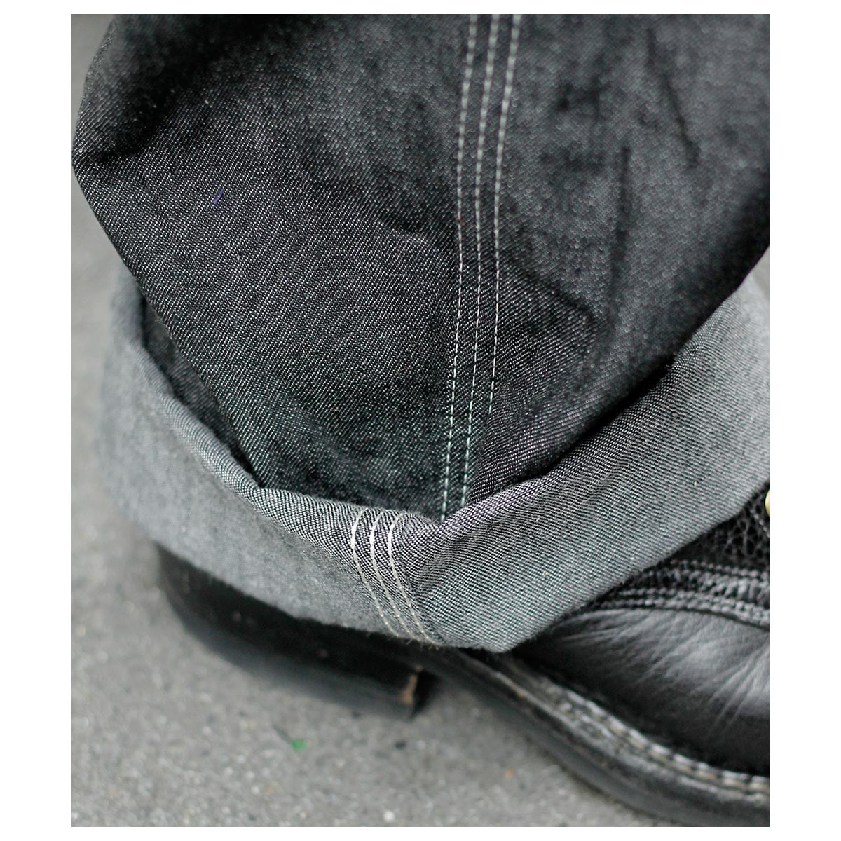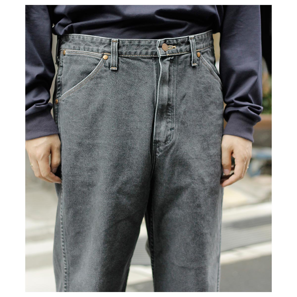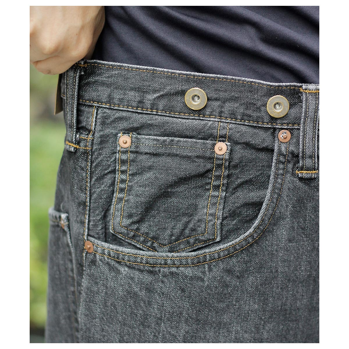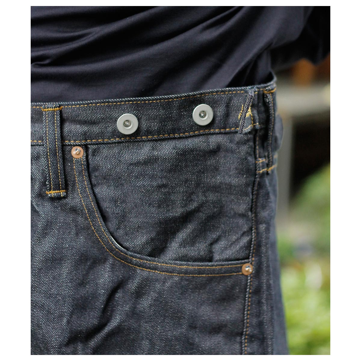 EDWIN「505」シリーズで使用のブラックデニムを採用。 ハリのある生地とブラックデニムらしい始まりの光沢感があり、インディゴとは違った締まりがあります。淡い色落ちが期待できます。