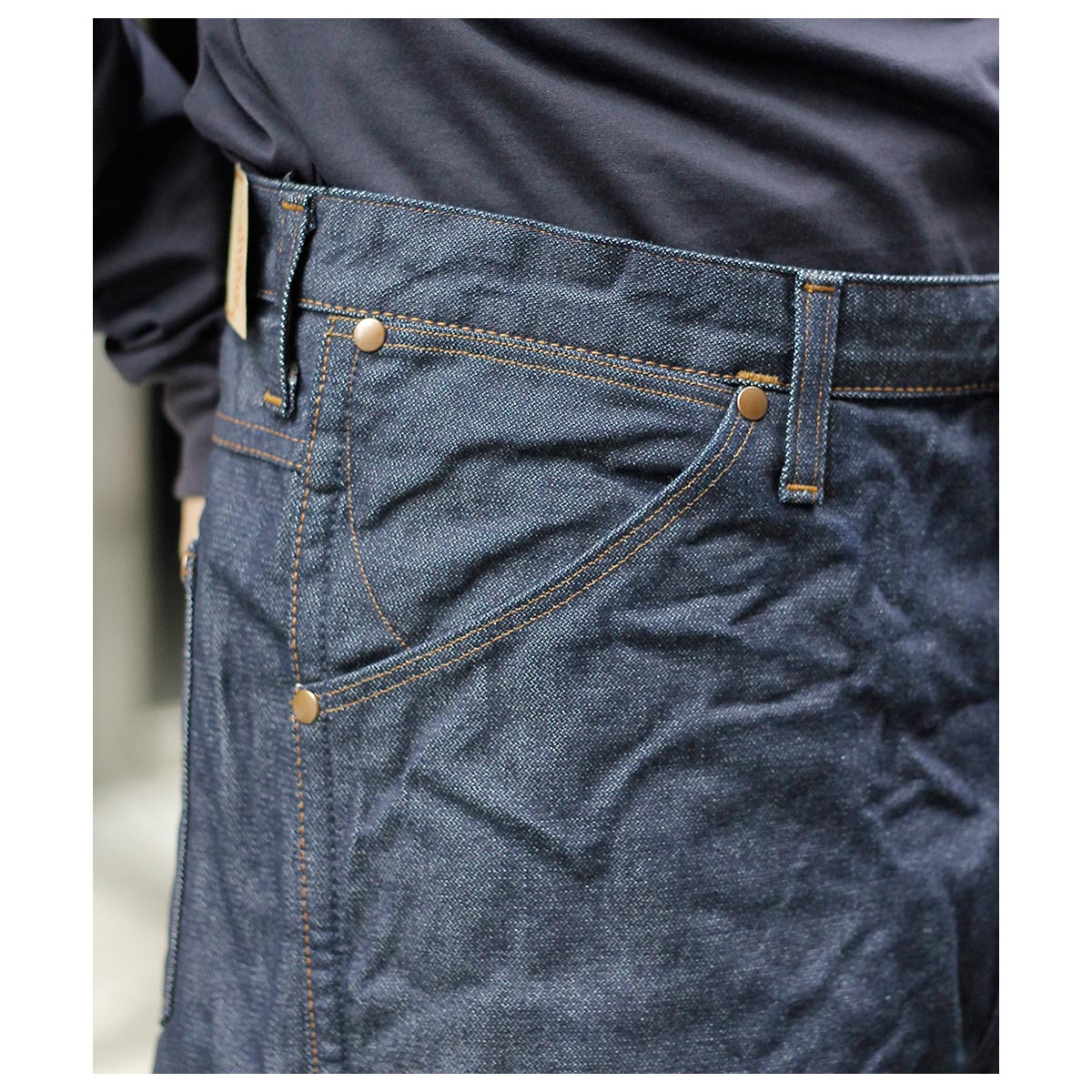 Wranglerは1971年に、それまで使用していた左綾デニムからブロークンツイルデニムに移行し、それまでデニムの欠点のひとつであった「ネジレ」を解消した。このデニムは後 に「no fault denim」と名付けられ、Wranglerブランドの個性となりました。 オリジナルファブリックの規格を分析し、染色濃度を高めたWranglerブランド専用のデニム素材。