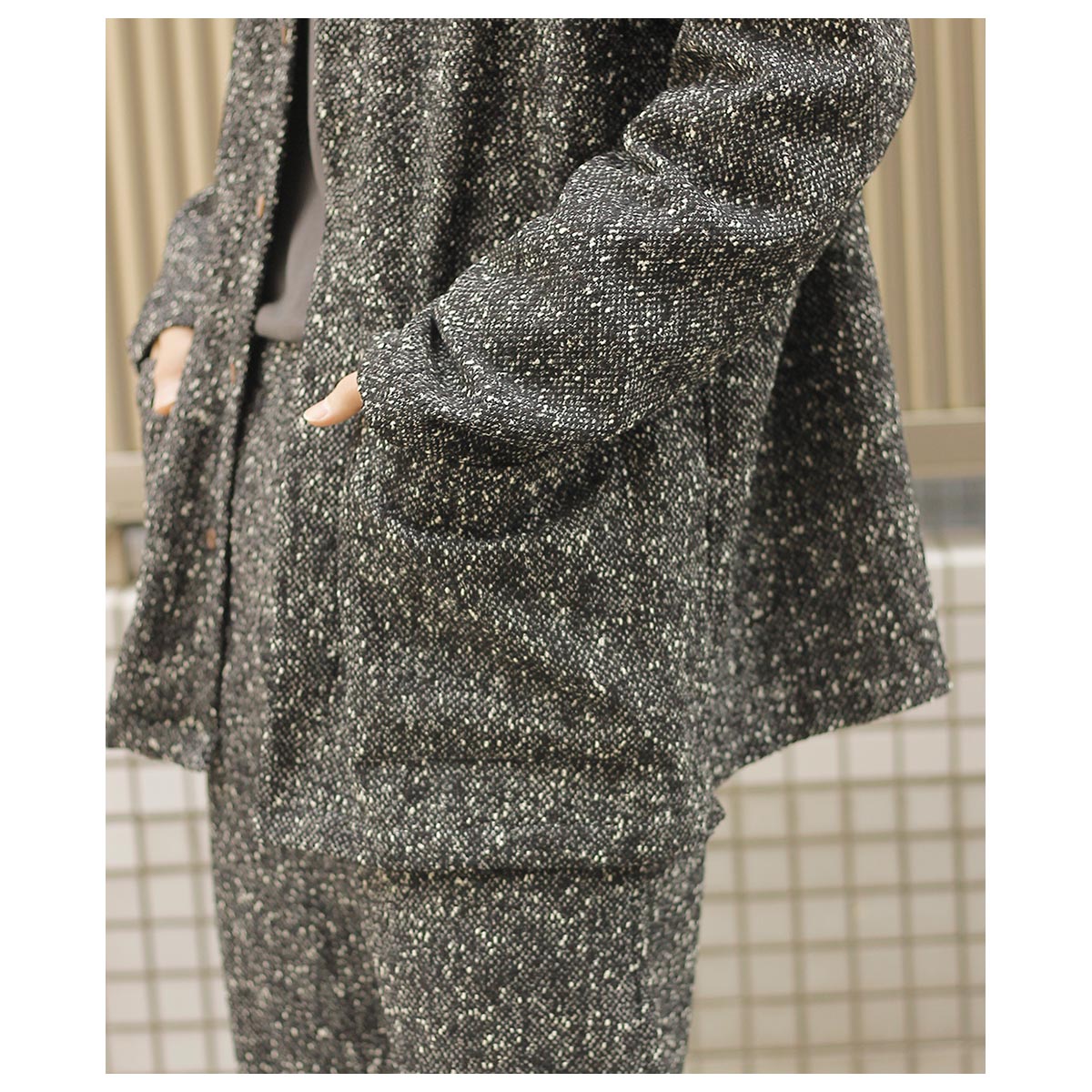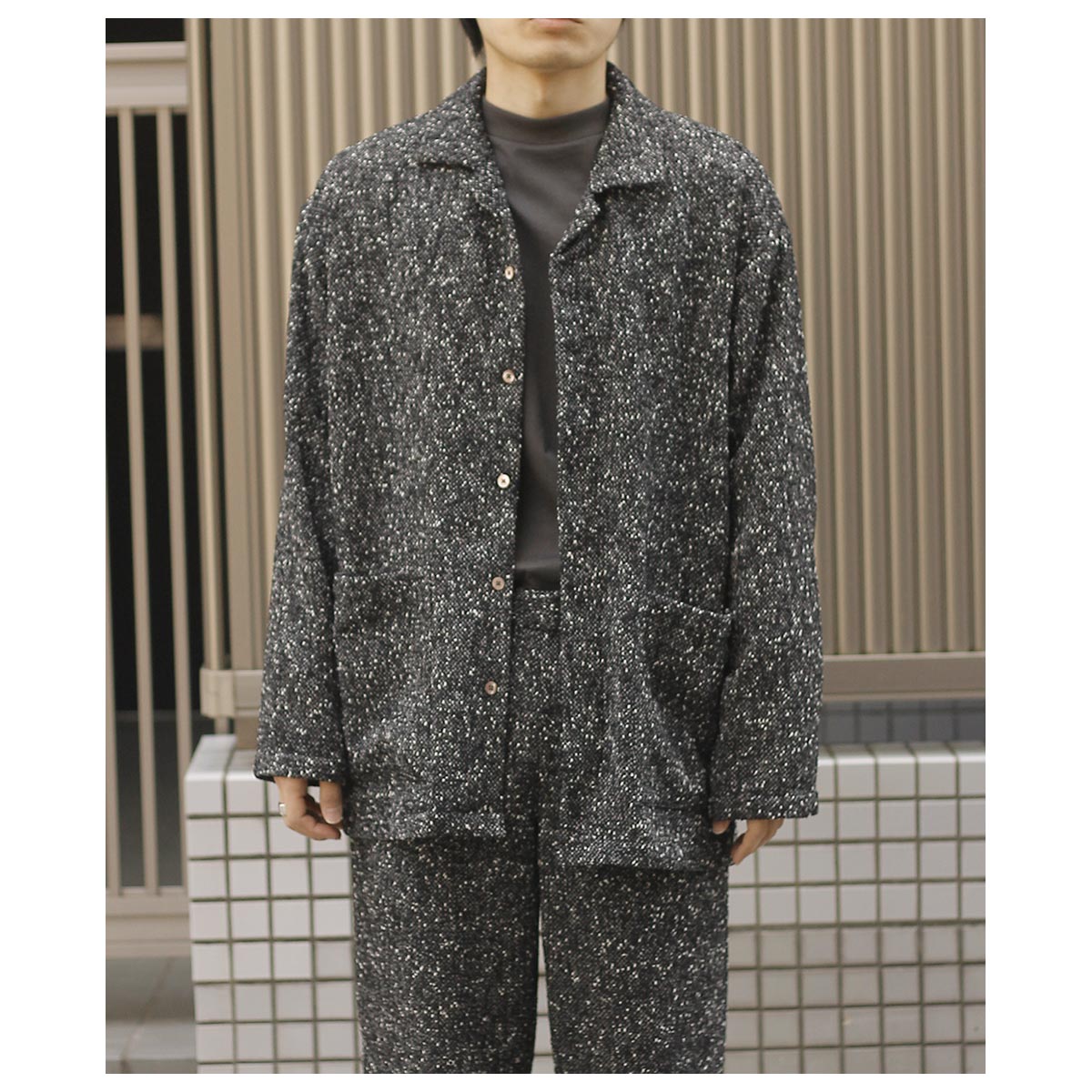 仏LVMHのデッドストックコレクションからピックした、ヴァージンウール主体のブークレツイー ド。 ブラック、ホワイト、グレーに染色した糸を何通りもの太さや凹凸をつけて紡績・撚糸。芯まで染められた糸で立体感を表現しつつ、ざっくりと織り上げました。 極めてドライタッチながら光沢感もある、いわゆる“ウールツイード”とは全く異なる生地です。