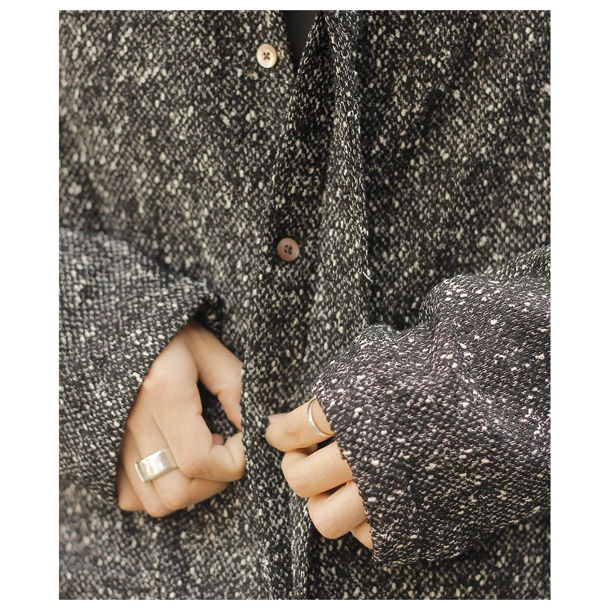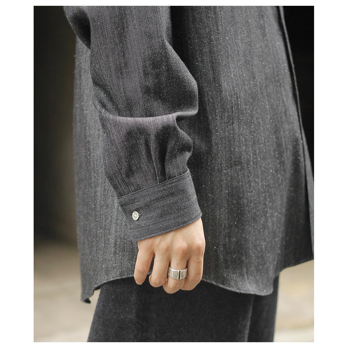 着丈・身幅ともにたっぷりととり、シャツコート感覚でも着用できる一枚仕立ててのシャツジャケッ ト。 前立ては比翼仕立て、後ろ身頃のヨークやダーツも排したシンプルなボディに、大きめのパッチポケットを付けました。比翼内側のボタンは、ごろつきがないよう薄めの貝ボタンを採用しています。 ミニマルですっきりとした仕様をベースに、サイ ドに配したスリットや、少しだけたゆませるようデザインされたポケットでさりげない動きをつけました。