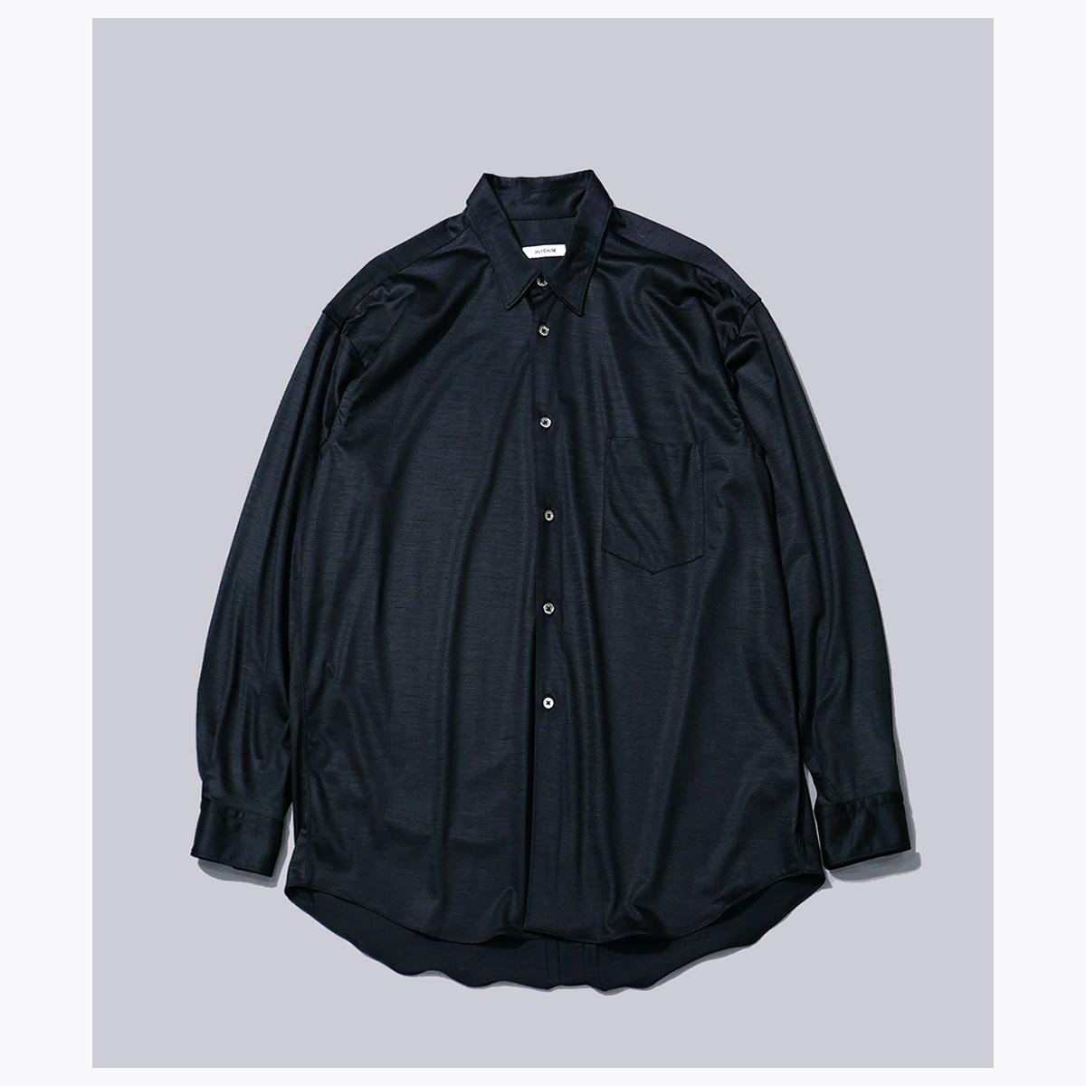 世界のモードを牽引するブランドの仏製シャツレーベルによる1990年代の名作に着想を得たレギュラーカラーシャツ。 身幅、着丈、アームホールをゆったりととったシルエットに小さめの襟を合わせ、タックイン・アウトいずれにもマッチするバランス感に仕上げま した。 国内のドレスシャツ専業工場で縫製し、細かな運針ながらピリつきのない仕立てを実現。前立てとカフスには、薄めの貝ボタンを採用しています。
