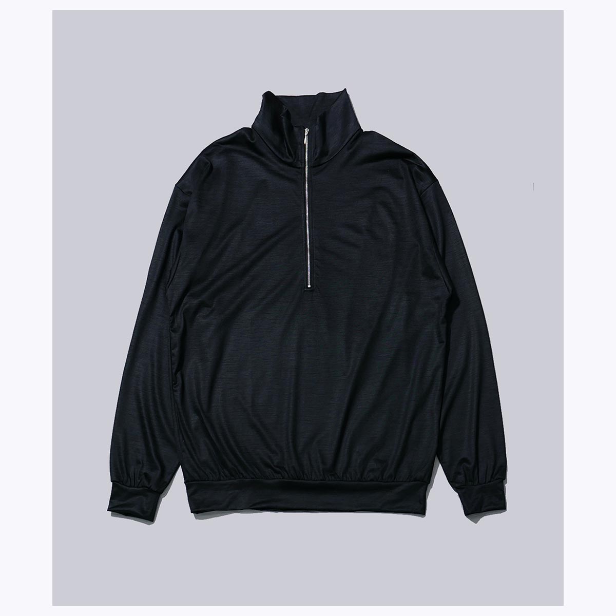 1990~2000年代初頭のいくつかの名だたるブラン ドの名作から着想して製作したハイネックのハー フジップカットソー。 しっかりと高さをとったネックに、かなり?めの ハーフジップを組み合わせることでデザインのアクセントにしました。ジッパーの開き具合によって様々な着方ができる一着です。 裾と袖口に共生地で切り替えを施し、裾巾を少し絞ることで1枚でもより違和感なく着用できるよう仕立てています。 身幅、肩幅は比較的ゆったりめに取り、生地の贅沢さを楽しめる寸法に設定しています。