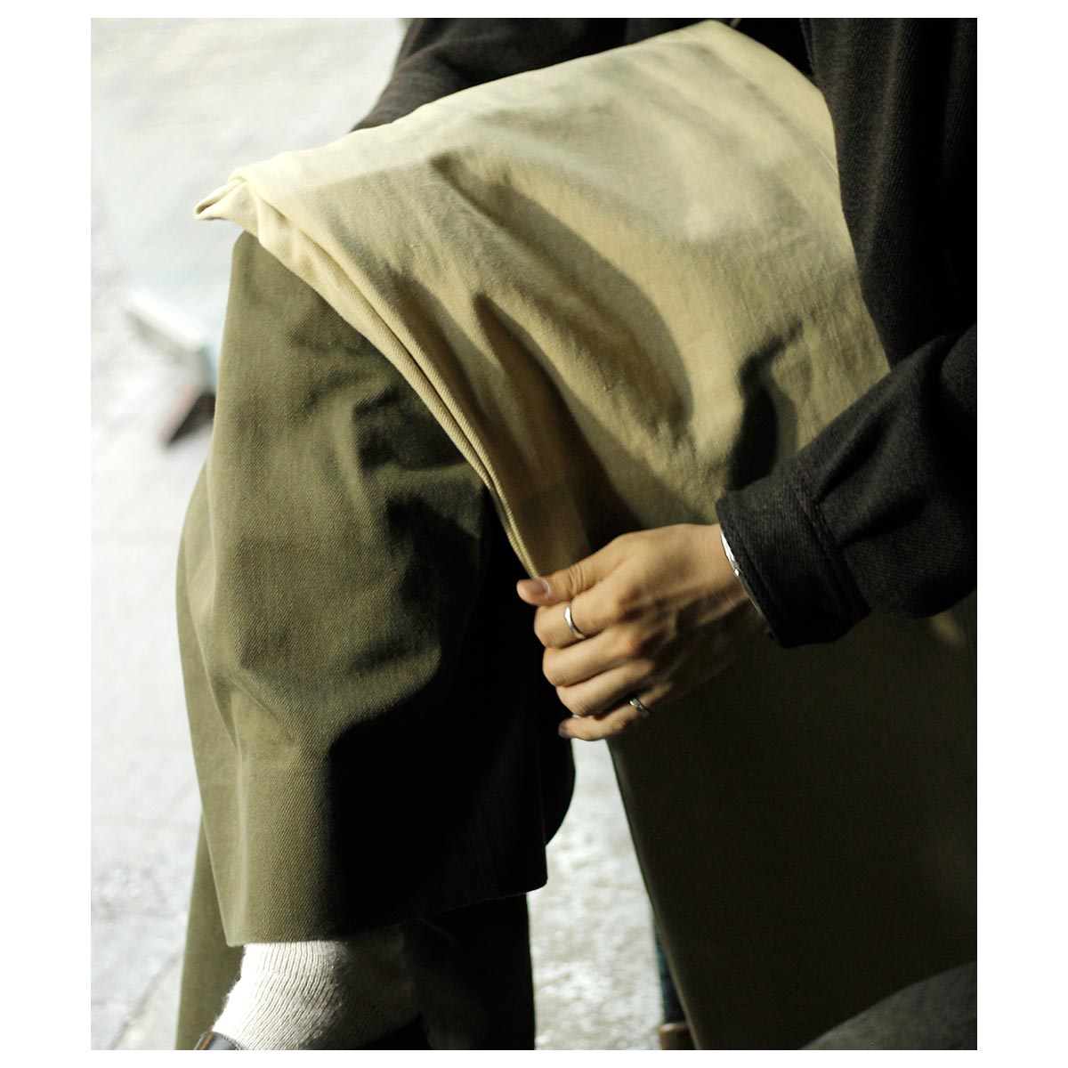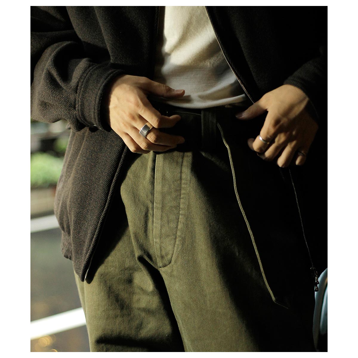 フランス軍モーターサイクルパンツを思わせる肉厚で粗めな生地でありつつM47初期型をイメージ して作られた綾織ヘビーコットンツイル生地を使用しています。