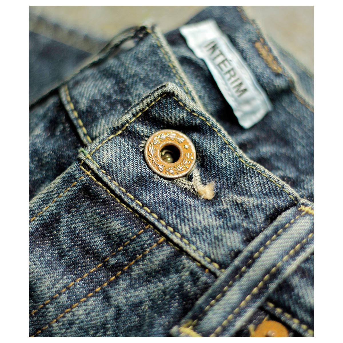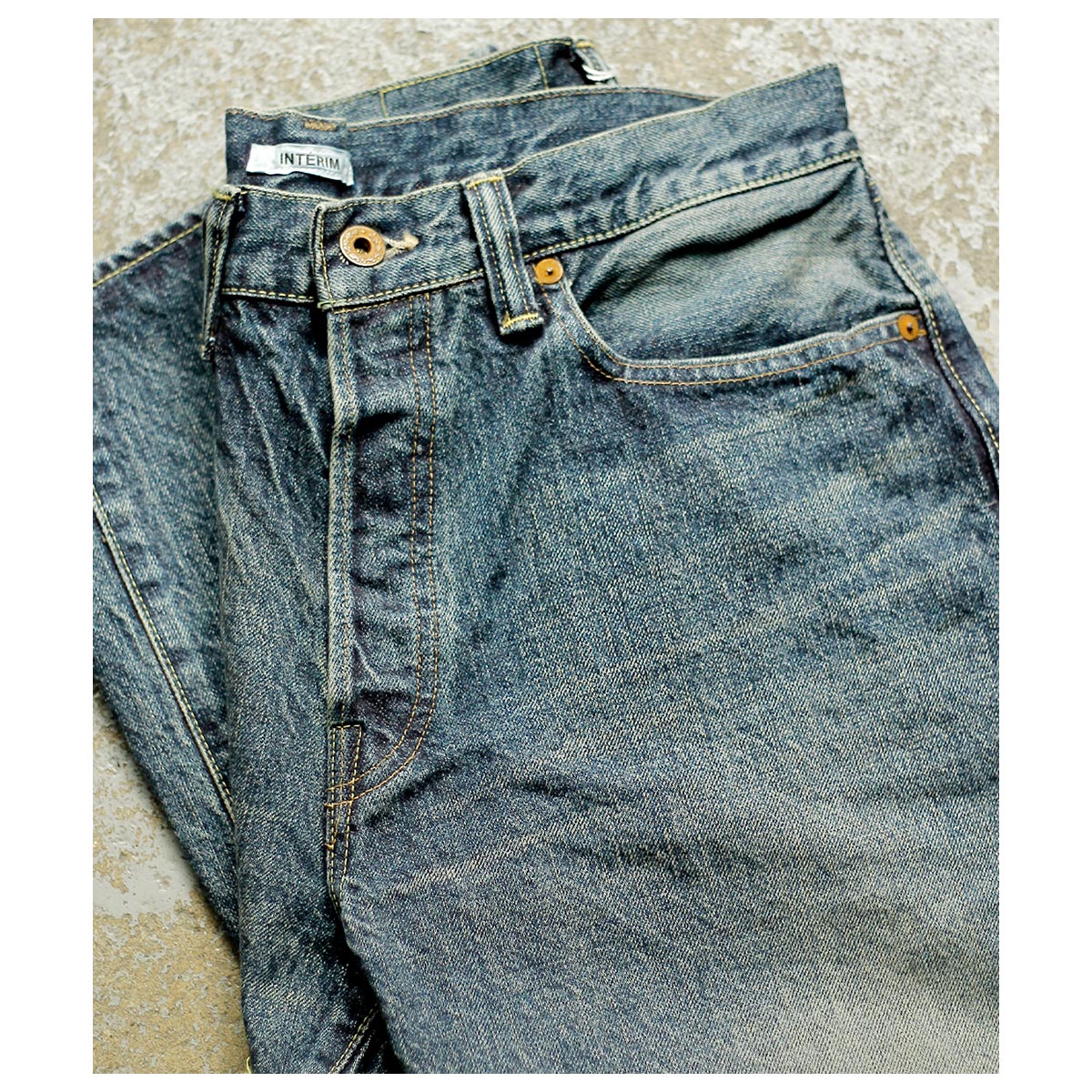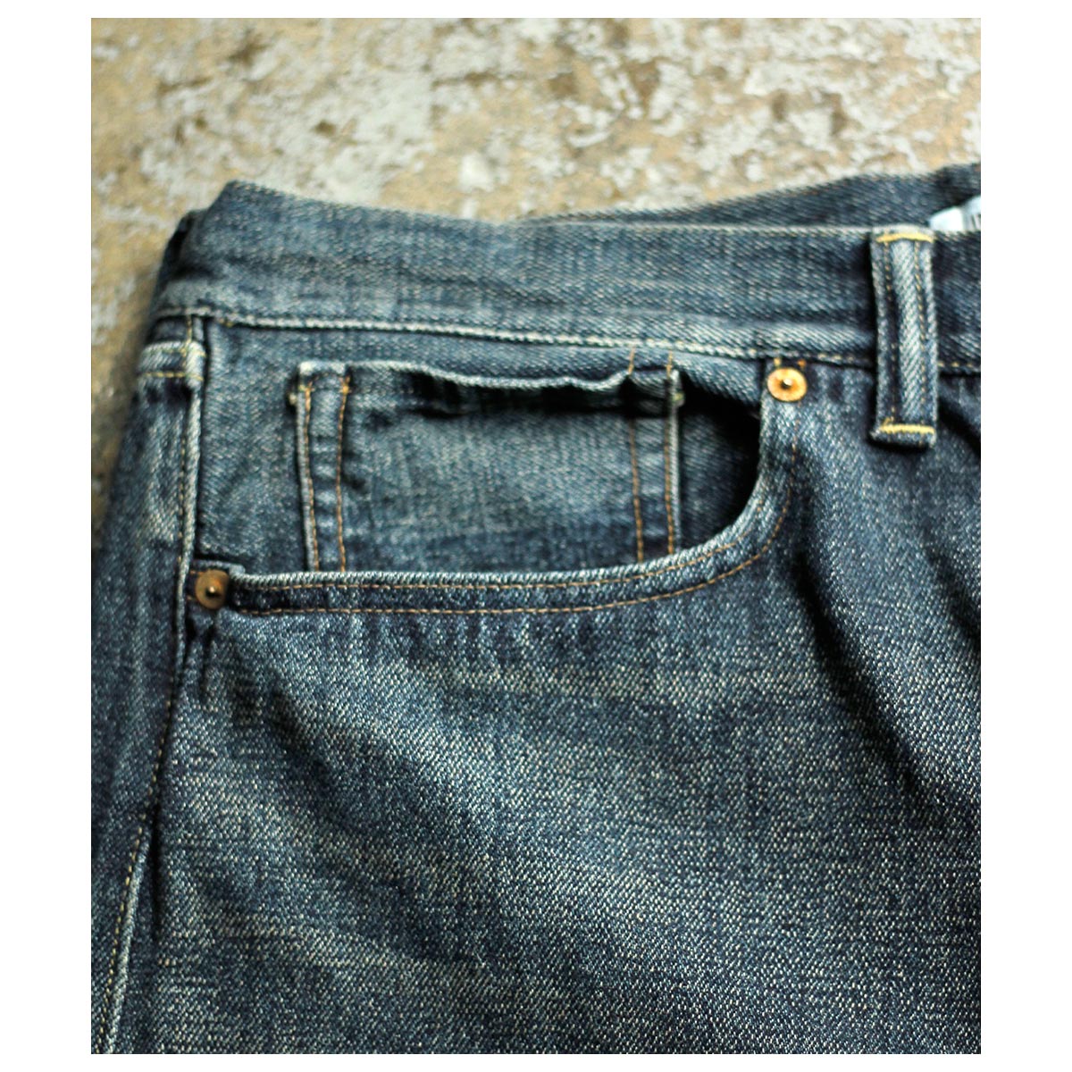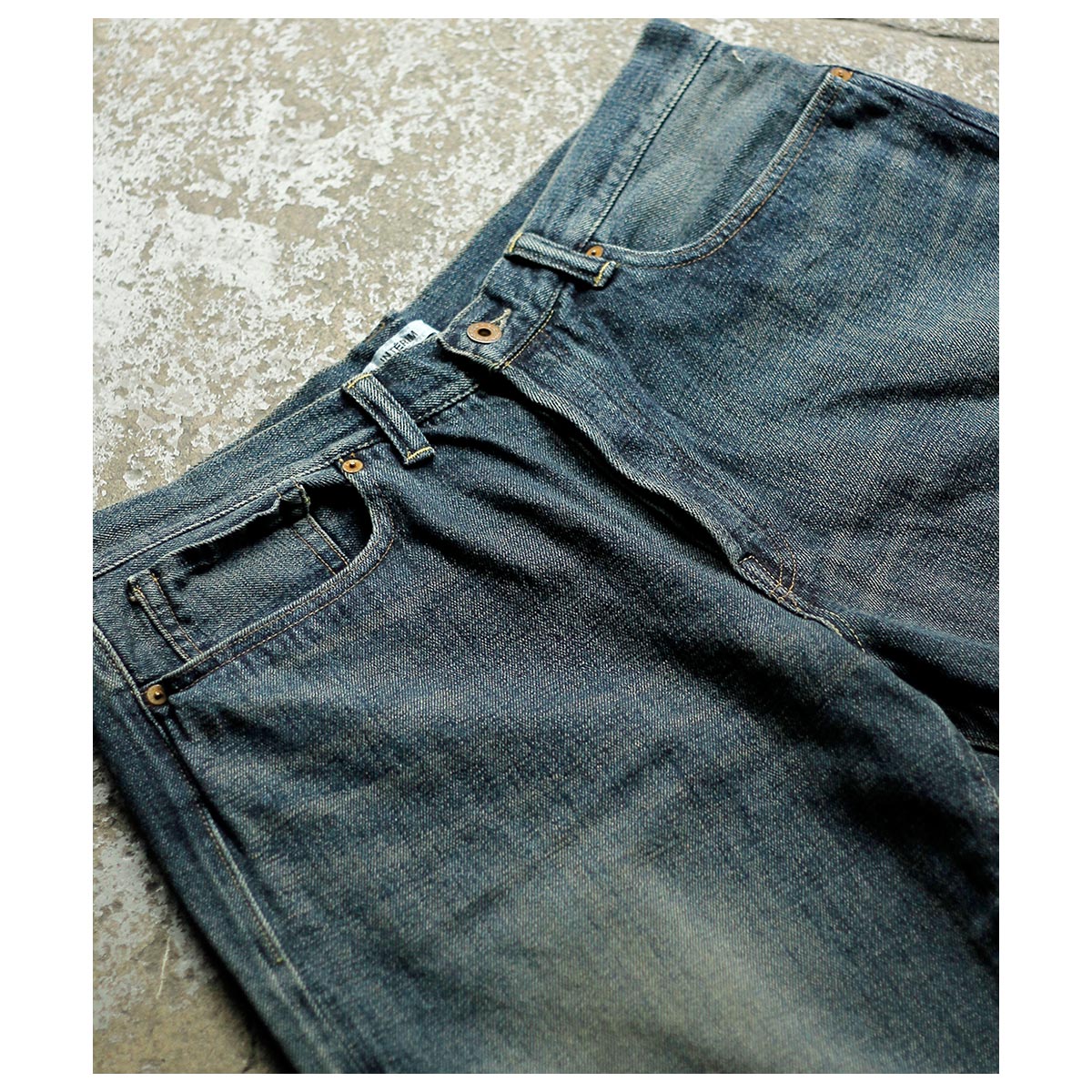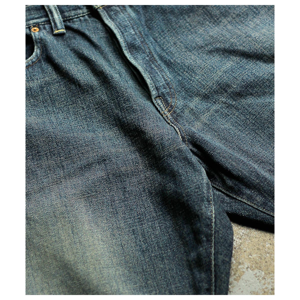 ヴィンテージの名作である大戦ジーンズをモチーフにした?本。 生地はヘビーオンスの?機デニム。前立てには鉄製の月桂樹ボタンとドーナツボタンによるボタンフライを採用しました。バックポケットの隠しリベット仕様やイエロー主体のステッチ、アソートのスレキなど、時代考証によるディテールを盛り込んでいます。元々の大戦モデルらしいシルエットを忠実にトレースしつつ、細かな寸法に微調整を入れています。