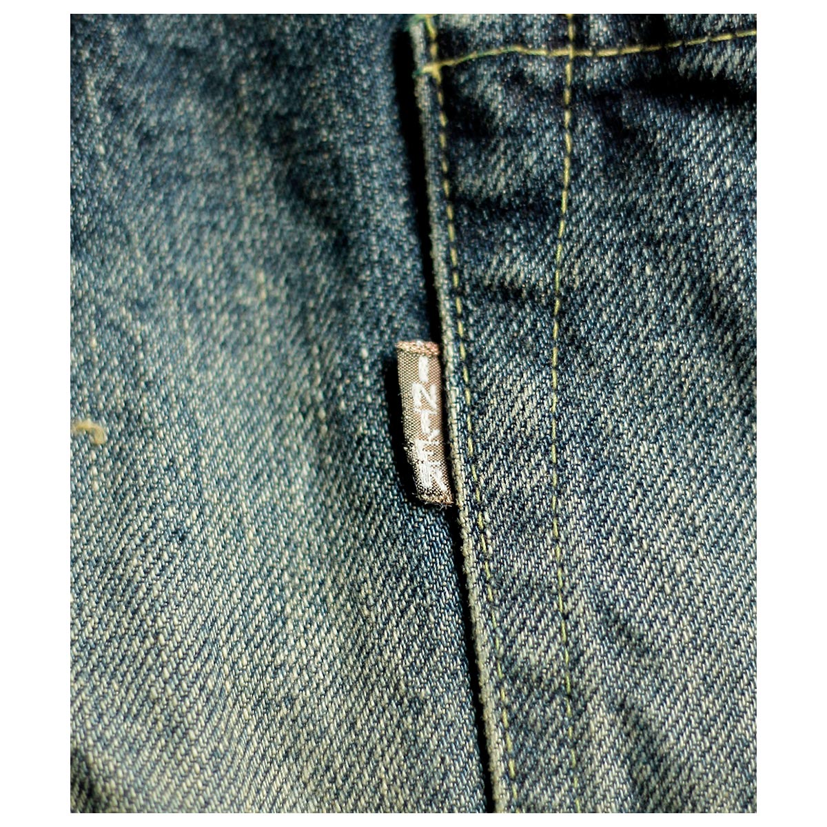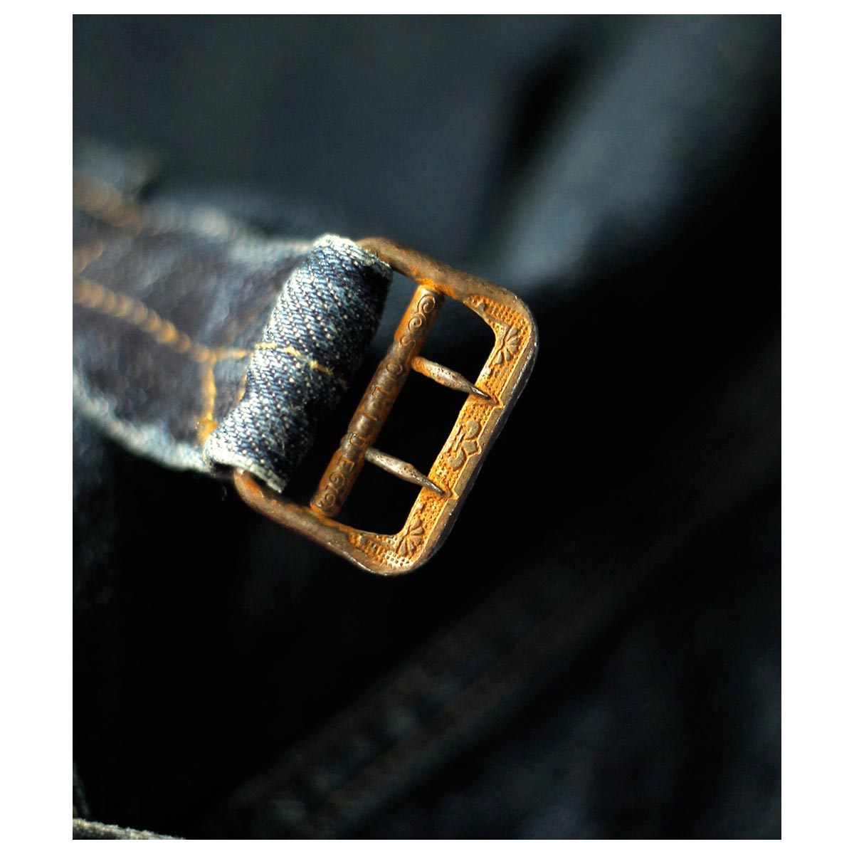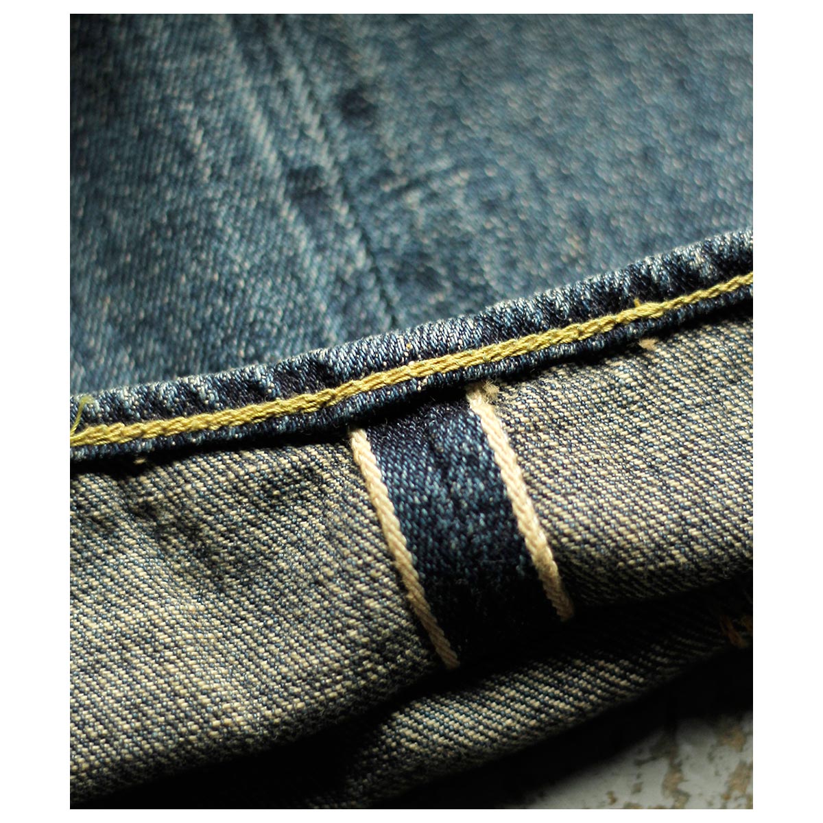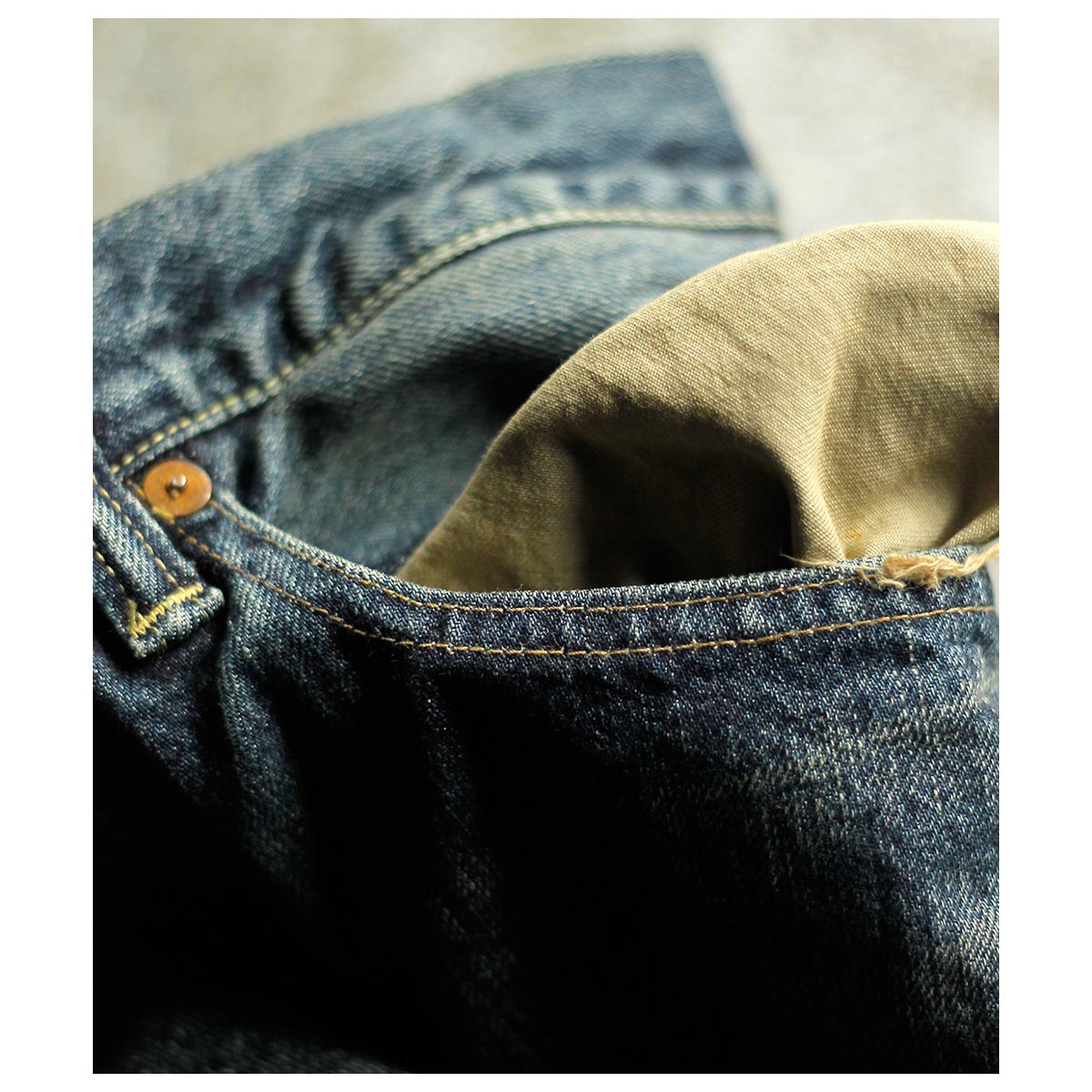 生地はヘビーオンスの生機デニム。前立てには鉄製の月桂樹ボタンとドーナツボタンによるボタンフライを採用しました。バックポケットの隠しリベット仕様やイエロー主体のステッチ、アソートのスレキなど、時代考証によるディテールを盛り込んでいます。元々の大戦モデルらしいシルエットを忠実にトレースしつつ、細かな寸法に微調整を入れています。