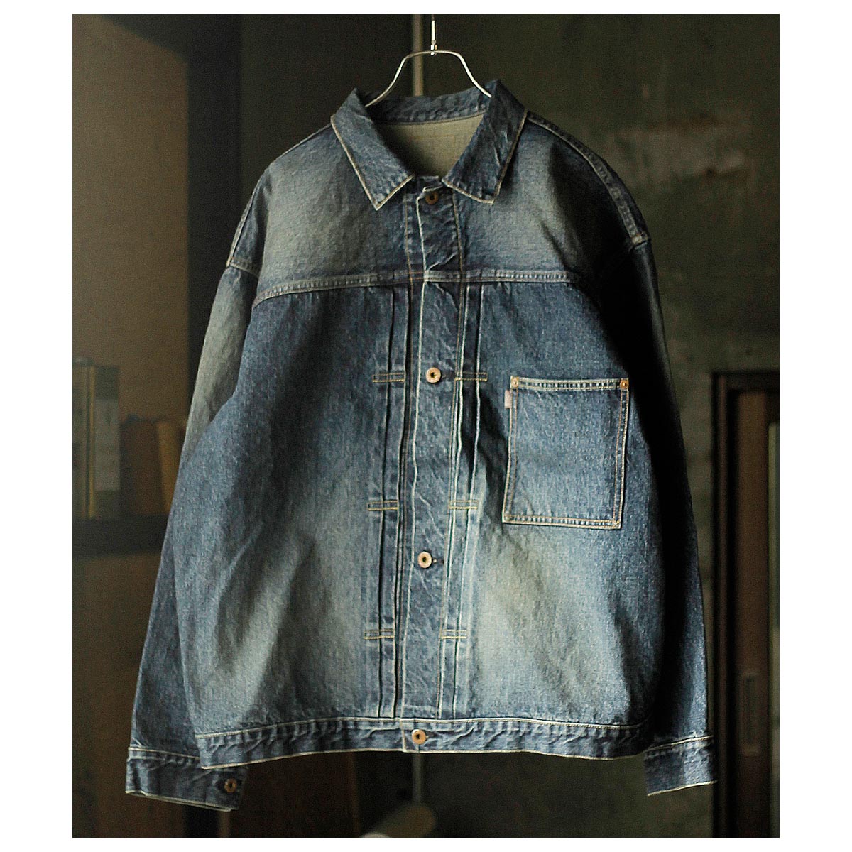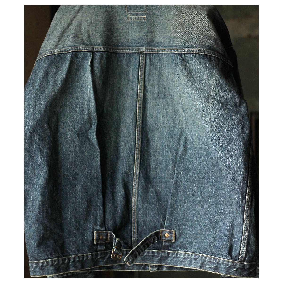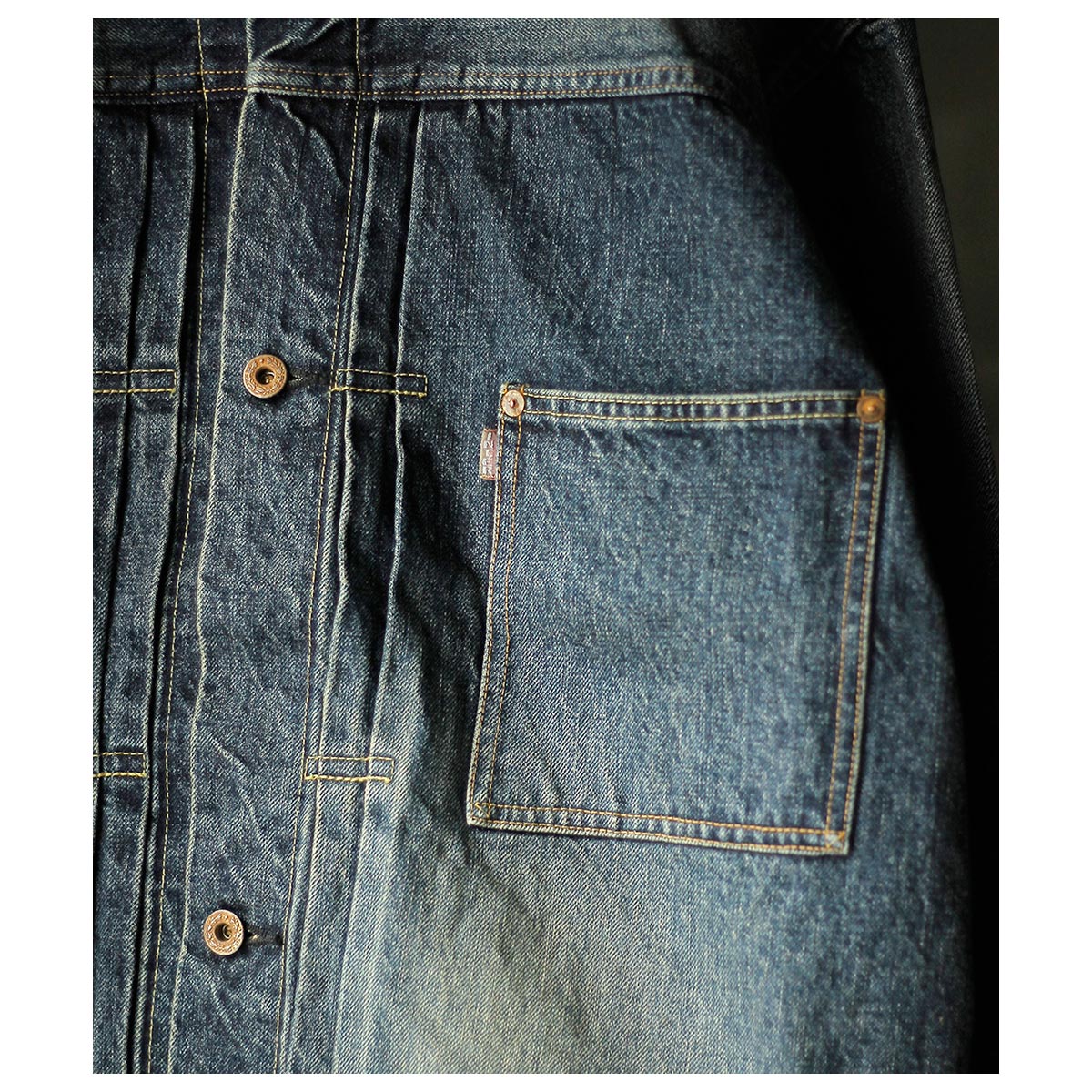 LEVI’S 501XXの上着として生まれた通称“1st”モデルの中でも、第二次世界大戦時、仕様を最小限に抑えて生産された“大戦モデル”をモチーフにしたデニムジャケット。極端に寸法を大きくとったハイパービッグサイズで製作しました。当時供給された生地巾の都合から大きなサイズにのみ採用された“Tバック”仕様を踏襲しています。 前立てとカフスには今では希少性の高い鉄ボタ ン、新たにシンチバックも鉄製ユリバックルを採用。四角形にアレンジしたポケットには、日本での作り手がほぼいないレーヨン100%、平織のピスネームを付けました。