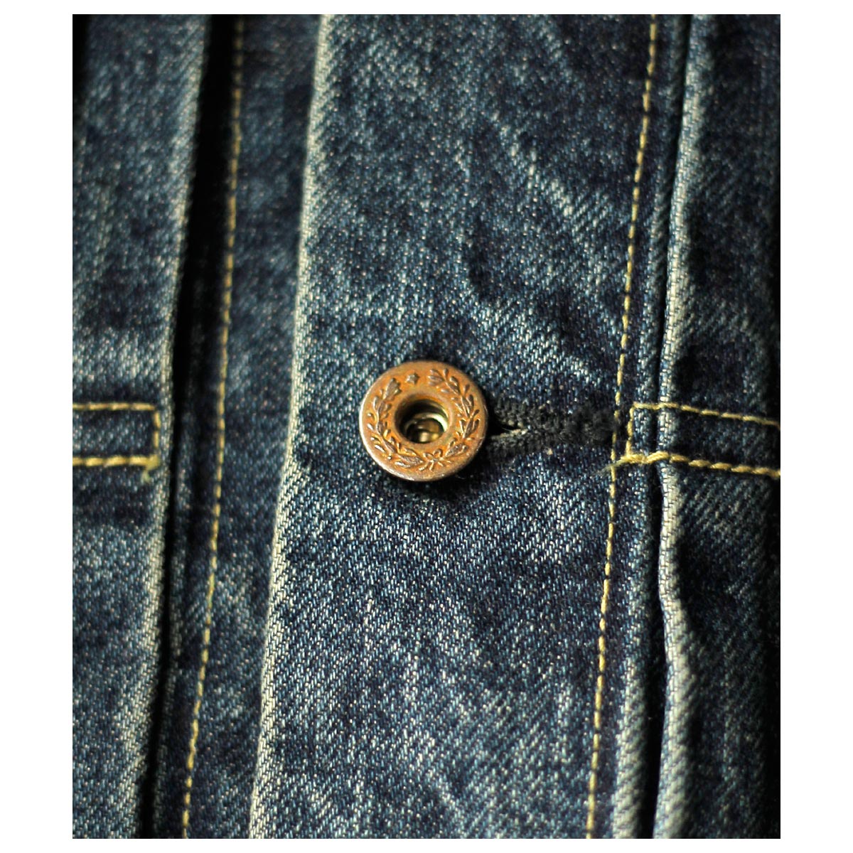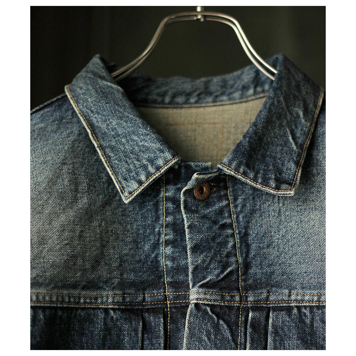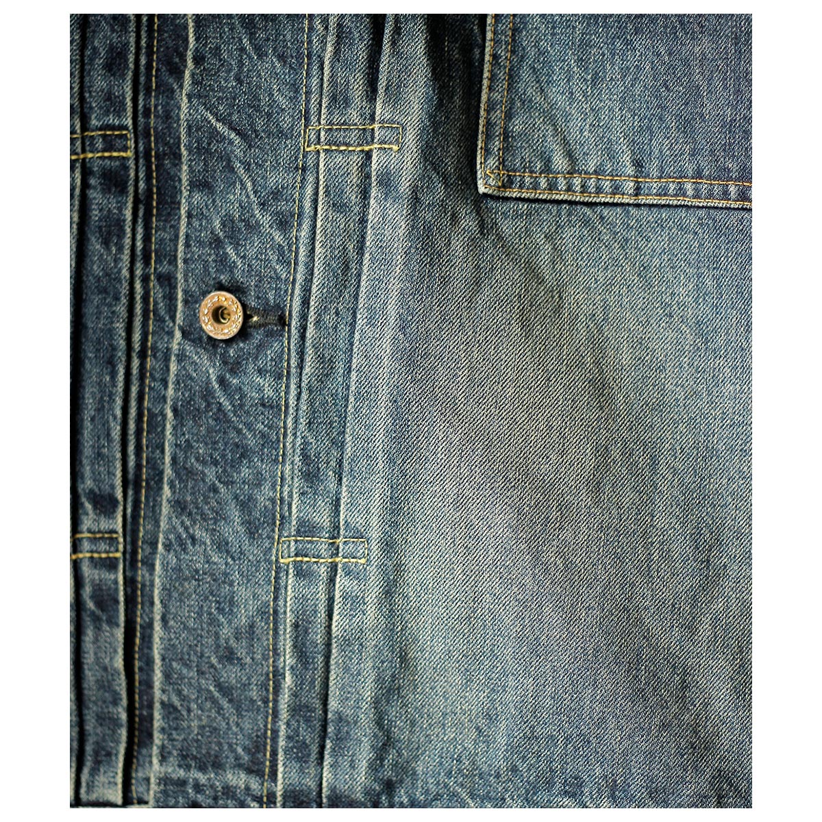 LEVI’S 501XXの上着として生まれた通称“1st”モデルの中でも、第二次世界大戦時、仕様を最小限に抑えて生産された“大戦モデル”をモチーフにしたデニムジャケット。極端に寸法を大きくとったハイパービッグサイズで製作しました。当時供給された生地巾の都合から大きなサイズにのみ採用された“Tバック”仕様を踏襲しています。 前立てとカフスには今では希少性の高い鉄ボタ ン、新たにシンチバックも鉄製ユリバックルを採用。四角形にアレンジしたポケットには、日本での作り手がほぼいないレーヨン100%、平織のピスネームを付けました。