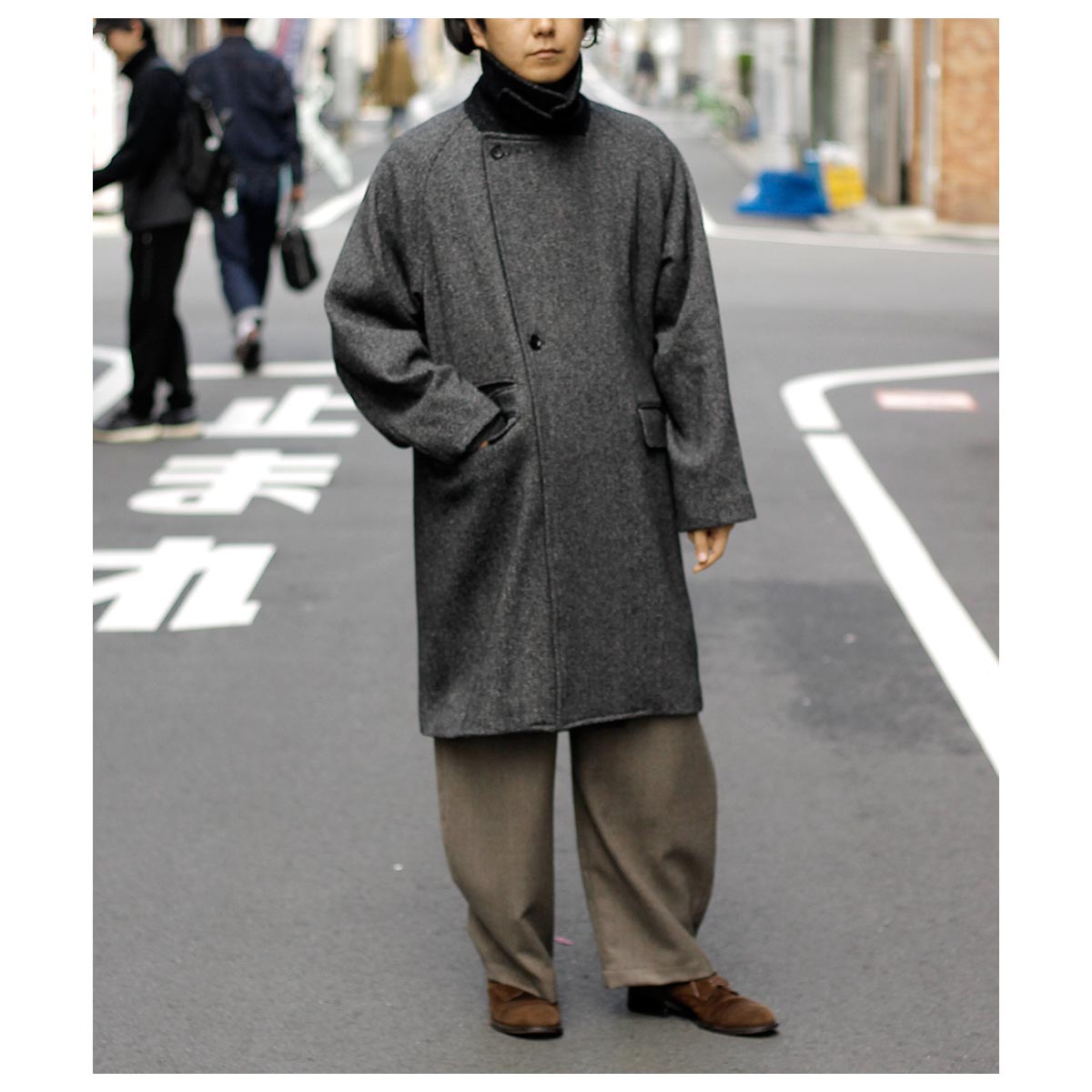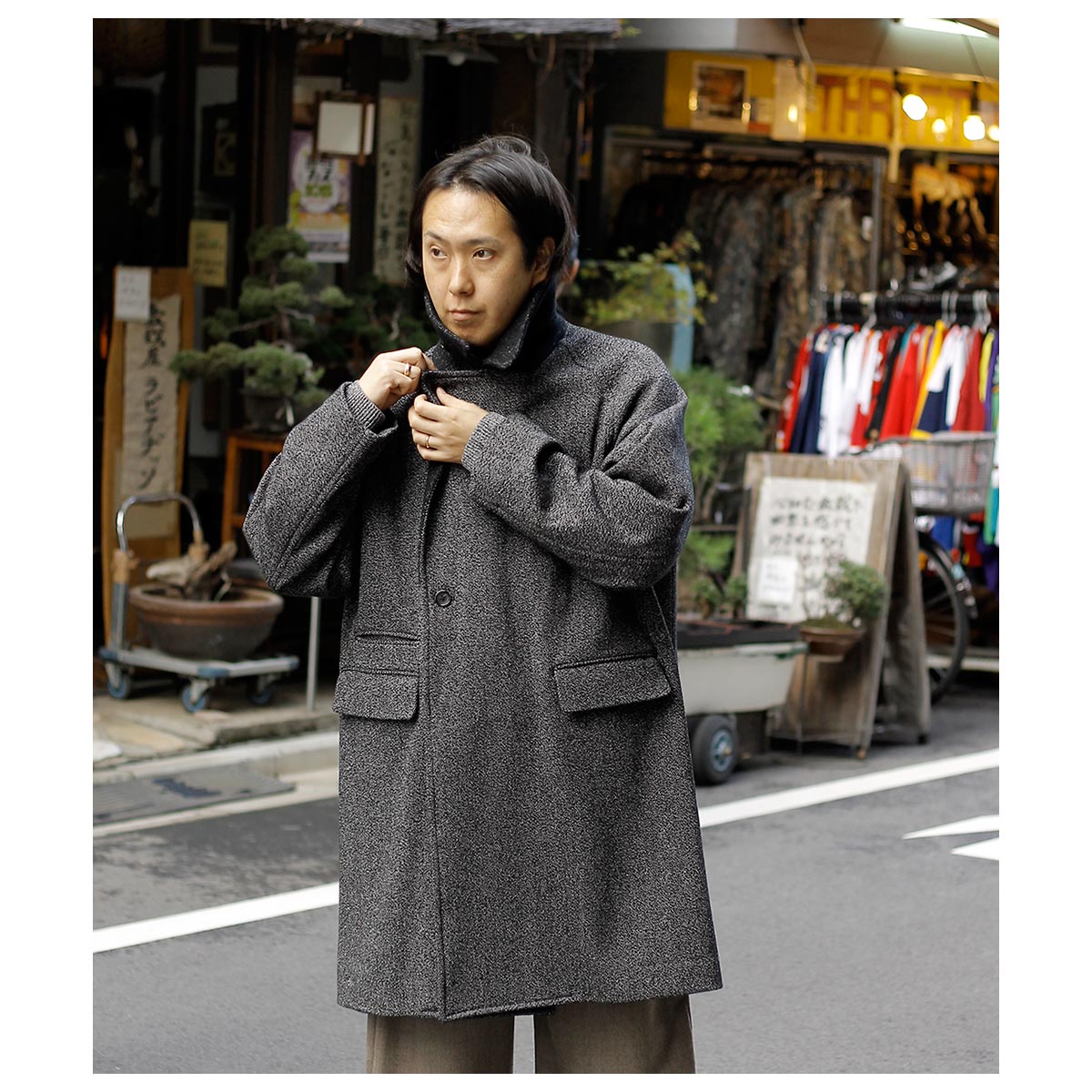 丈は膝上で、オンオフ問わずベーシックなフォルムで楽しめるシルエット。身幅とアームはたっぷりとゆとりがあり、中に着こんでも美しい佇まい。セーター一枚で着ると、生地の膨らみとドレープ感をより感じることが出来ます。