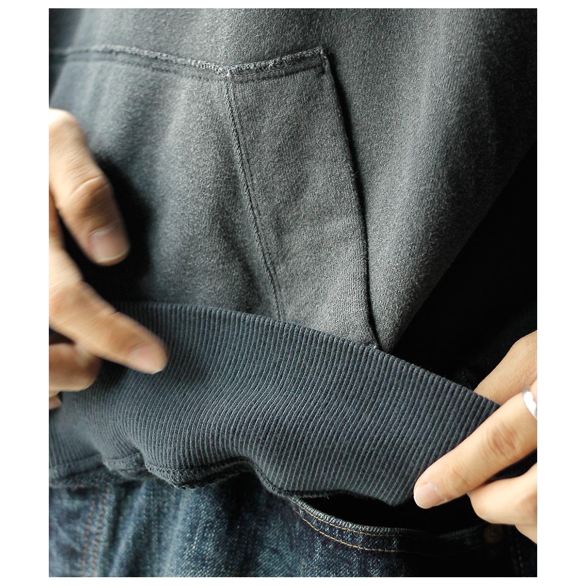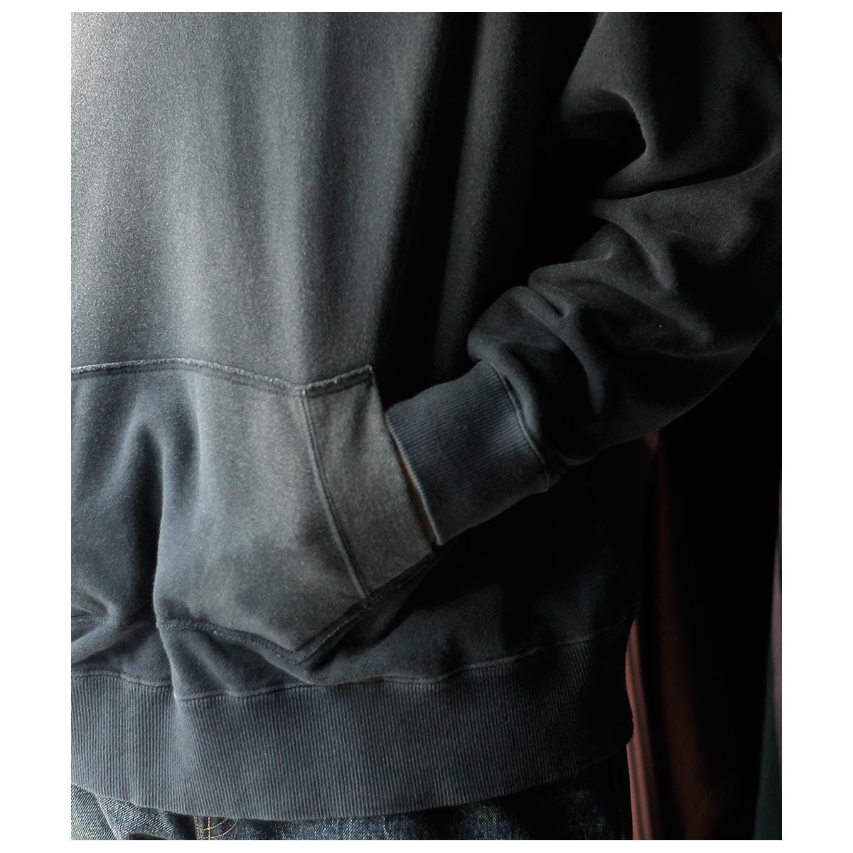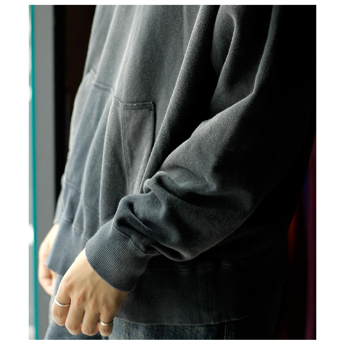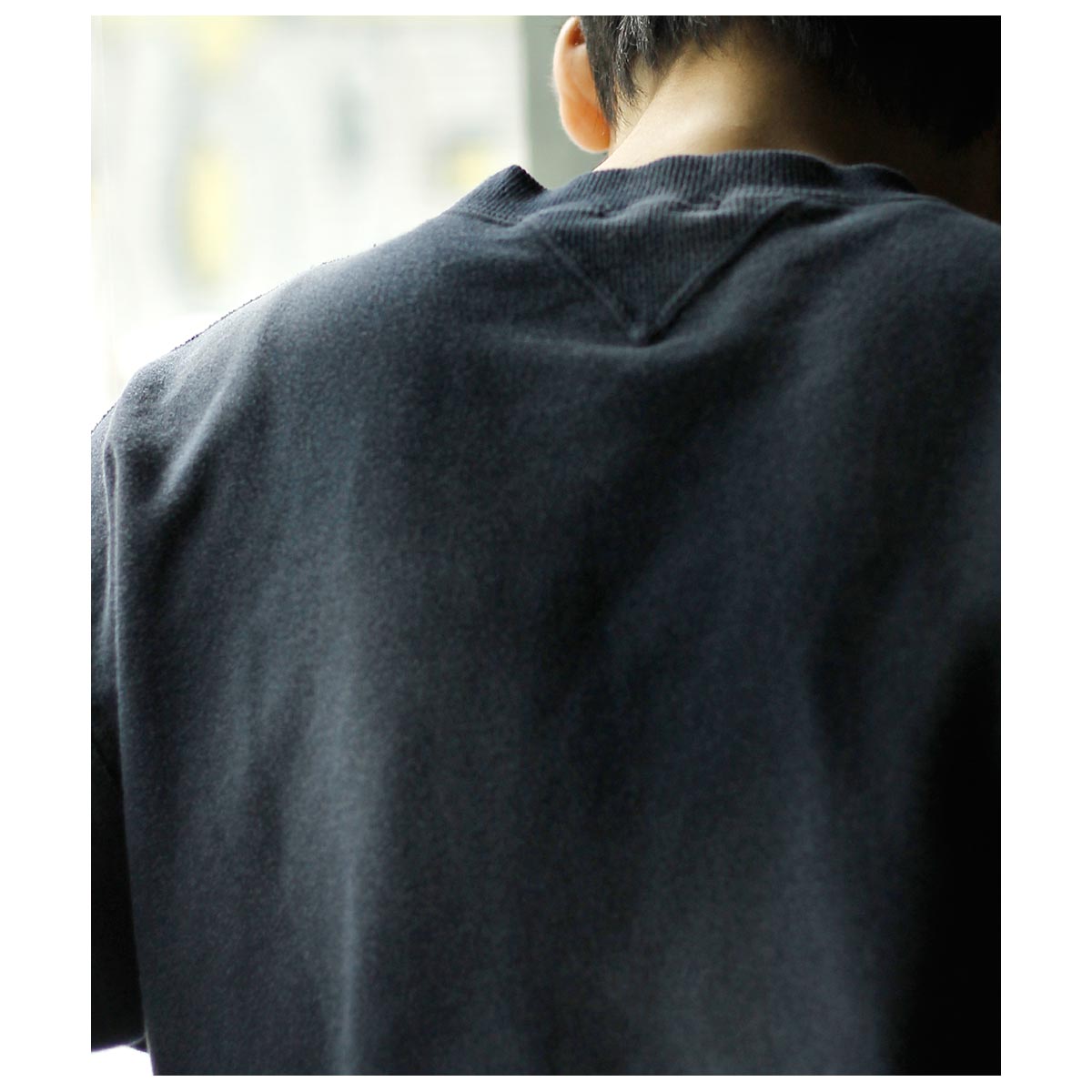 着古して着丈が少々縮んだスウェットのバランス感をイメージし、特に身幅をたっぷりと取った他、裾や袖リブを長めに、ネックリブをやや太めに設定しています。