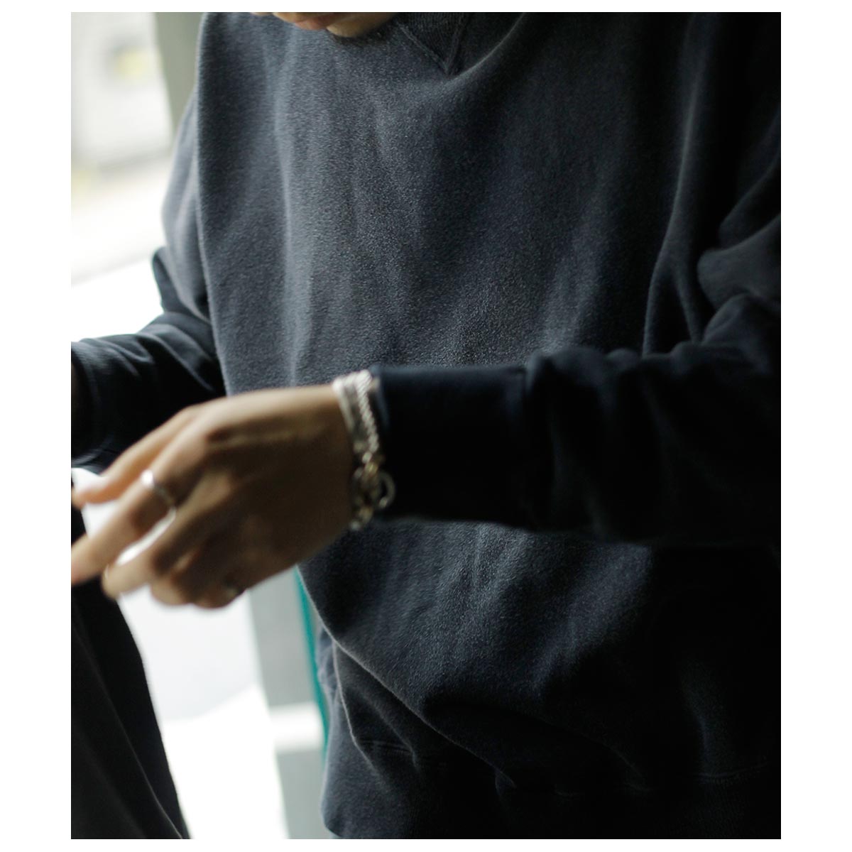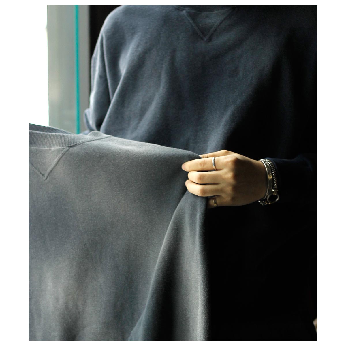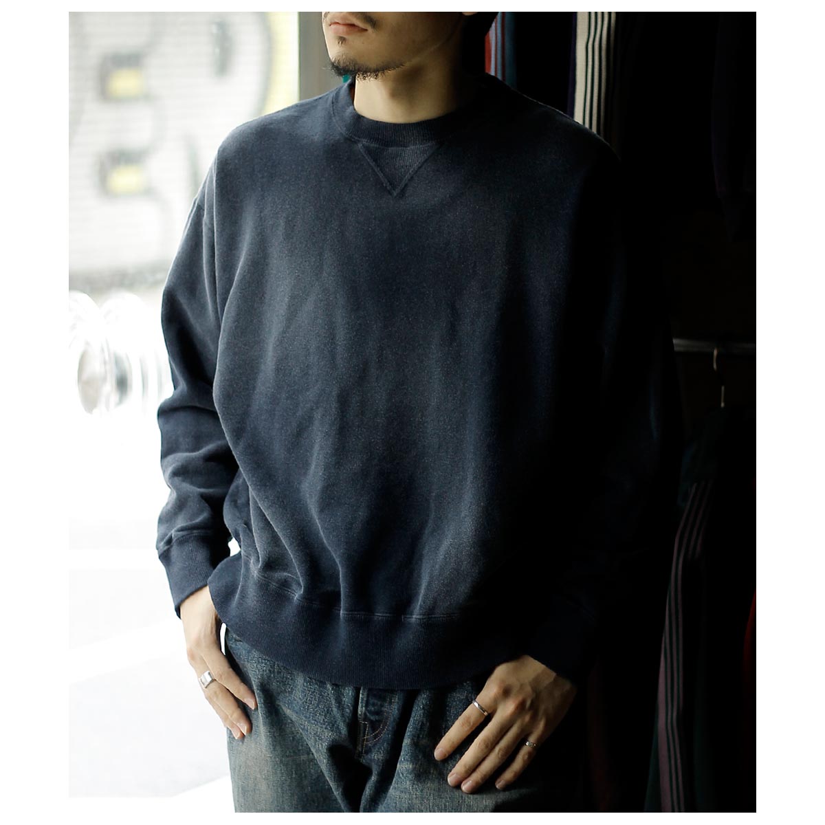 物理学者のアルベルト・アインシュタインが晩年に好んで着用していたスウェットから着想した、 両Vのスウェットシャツ。 着古して着丈が少々縮んだスウェットのバランス感をイメージし、特に身幅をたっぷりと取った他、裾や袖リブを長めに、ネックリブをやや太めに設定しています。