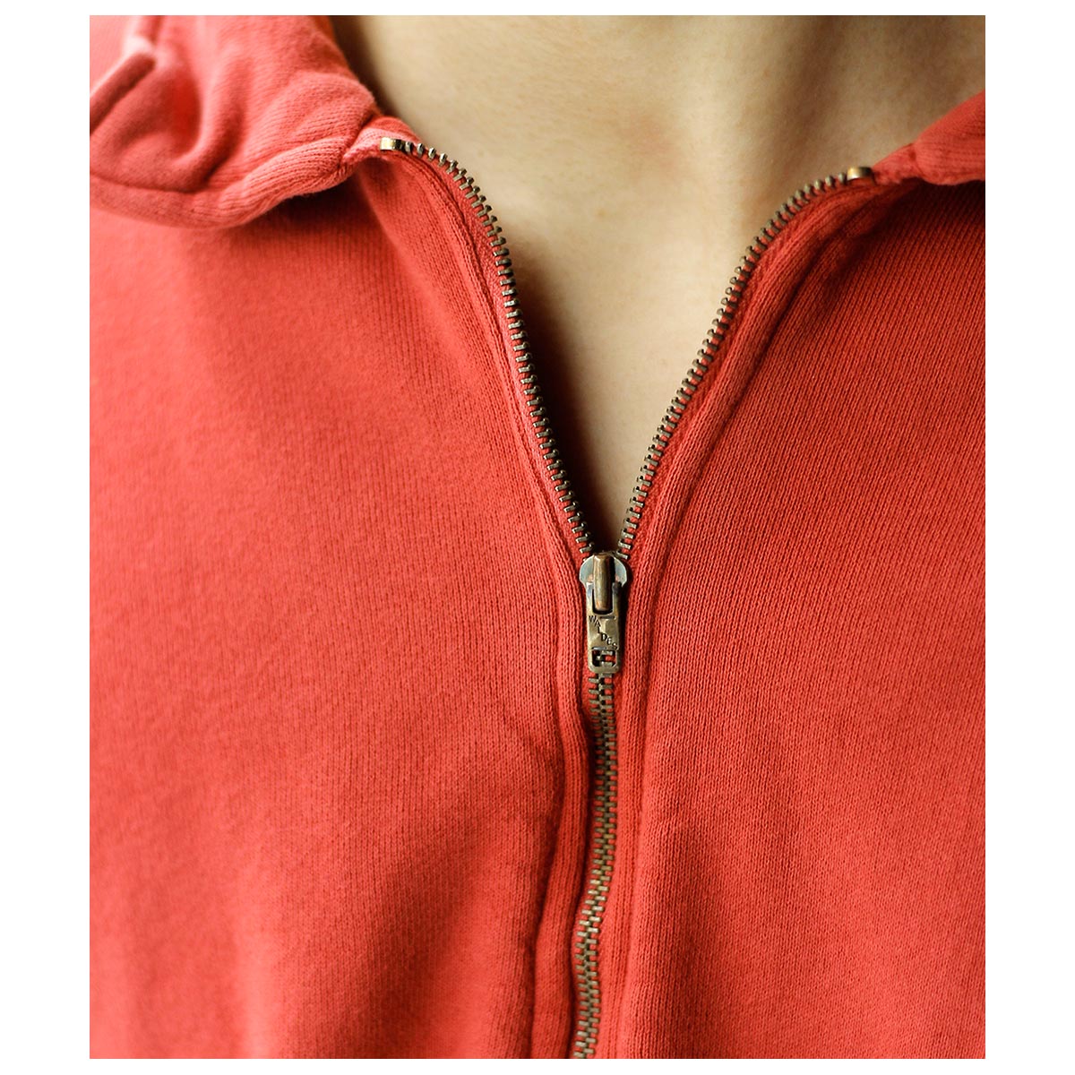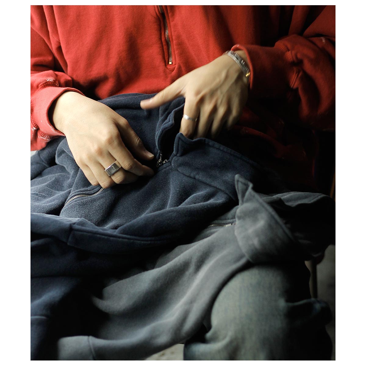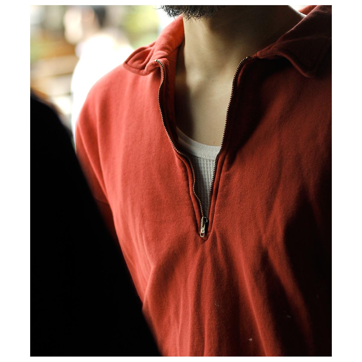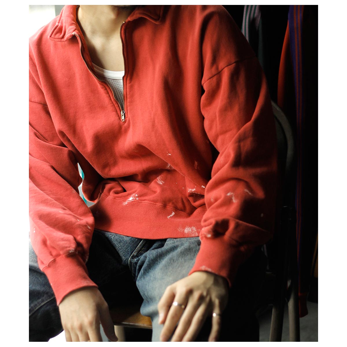 1950年代J.C.ペニー社製のスウェットの中でも貴 重な個体であるキッズサイズの襟付きハーフジッ プスウェットシャツをベースに、インテリムらしいサイズ感にチューニングしました。しっかりと長さを持たせた袖と裾のリブやフラットシーマでの縫製、WALDESの復刻ジッパーなど、ヴィン テージらしい仕様を数多く盛り込みました。