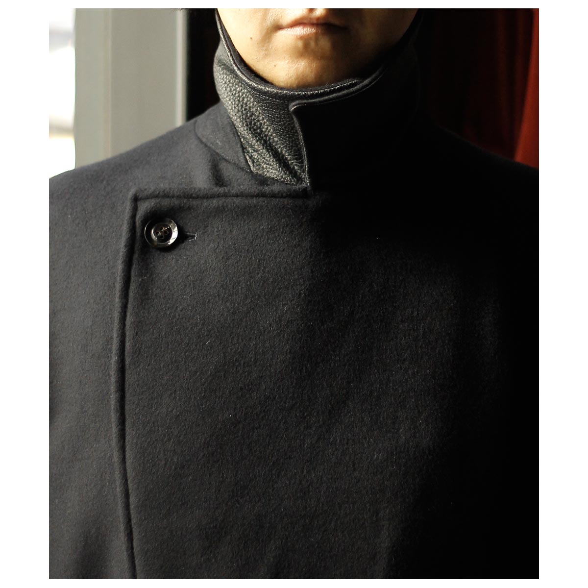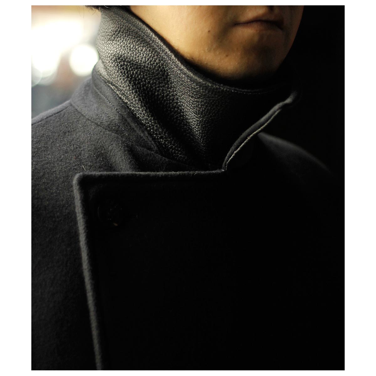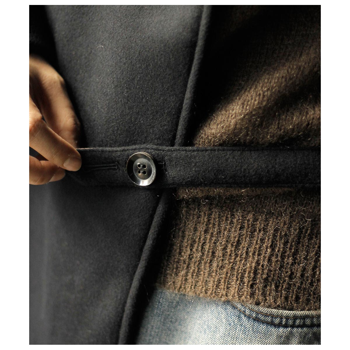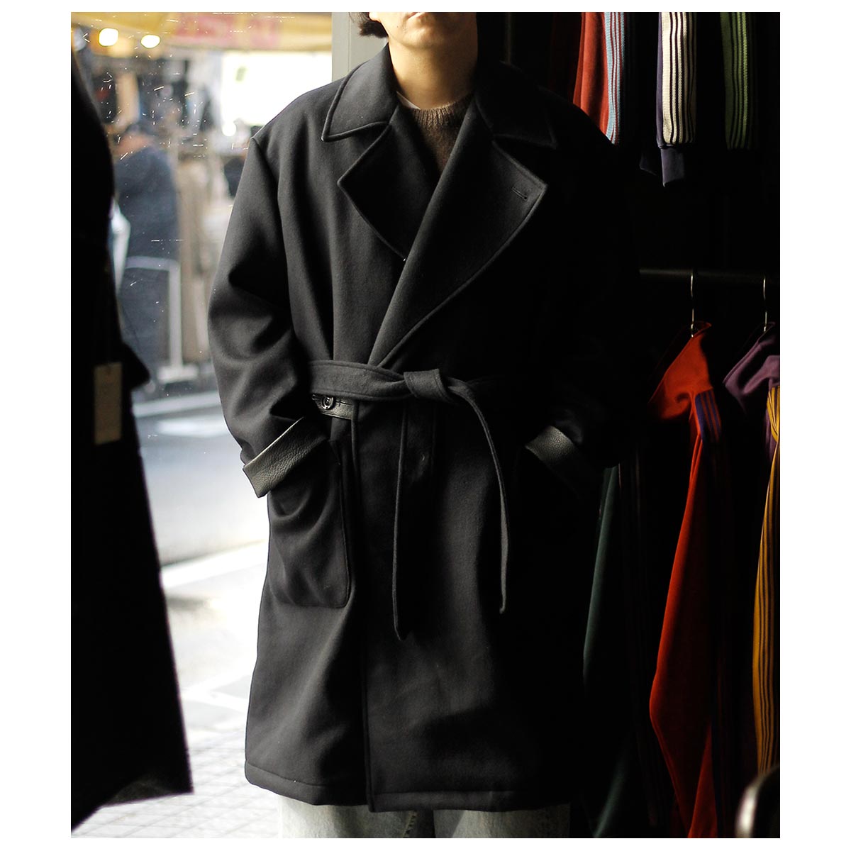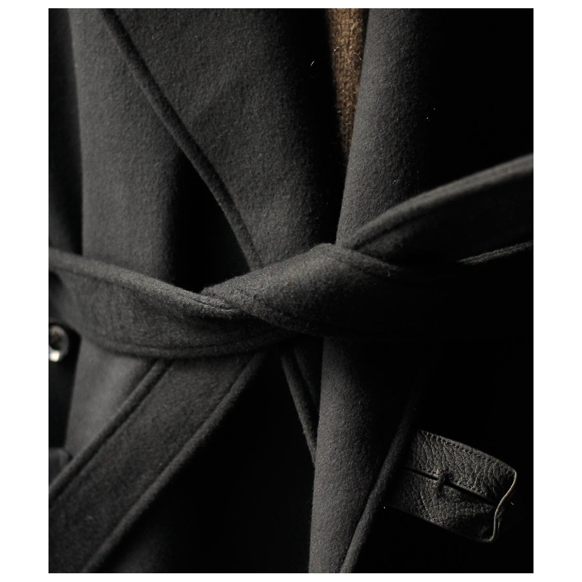 ラフに羽織ことも、かっちり着こなすことも可能なヴィンテージガウンをモチーフにしたラップコートをデザイン。 ルックでも二人のモデルに2通りのコーディネイトをいたしました。大きめな襟、ダブルの前見頃の大分量を生かした動きのあるラフな着こなし、そしてすべてのボタンを閉めかっちりまとめるとミリタリーを思わせる端正な顔立ちとなります。ウエストを止めるレザーダブはエルメス傘下のタンナー、デュピュイ社カーフを使用。