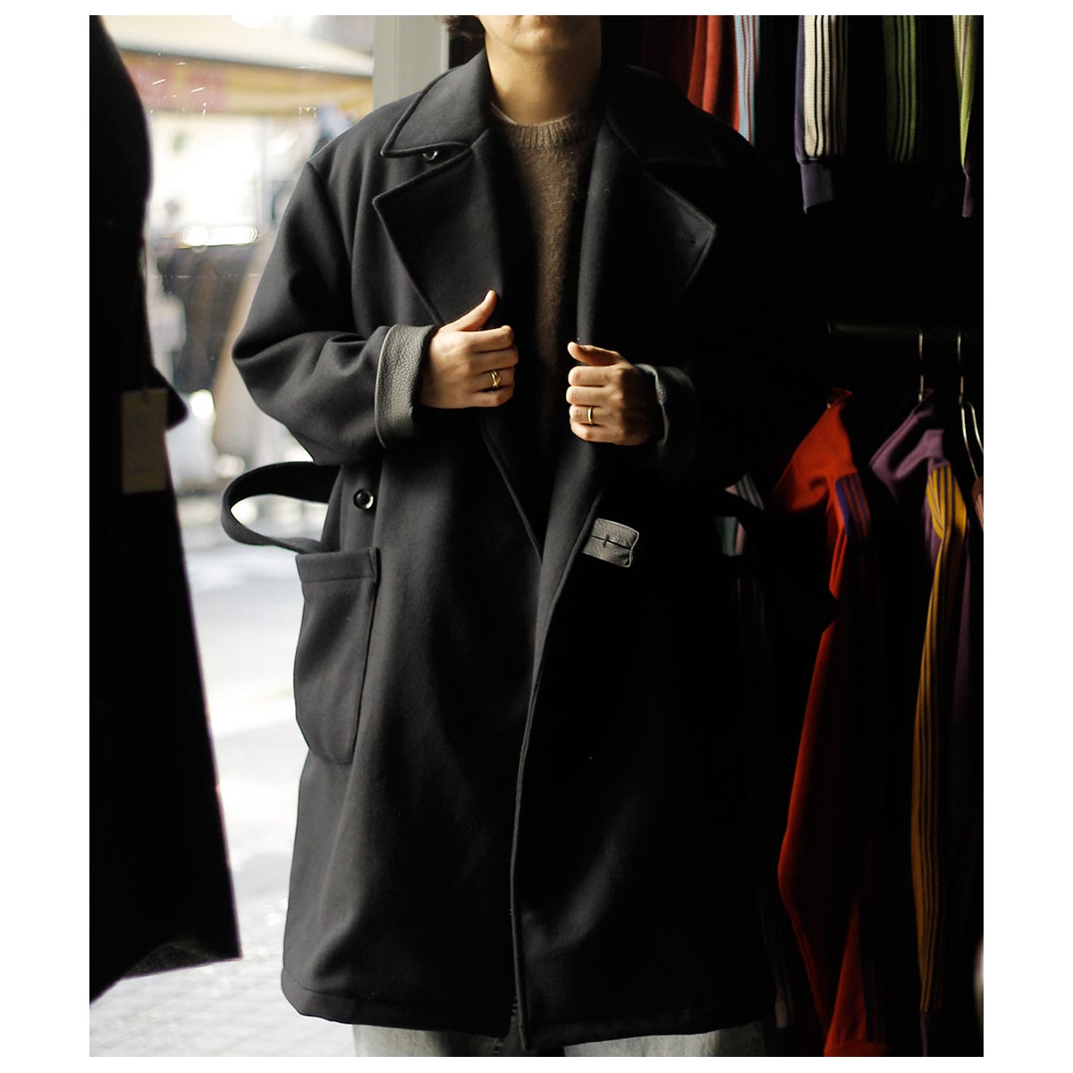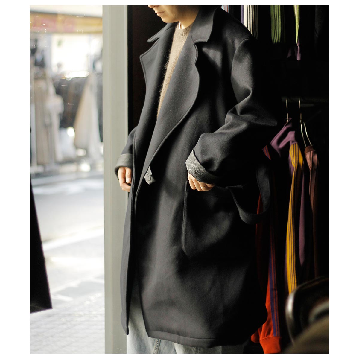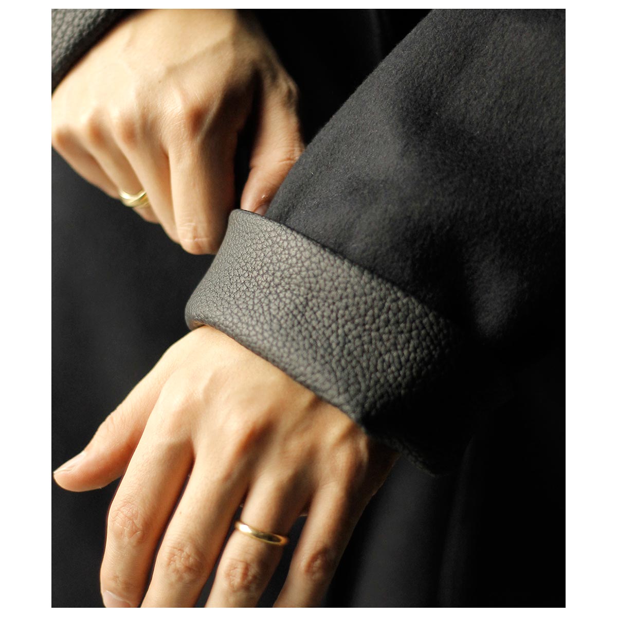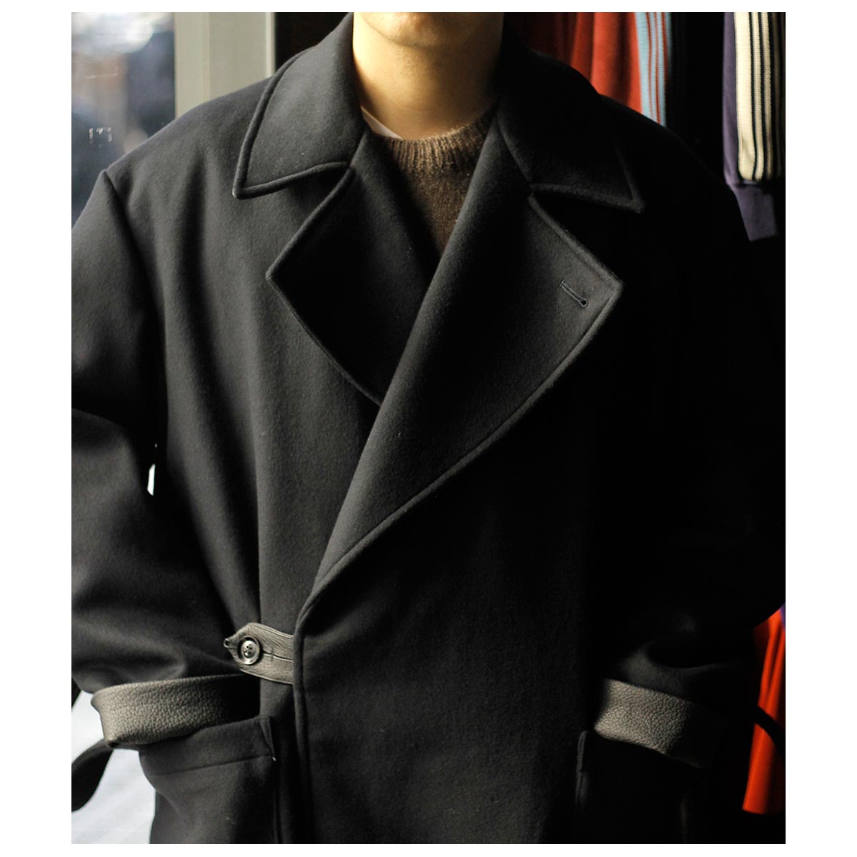 ラフに羽織ことも、かっちり着こなすことも可能なヴィンテージガウンをモチーフにしたラップコートをデザイン。 ルックでも二人のモデルに2通りのコーディネイトをいたしました。大きめな襟、ダブルの前見頃の大分量を生かした動きのあるラフな着こなし、そしてすべてのボタンを閉めかっちりまとめるとミリタリーを思わせる端正な顔立ちとなります。ウエストを止めるレザーダブはエルメス傘下のタンナー、デュピュイ社カーフを使用。