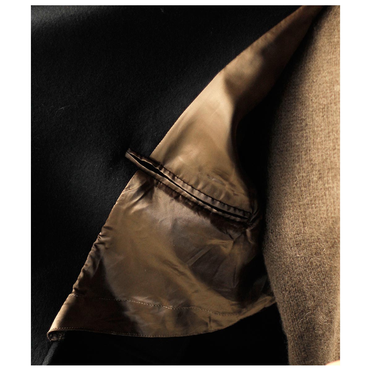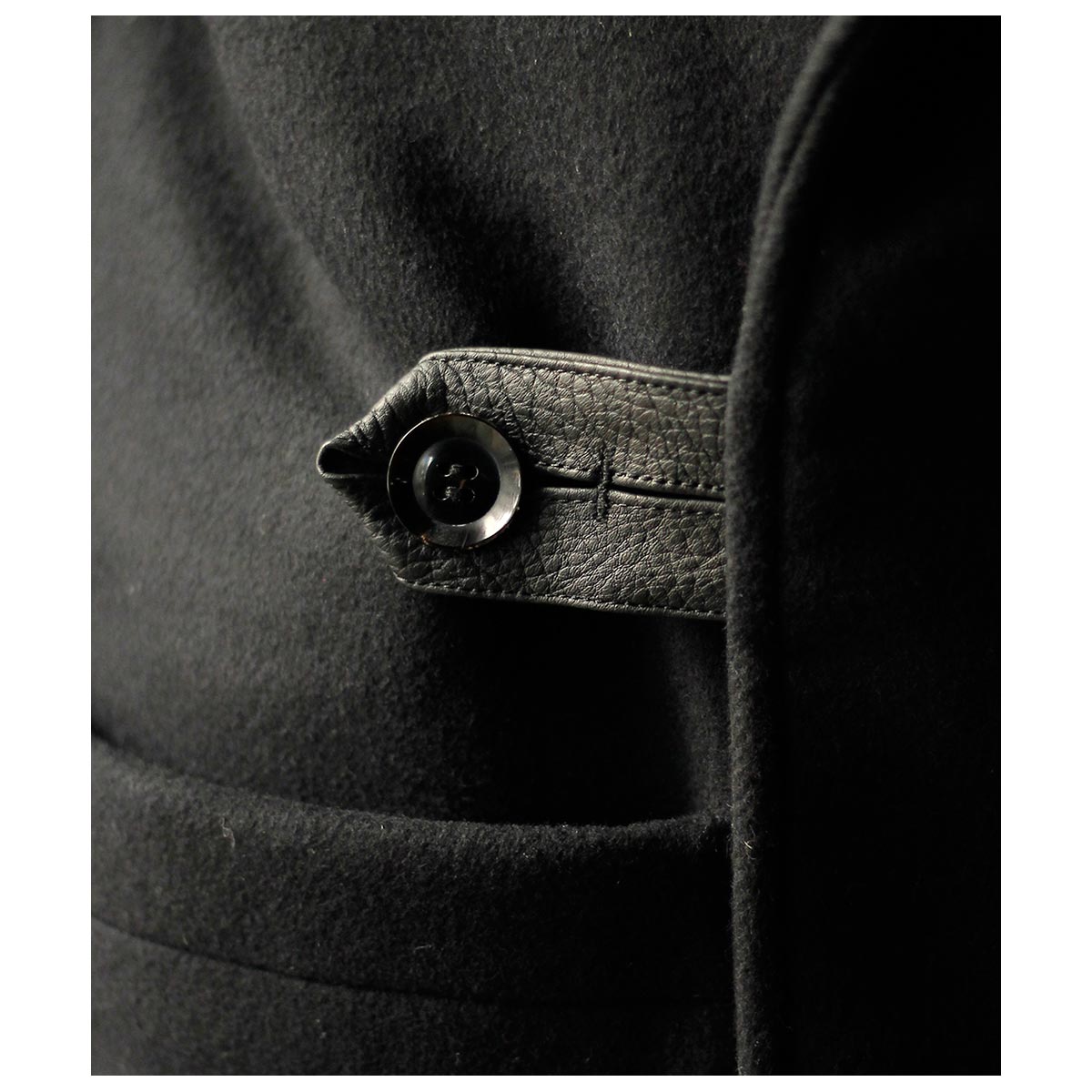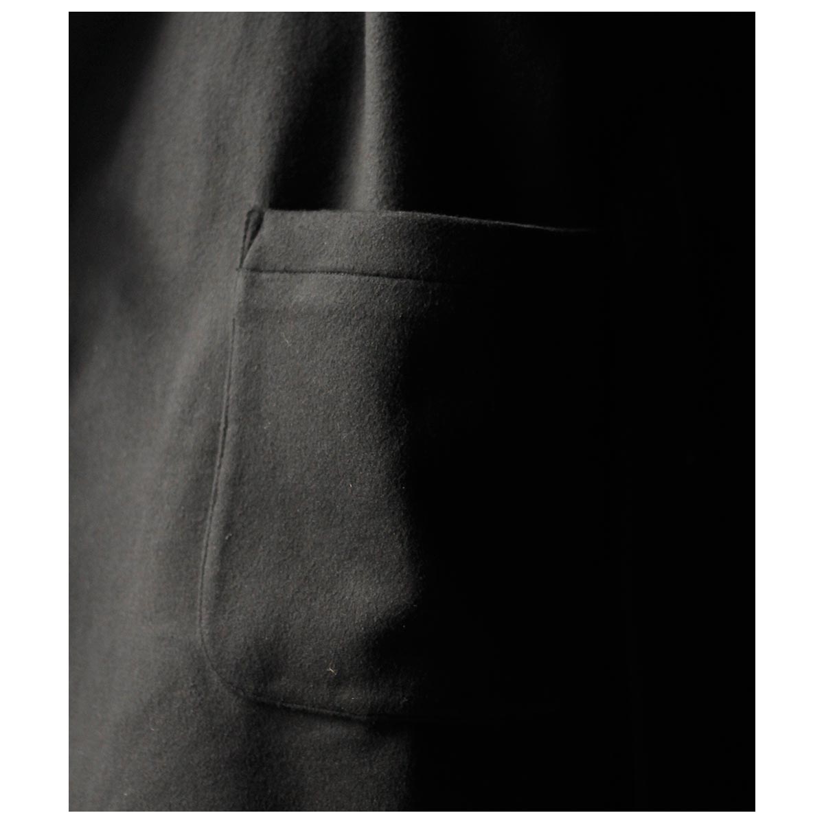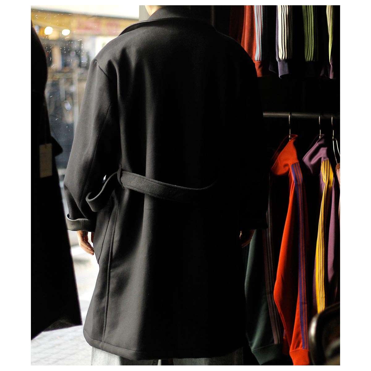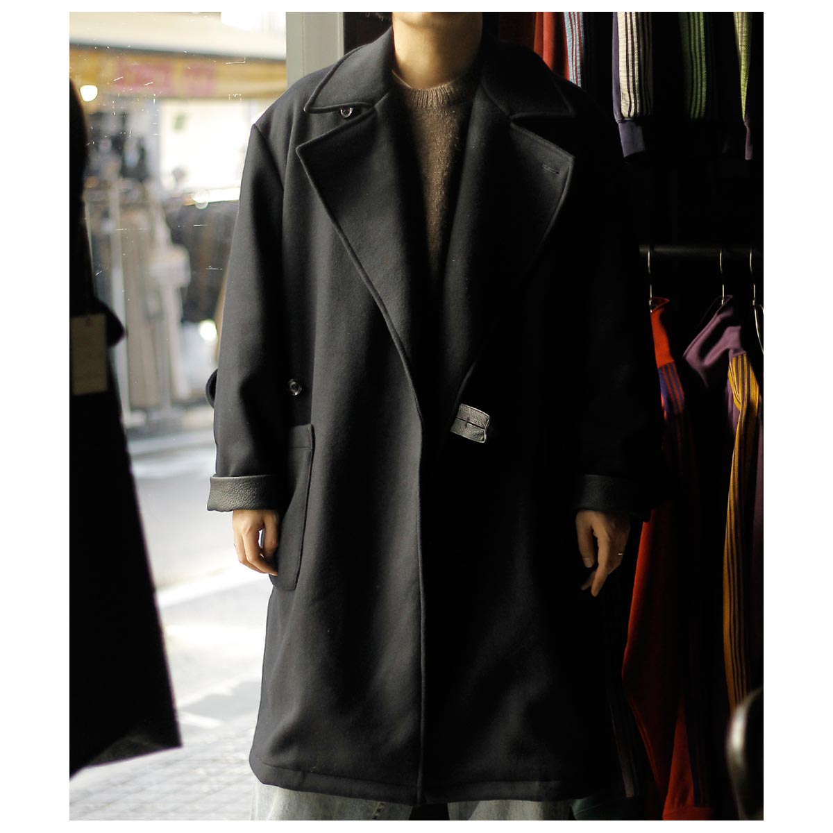 ラフに羽織ことも、かっちり着こなすことも可能なヴィンテージガウンをモチーフにしたラップコートをデザイン。 ルックでも二人のモデルに2通りのコーディネイトをいたしました。大きめな襟、ダブルの前見頃の大分量を生かした動きのあるラフな着こなし、そしてすべてのボタンを閉めかっちりまとめるとミリタリーを思わせる端正な顔立ちとなります。ウエストを止めるレザーダブはエルメス傘下のタンナー、デュピュイ社カーフを使用。