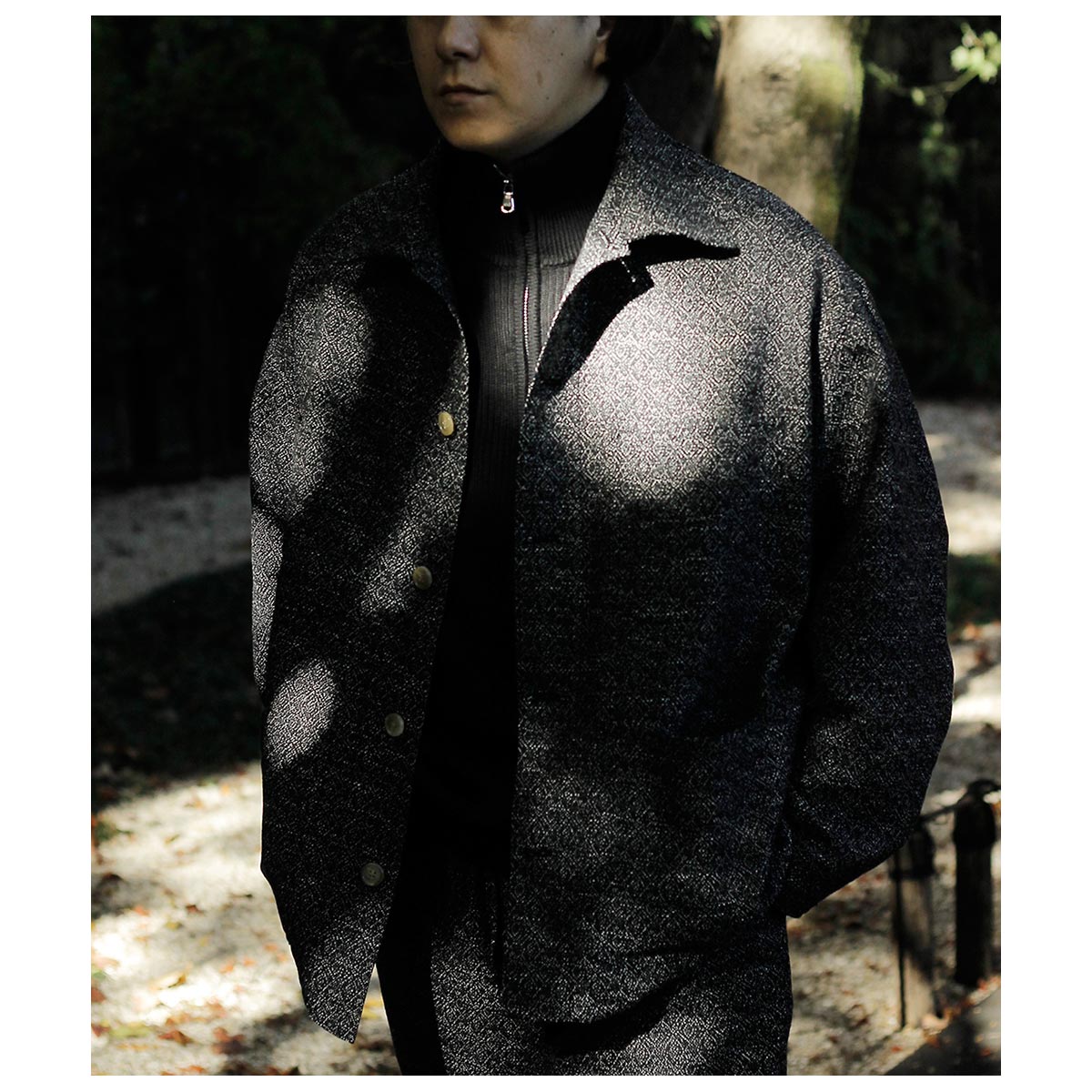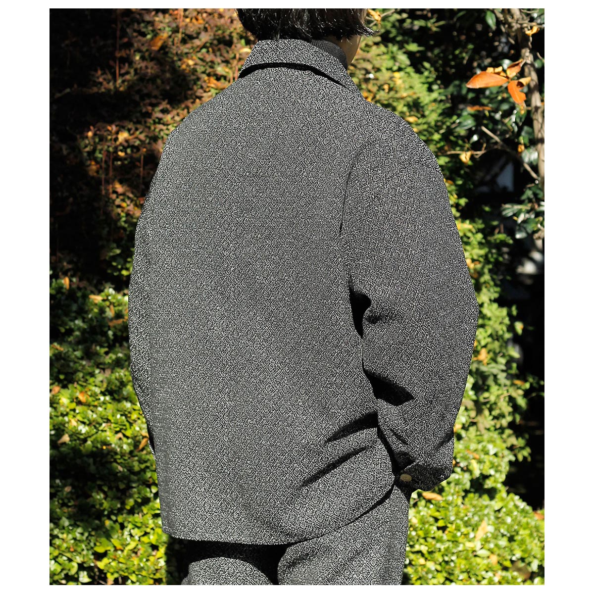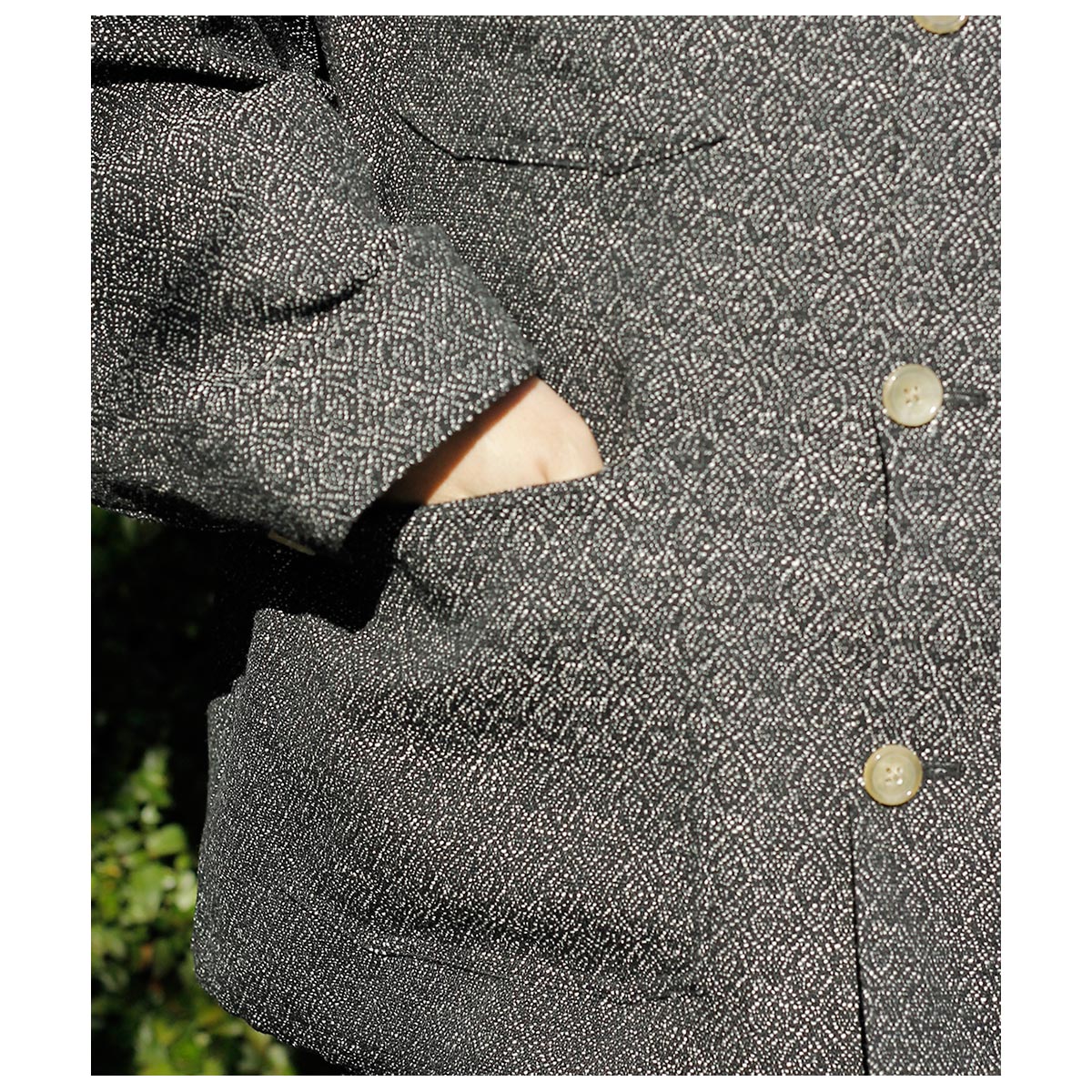 仏LVMHのデッドストックコレクションからピッ クしたウール×コットン主体のジャカードツイー ド。 ブラック、グレー、ホワイトの比較的太番手の糸でざっくりとジャカードに織り上げました。イタリア製の生地らしく、ツイードとはいえ毛羽感はほぼないドライな表面感で、都会的な印象に仕上がっています。