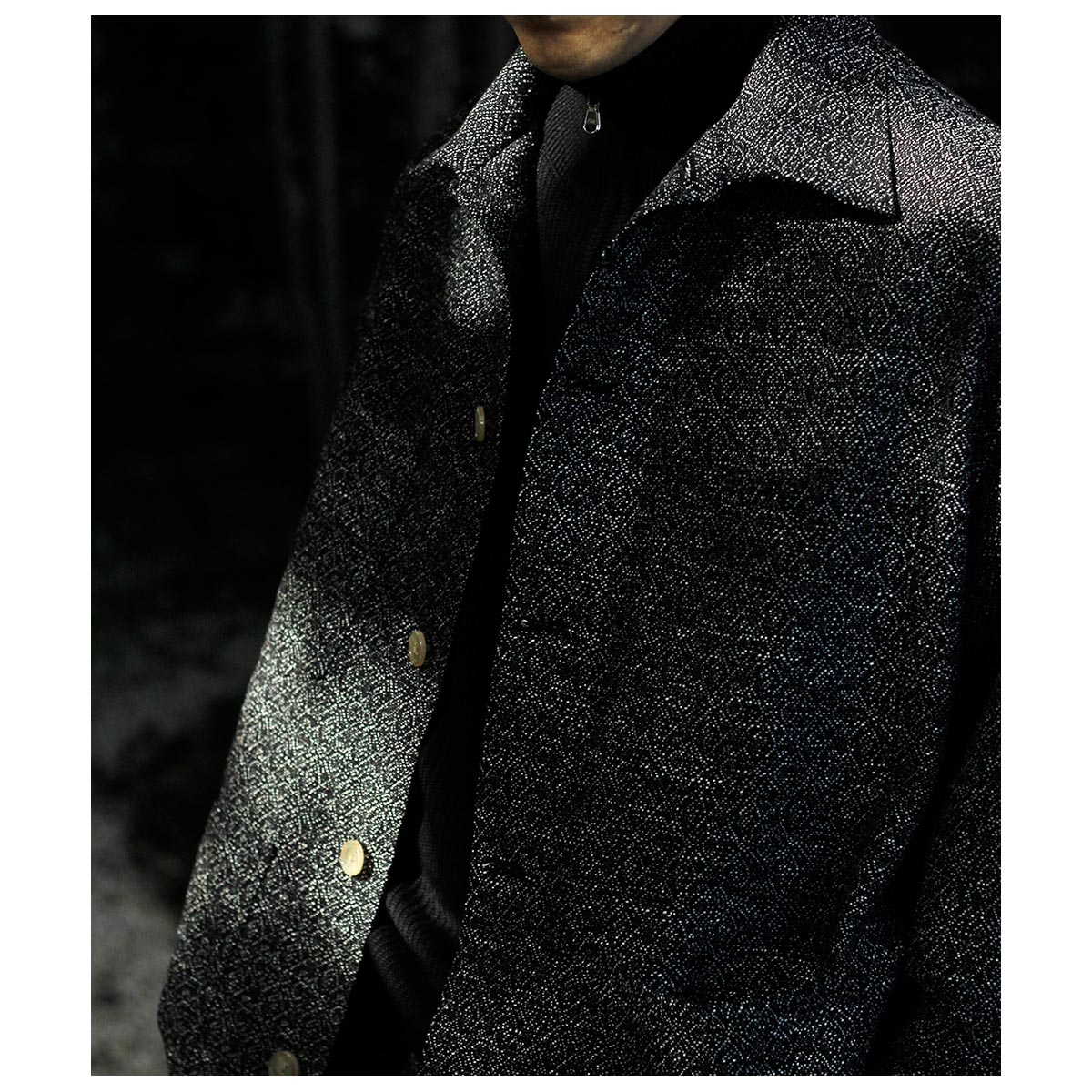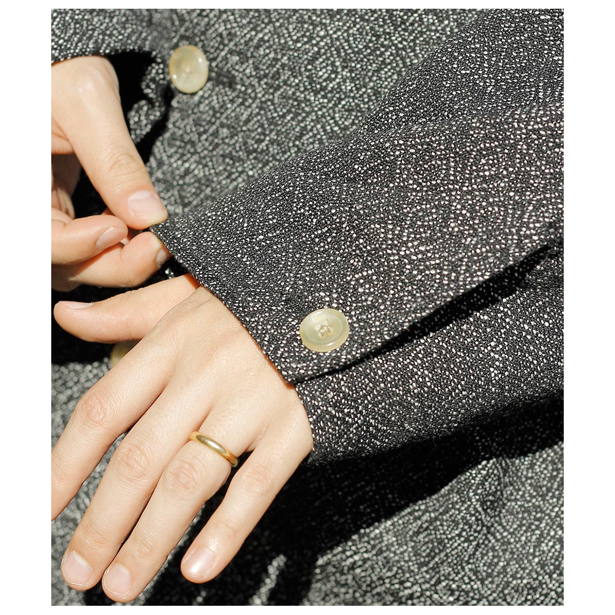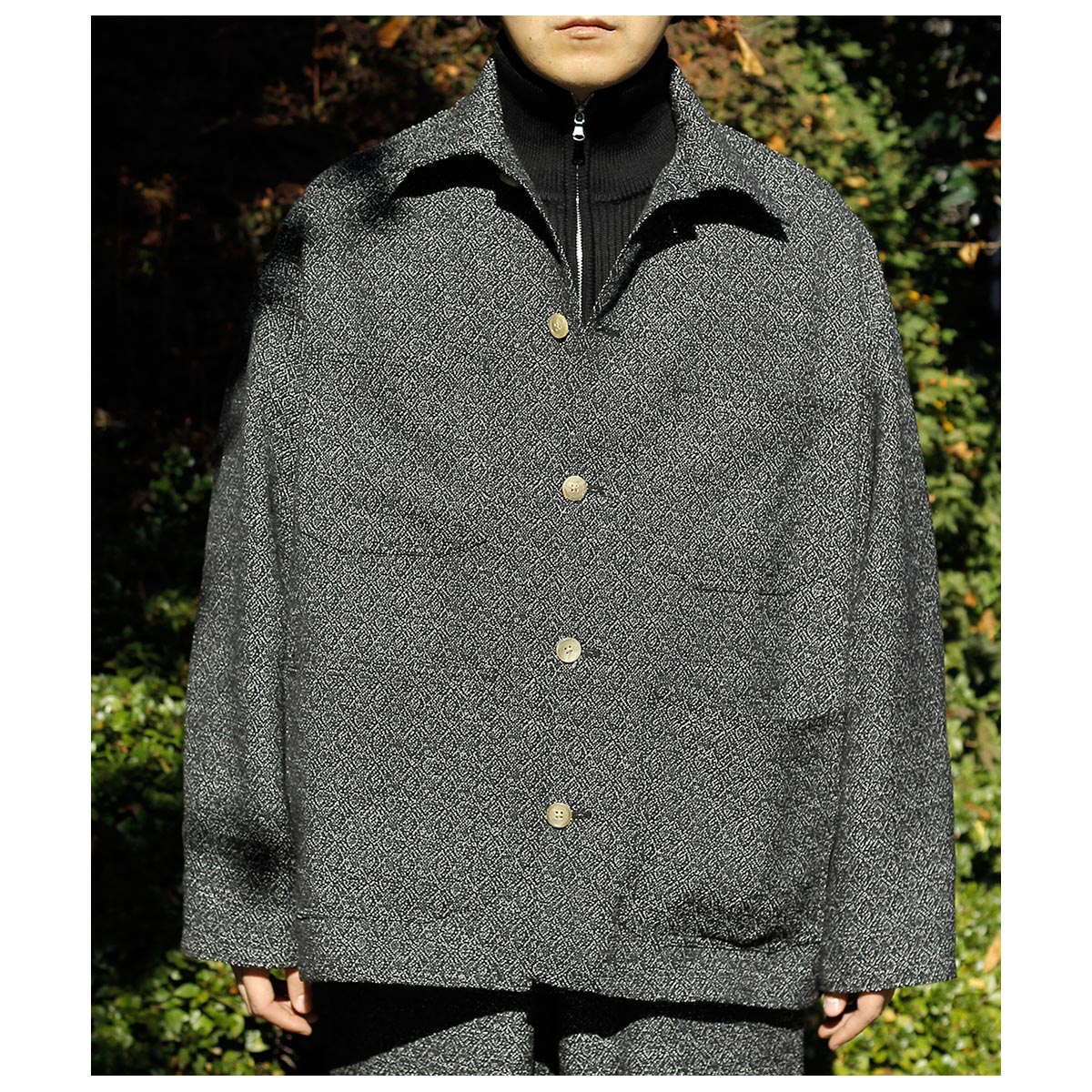 仏LVMHのデッドストックコレクションからピッ クしたウール×コットン主体のジャカードツイー ド。 ブラック、グレー、ホワイトの比較的太番手の糸でざっくりとジャカードに織り上げました。イタリア製の生地らしく、ツイードとはいえ毛羽感はほぼないドライな表面感で、都会的な印象に仕上がっています。