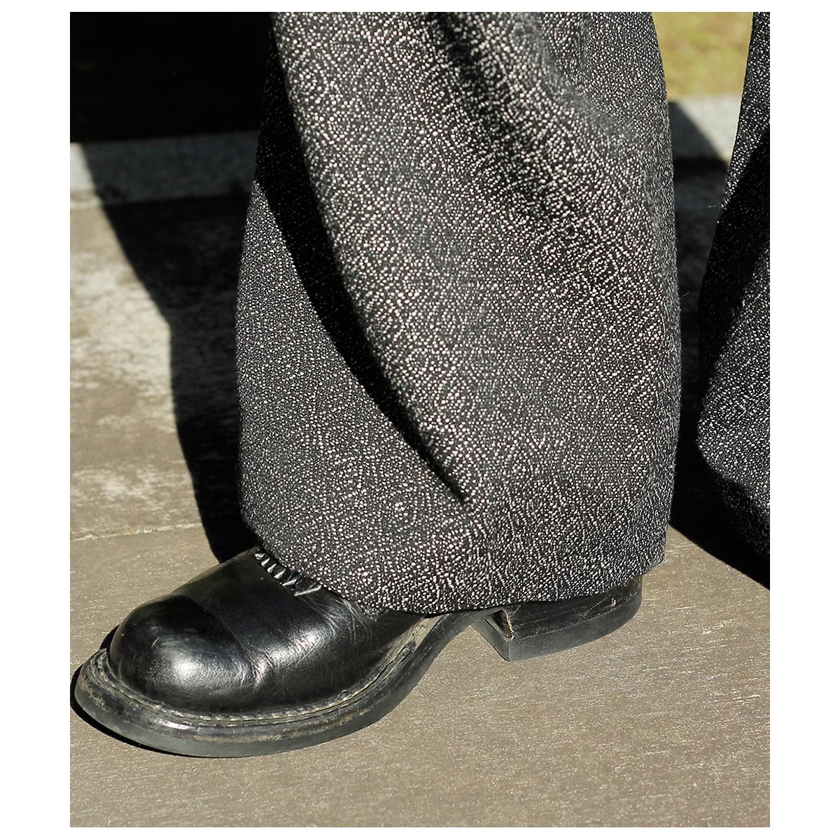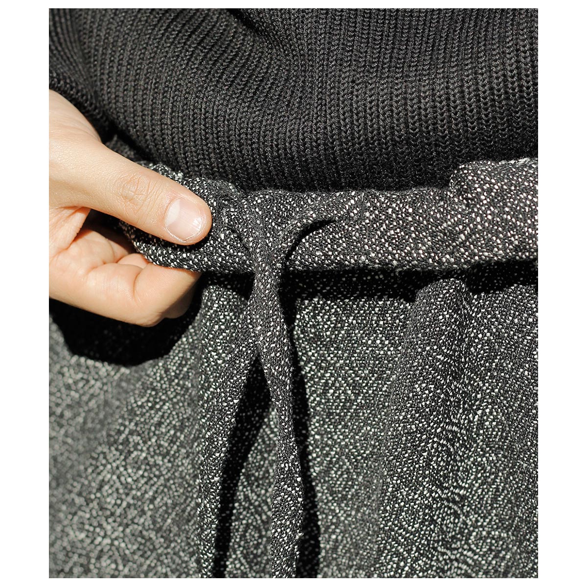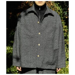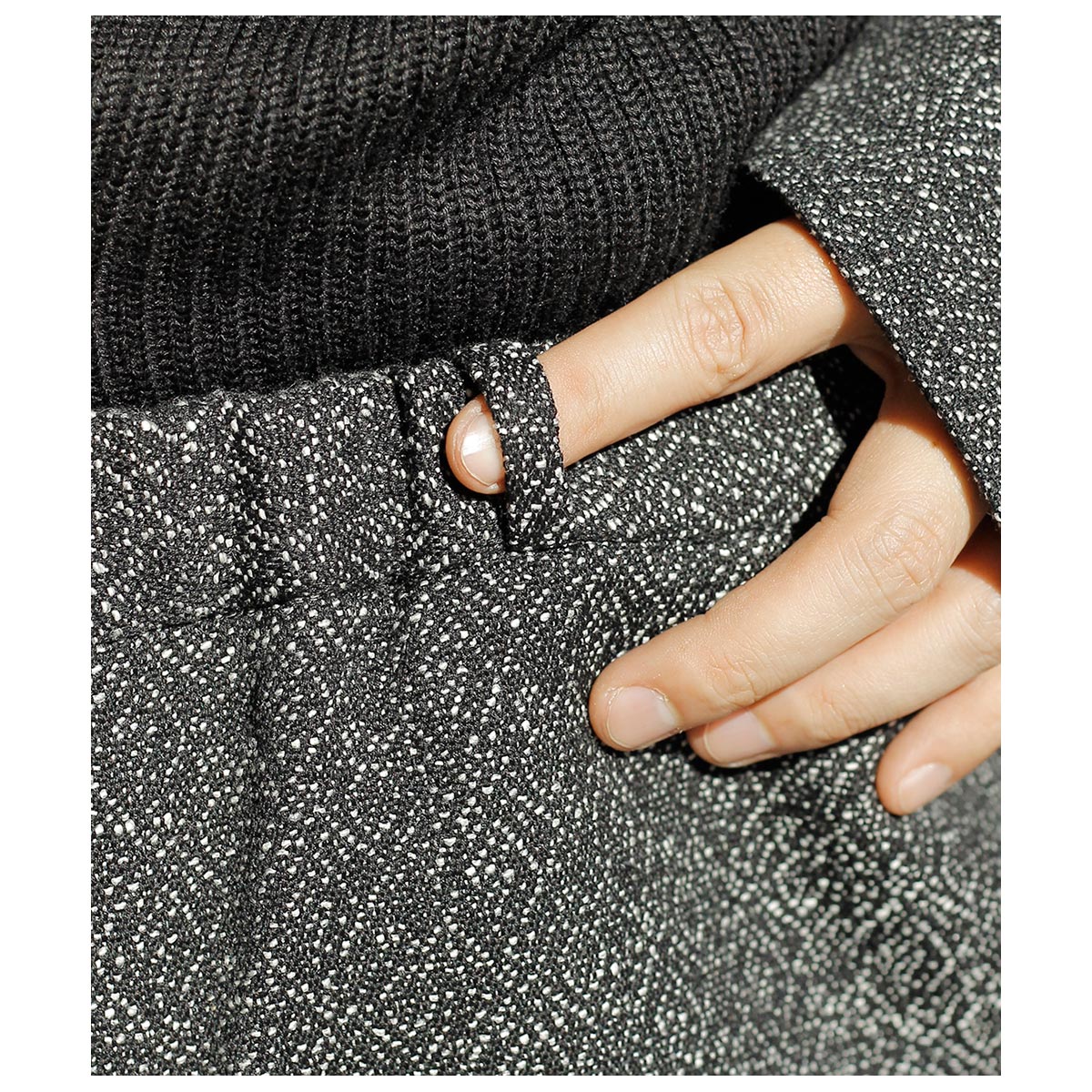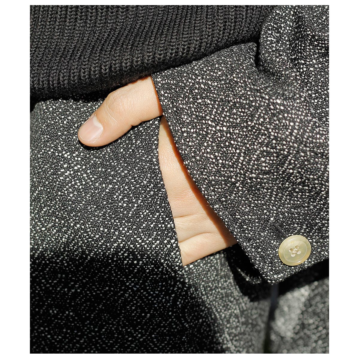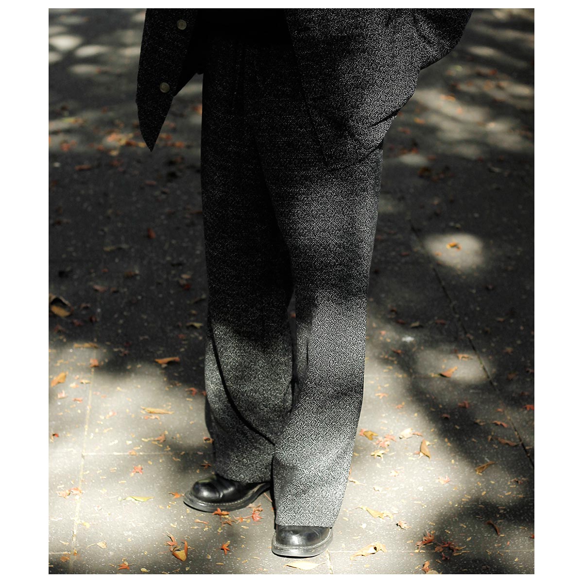 仏LVMHのデッドストックコレクションからピックしたウール×コットン主体のジャカードツイード。 ブラック、グレー、ホワイトの比較的太番手の糸でざっくりとジャカードに織り上げました。イタリア製の生地らしく、ツイードとはいえ毛羽感はほぼないドライな表面感で、都会的な印象に仕上がっています。