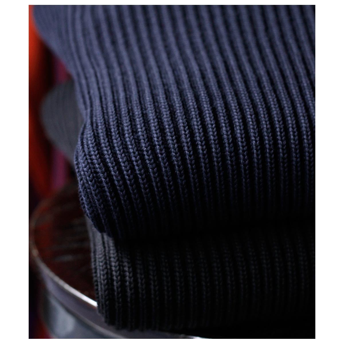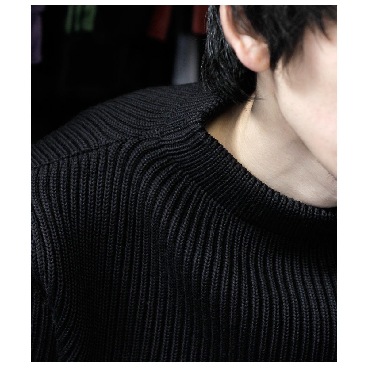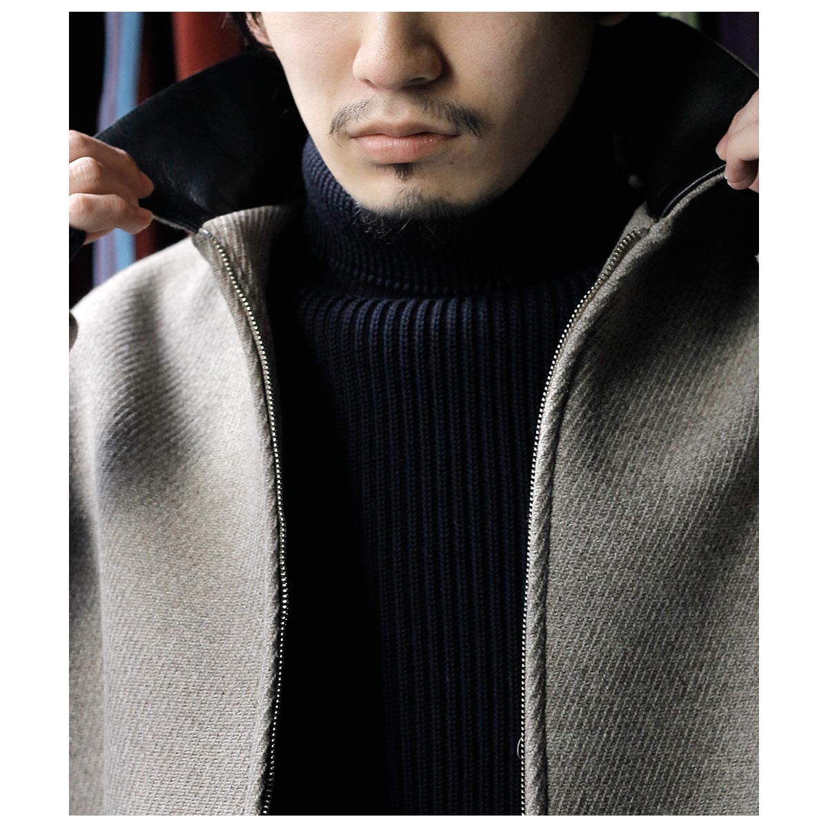 クラシックで高度な製法にて作られており、別々に編んだパーツを裏側で繋ぐような簡易な作りでは無く、編み方や方向を変化させながら一気に編み立てるというコストを無視した作りもスゴイ。生地にはイタリア紡績の上質なメリノウールを重厚にざっくりと5ゲージで編み上げられたモノを使用しているため重厚でありながら上品な風合いが際立っている。その本体はずっしりと重く、総重量1.0kg以上はある、かなりのヘビーウェイト。繊細な作りでありながらも伝統的で無骨で男らしい完成度は魅力的。