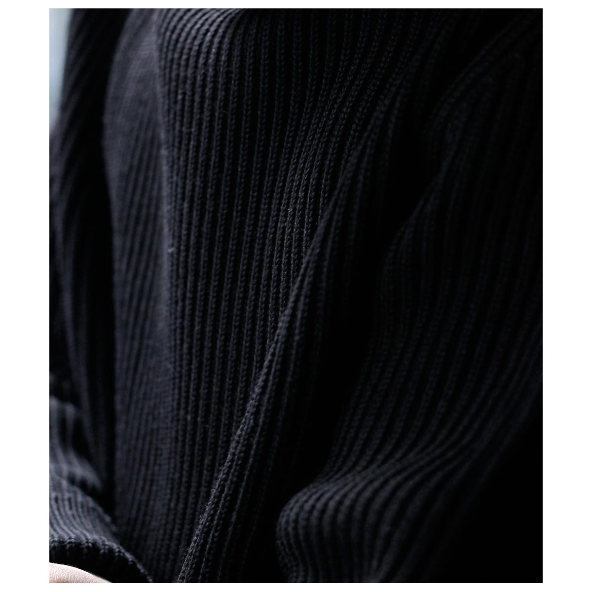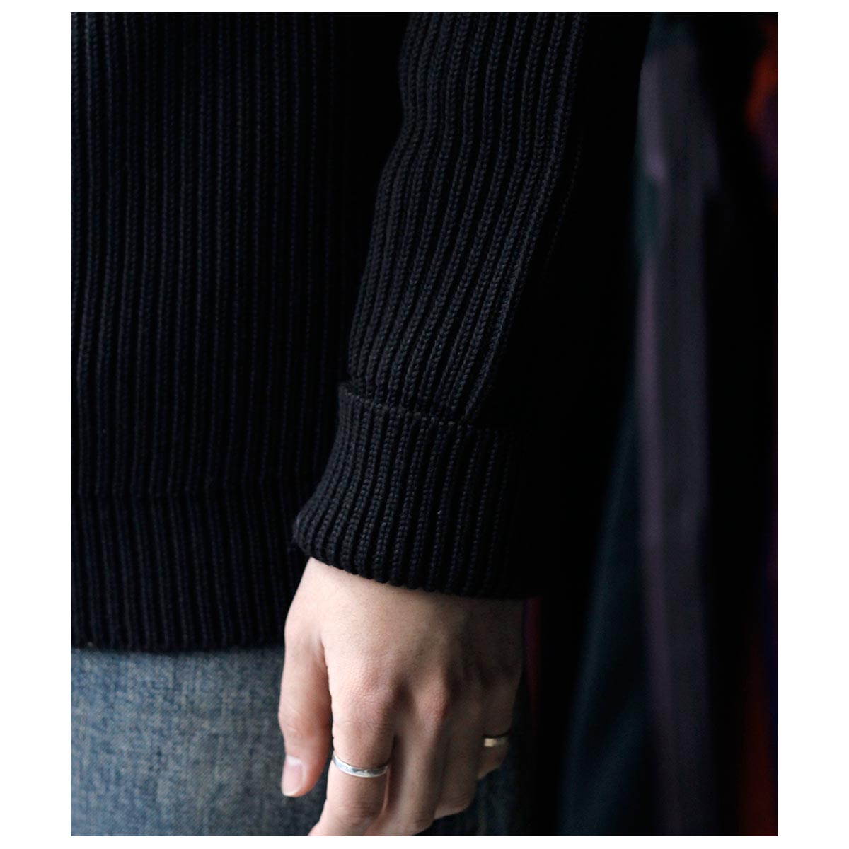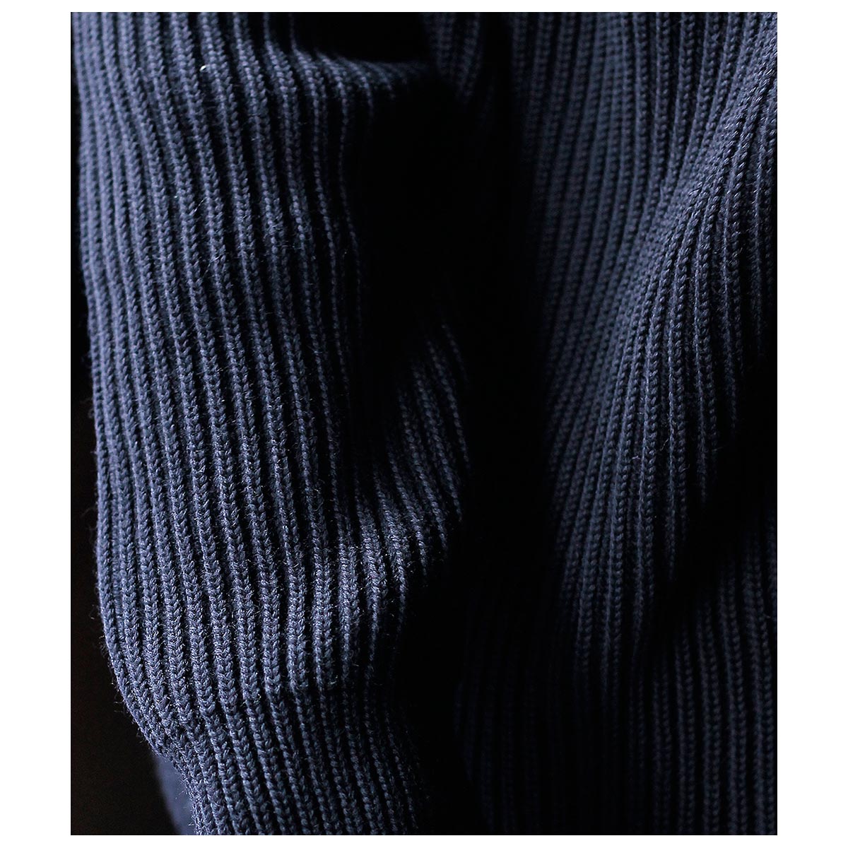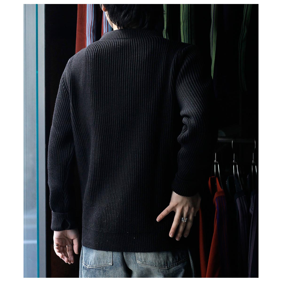 クラシックで高度な製法にて作られており、別々に編んだパーツを裏側で繋ぐような簡易な作りでは無く、編み方や方向を変化させながら一気に編み立てるというコストを無視した作りもスゴイ。生地にはイタリア紡績の上質なメリノウールを重厚にざっくりと5ゲージで編み上げられたモノを使用しているため重厚でありながら上品な風合いが際立っている。その本体はずっしりと重く、総重量1.0kg以上はある、かなりのヘビーウェイト。繊細な作りでありながらも伝統的で無骨で男らしい完成度は魅力的。