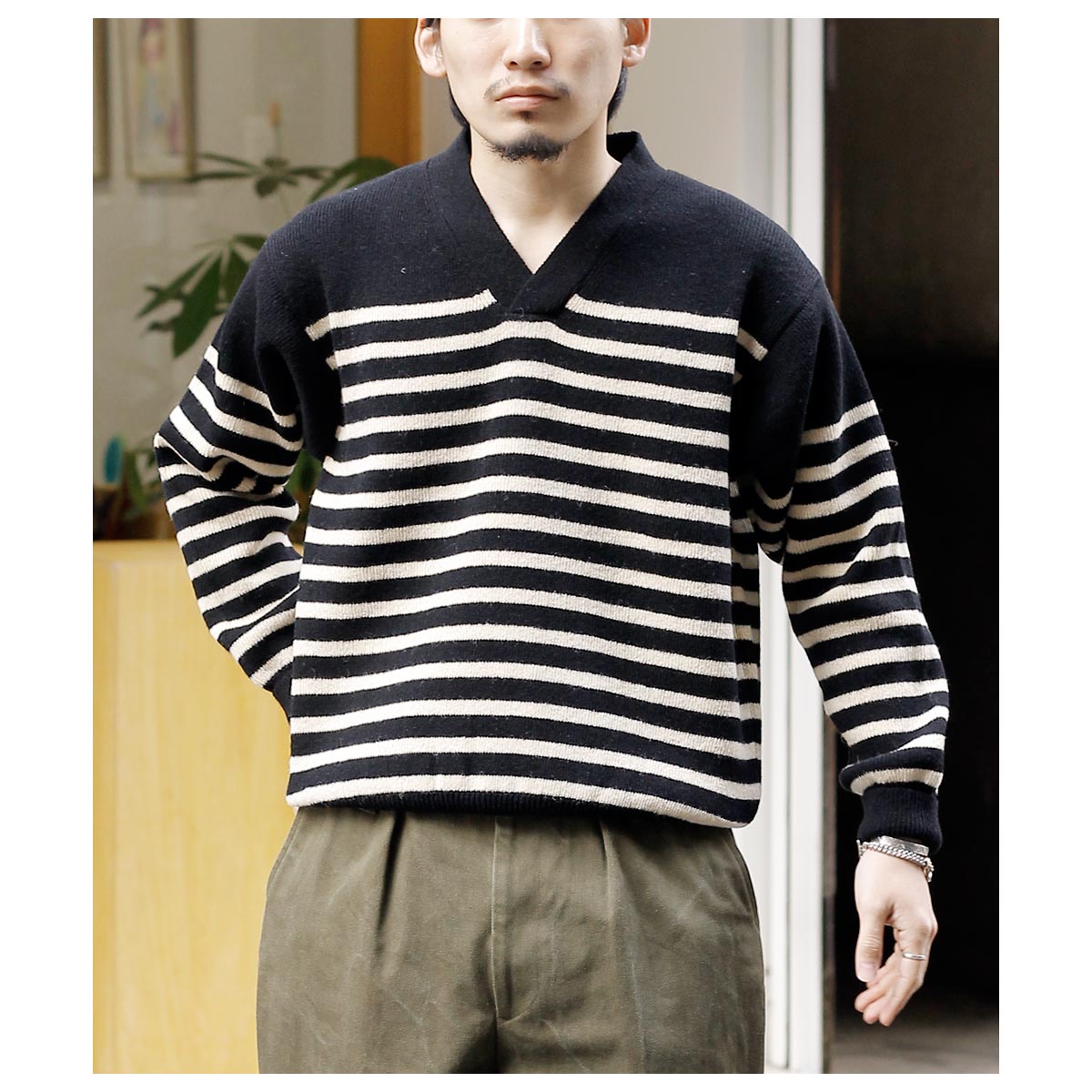 「GOBセーター」と身幅、丈は同じVネックモデル。クロスVのデザインでミリタリーイメージに仕上げています。肩やアームホールはセットインスリーブのパターンになっていますが、着用時はゆったり目のサイズなのでドロップショルダーとなります。