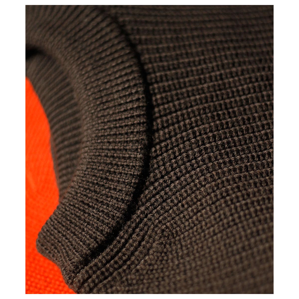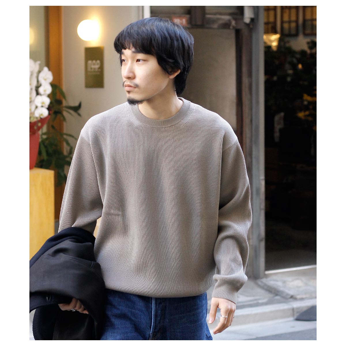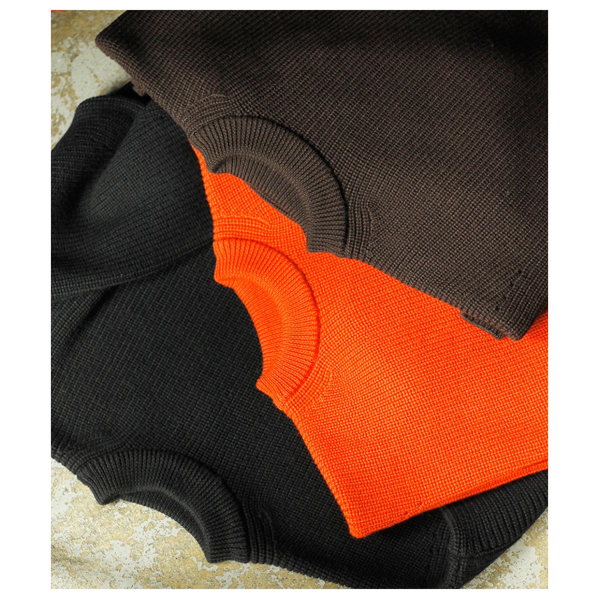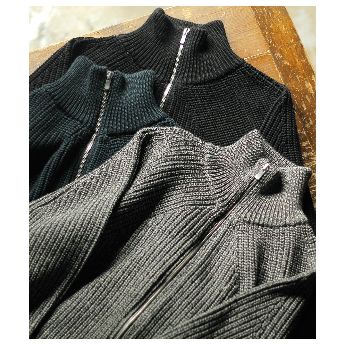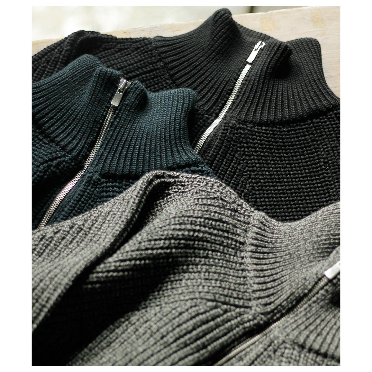 無駄を削ぎ落としたデザインと、安心感のある肉厚な畦編み(リブ編み)で仕立てました。