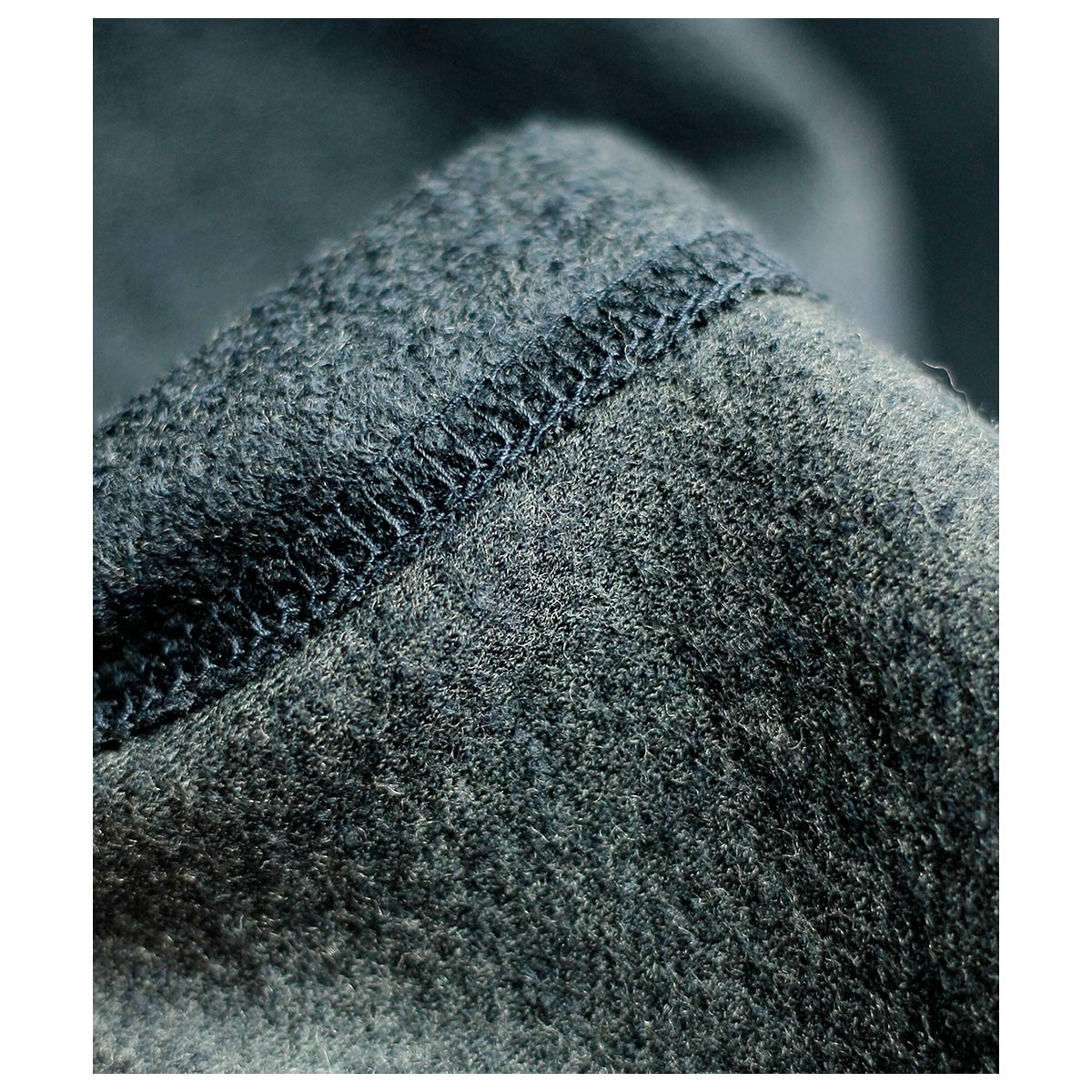 Super120’の縮絨のインレーメルトン。 今回は前回の厚さを半分に軽減しました。 その狙いは、よりアウターの下にも着れるようにと考えたことが出発点となりました。 しかし前回までにこの素材の良さでもあるメルトンのようなハリ感をどのようにしたら残せるかを試行錯誤を繰り返し、 今回の番手と縮絨加減の調整の適性を探ることからスタートしました。 何度も試行錯誤を繰り返し、ベストだと思う厚さとハリ感を実現し、見た目とは相反し、驚くほどの軽さを手に入れました。 もう一つこのシーリーズでいつもこだわっているポイントがございます。 それは色目です。 既視感の無い、新しい霜降りを作るということを重要視しており、 今回はダークネイビーにチャコールTOPを散りばめたような色目を編みで表現しました。 この2色を使って今までに見たことのない正装の装いにもマッチする霜降りを作りました。 カットソー素材なので少しだけ伸縮性があること、布帛のメルトンに比べて軽さがあることに加え、素材に肉があることによってドレーピングのシルエットがとても際立つ素材になっています。