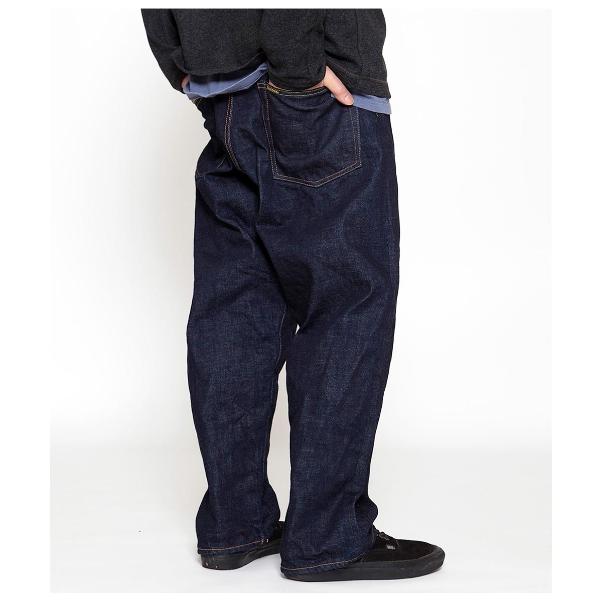 やや下がって配置された大きめのバックポケット、やや深い股上、そして太めのワタリ巾と膝巾を持つバギーシルエットが特徴です。