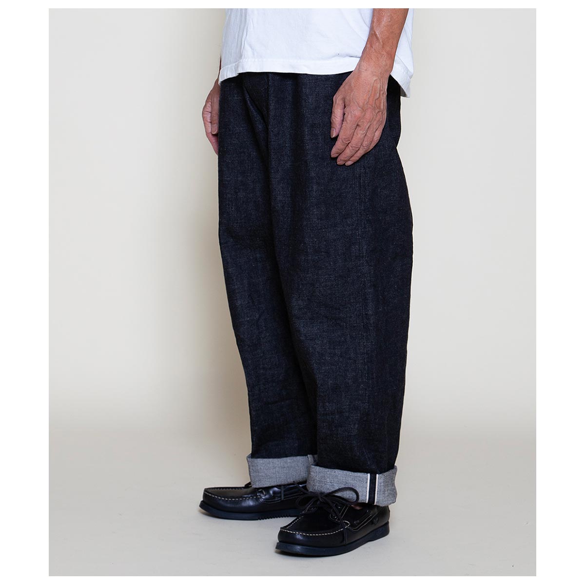 デニムの産地である岡山県で織られた14oz インディゴ・セルビッチデニム。米綿主体の混綿を使用し、ナチュラルなムラ形状の糸を引いています。 製織時に、経糸のテンションを緩めて織り上げることで、生地表面に凹凸が生まれ、穿き込んでいった後の経年変化でビンテージデニム特有の点落ちが生まれます。旧力織機を使い弱テンションでゆっくりと織り上げることで、50年代当時の雰囲気を再現しています。打ち込み過ぎず弱テンションで織られているため、穿き込んでいくと生地が柔らかくなり綺麗に縦落ちが出てきます。