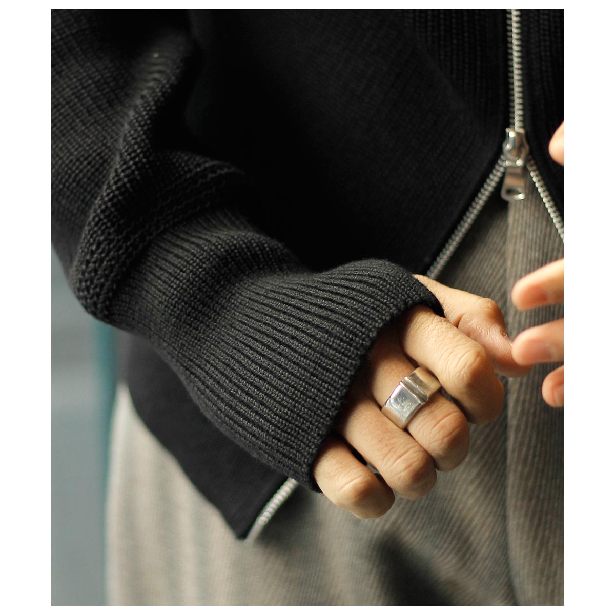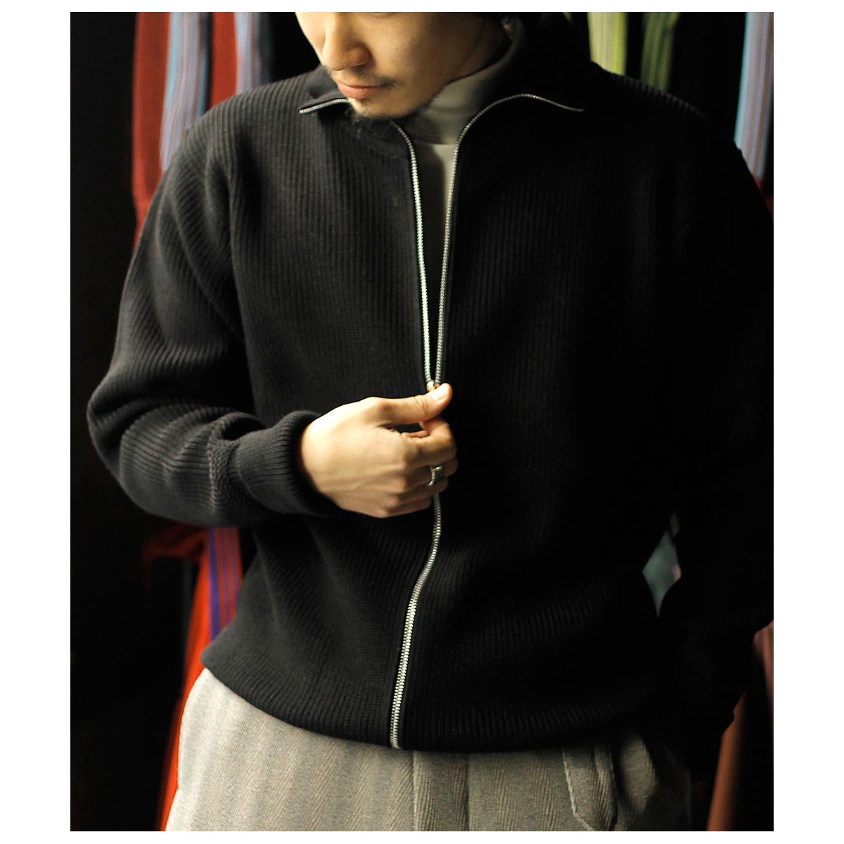 ジッパーがダブルジップ仕様になっておりアウターとして使いやすいタイプです。首元も少し余裕を持たせ、折り返してエリ付きカーディガンのようにも着れる仕様になっています。袖先には親指を通す穴が開いており、寒い日には袖先が簡易的なグローブになるようになっています