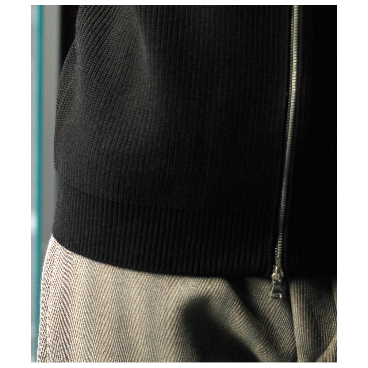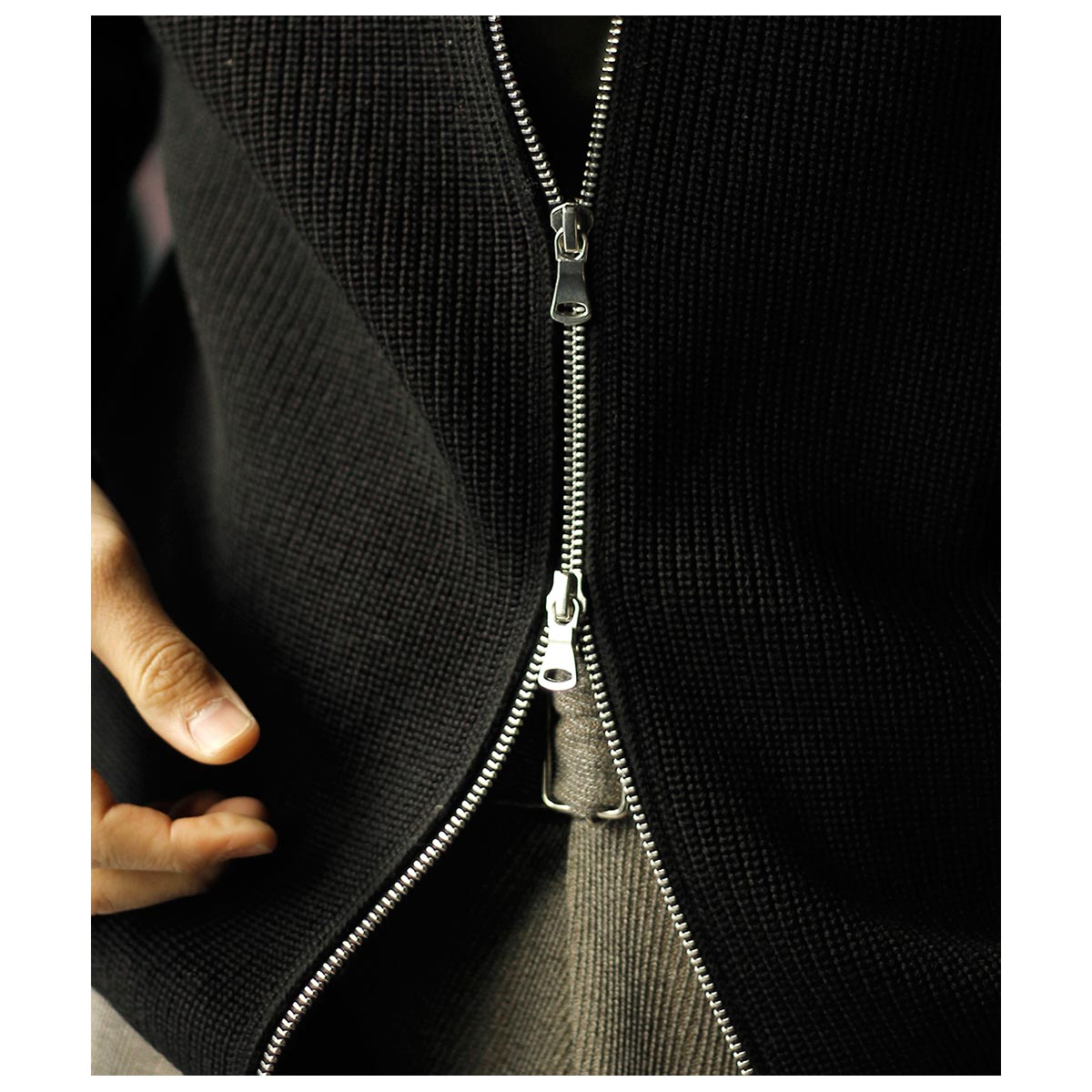 ジッパーがダブルジップ仕様になっておりアウターとして使いやすいタイプです。首元も少し余裕を持たせ、折り返してエリ付きカーディガンのようにも着れる仕様になっています。。袖先には親指を通す穴が開いており、寒い日には袖先が簡易的なグローブになるようになっています。