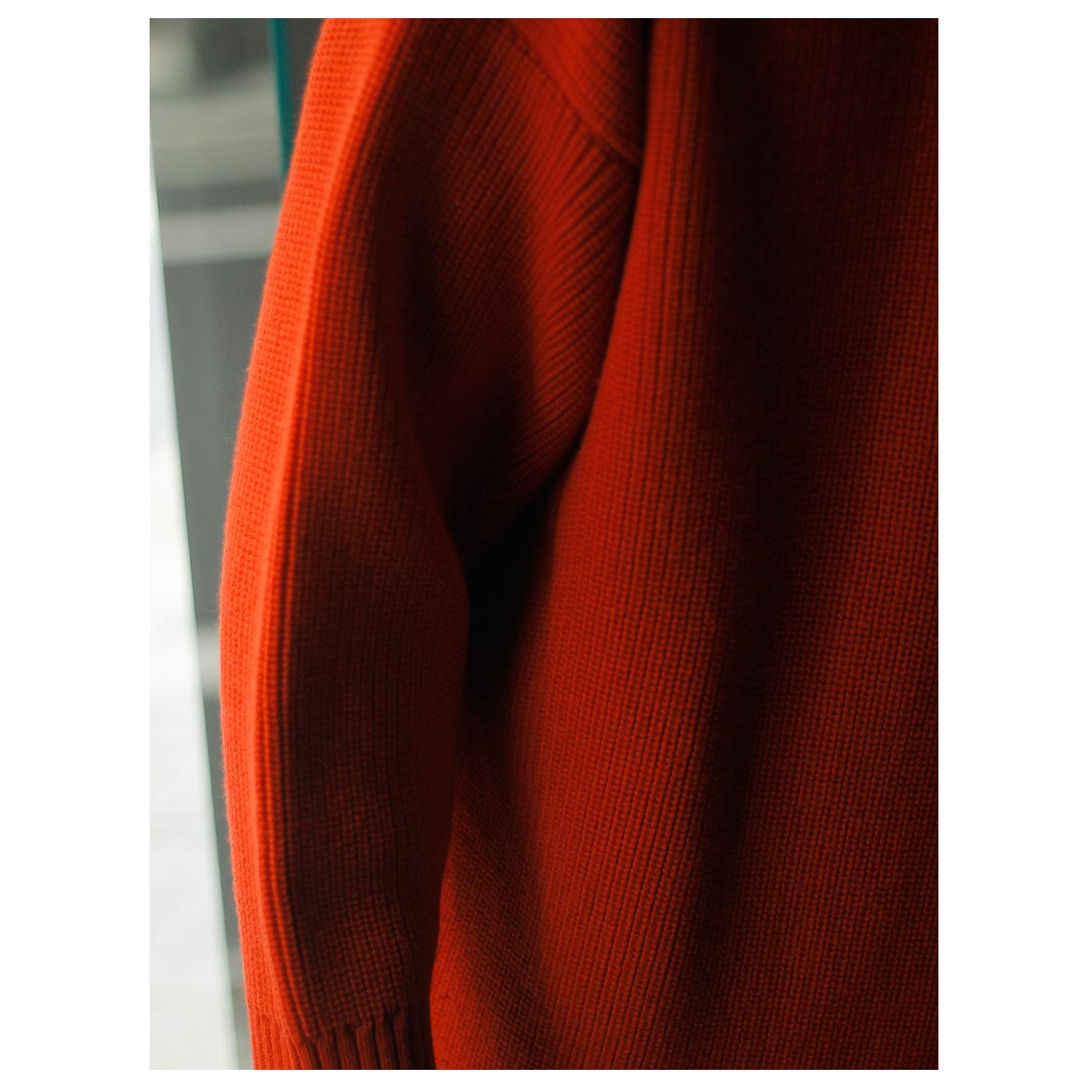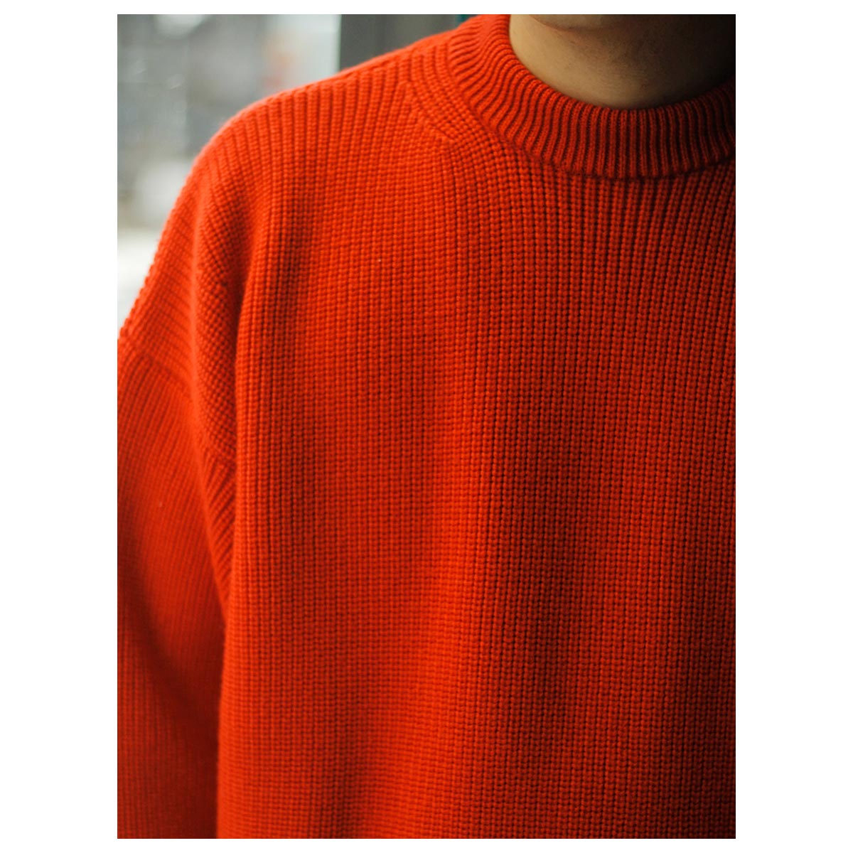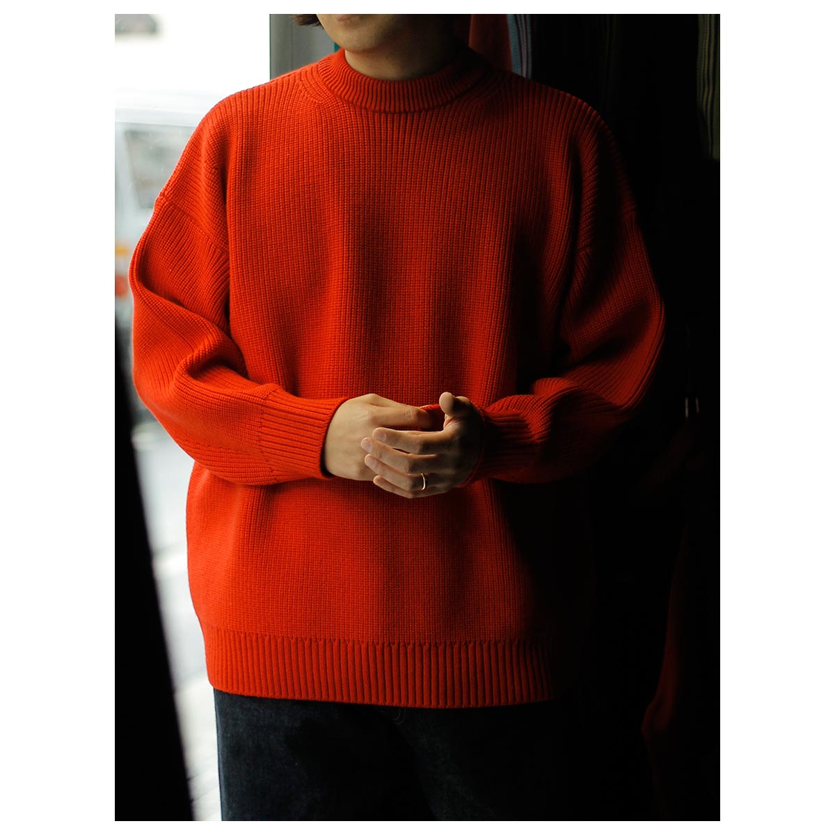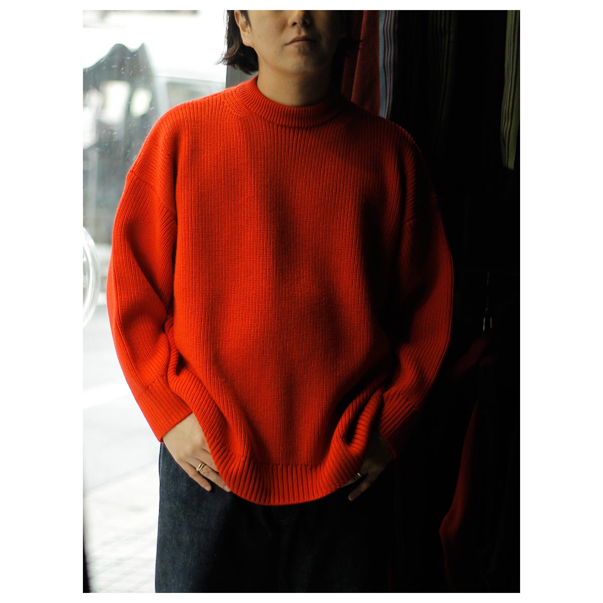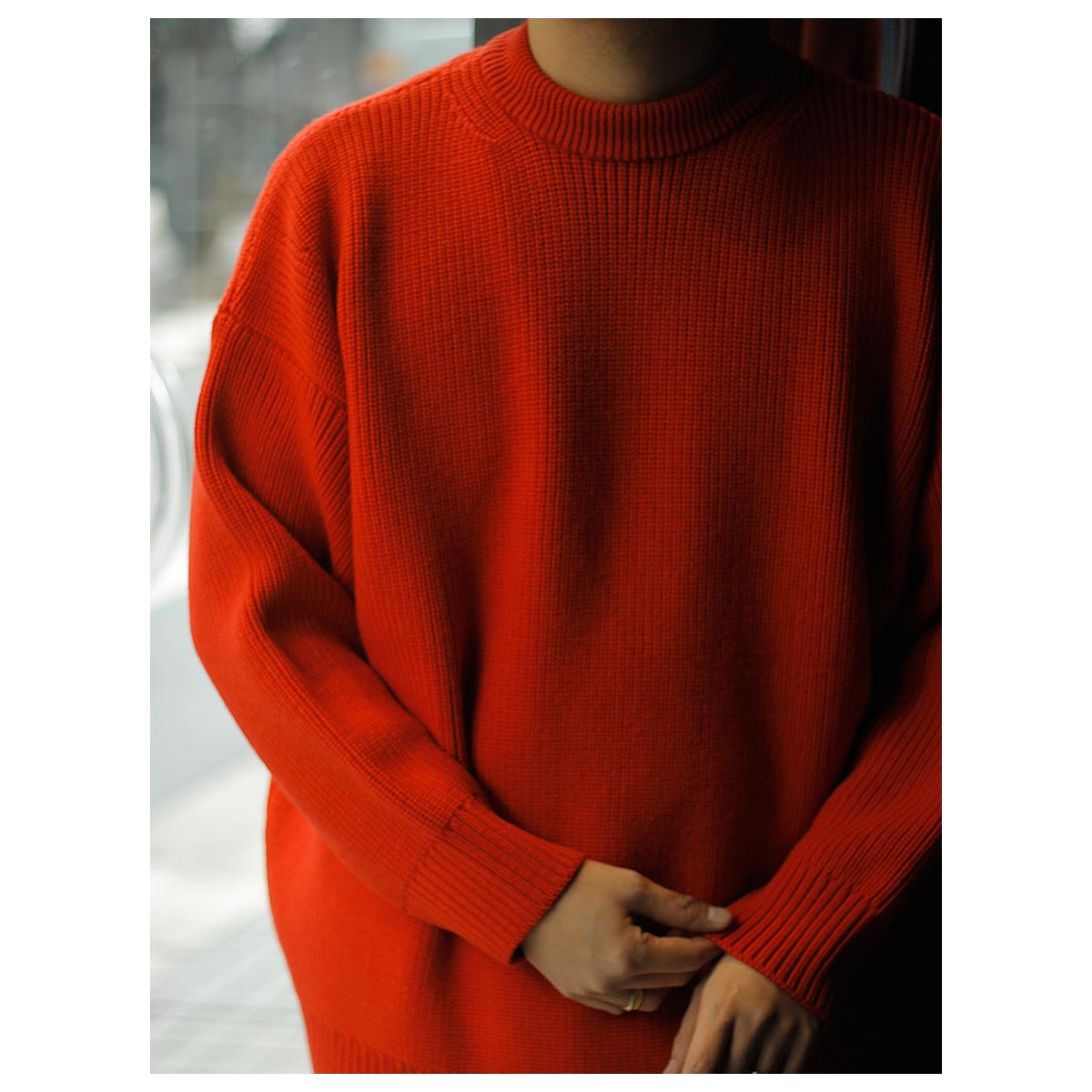 首回りのフィットはミニマムになっているので、インナーにいれて、ずっしりとしてニットのドレープ感を楽しんで見るのもいいですね。
