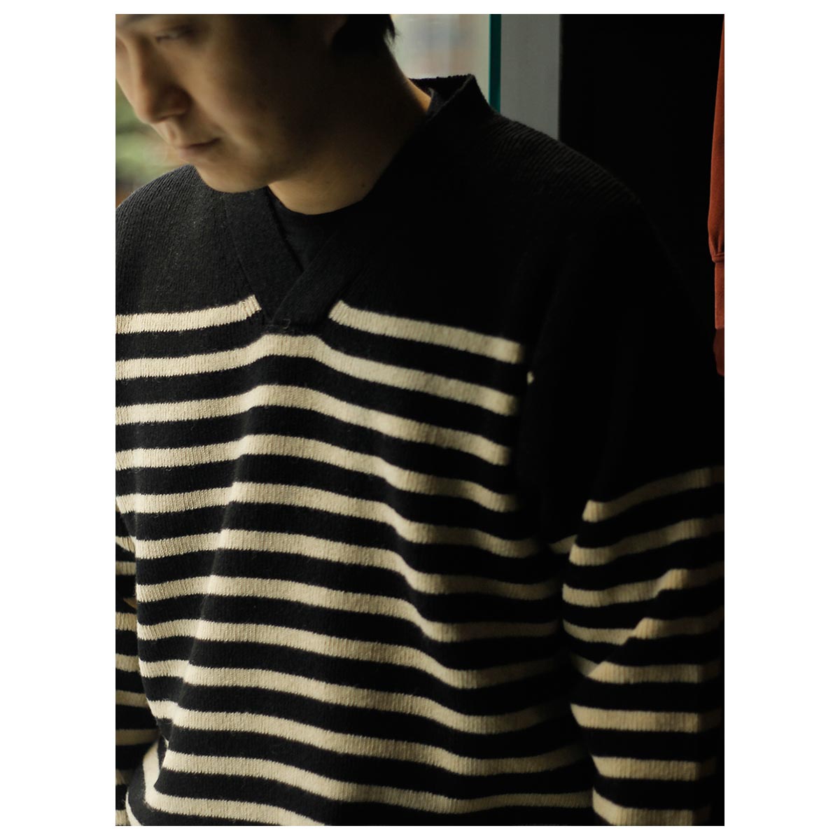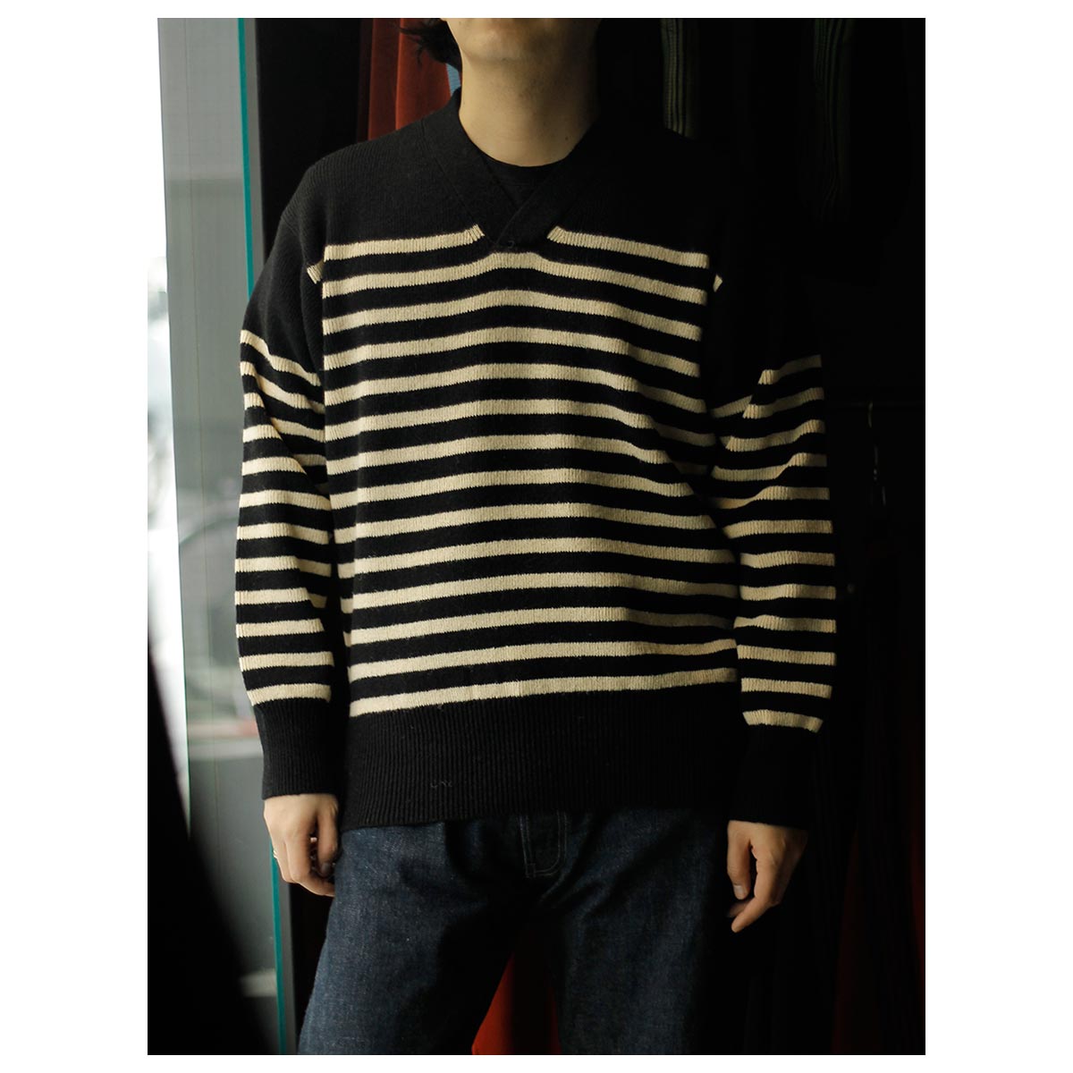 無骨なVネックセーターも、スロープスローになるとどこか優しい表情に。