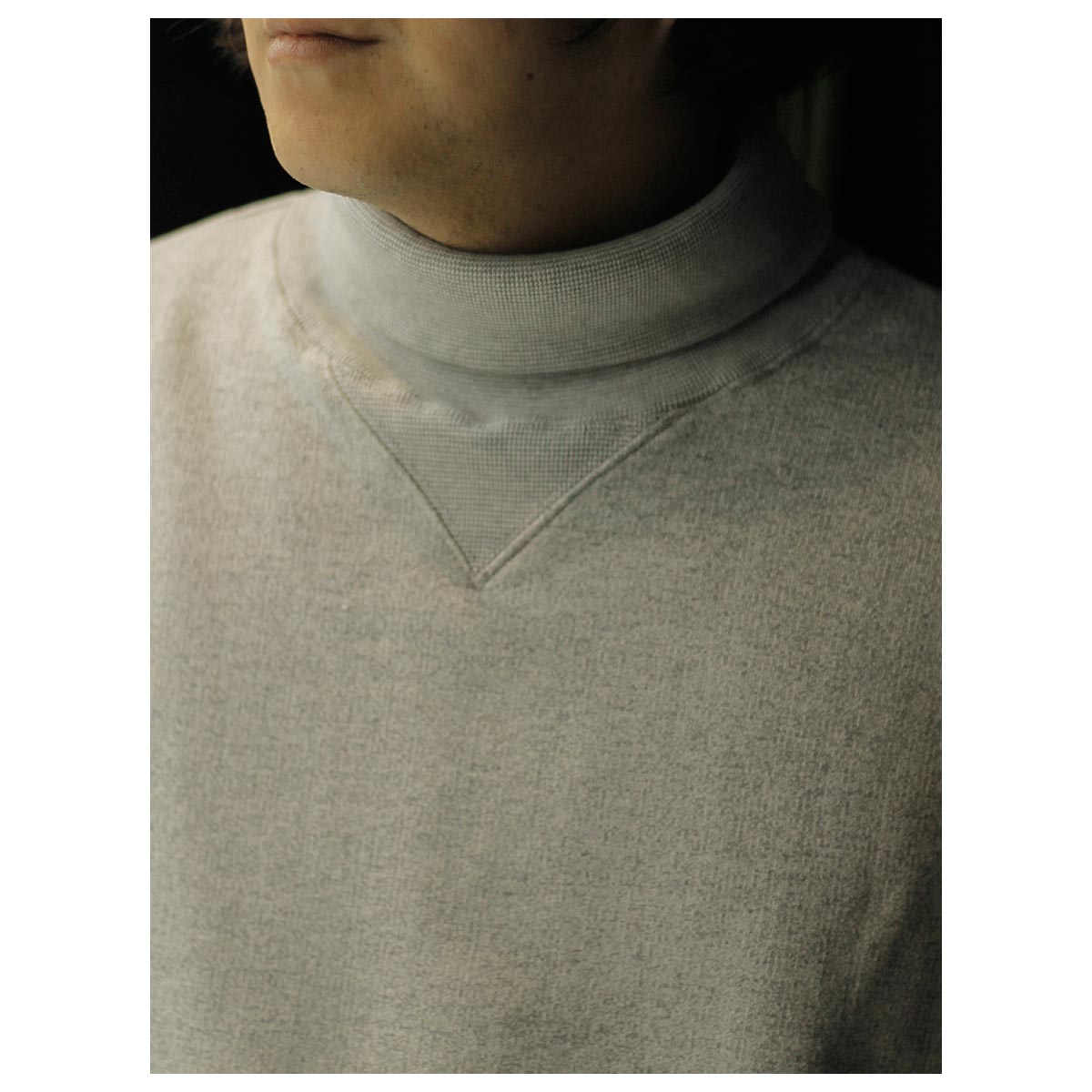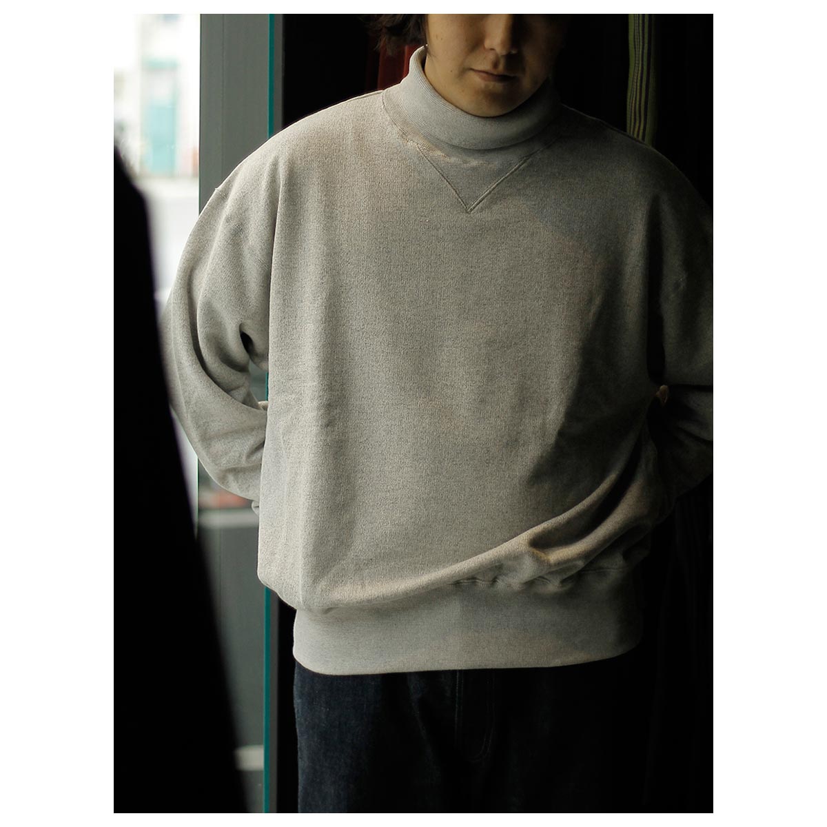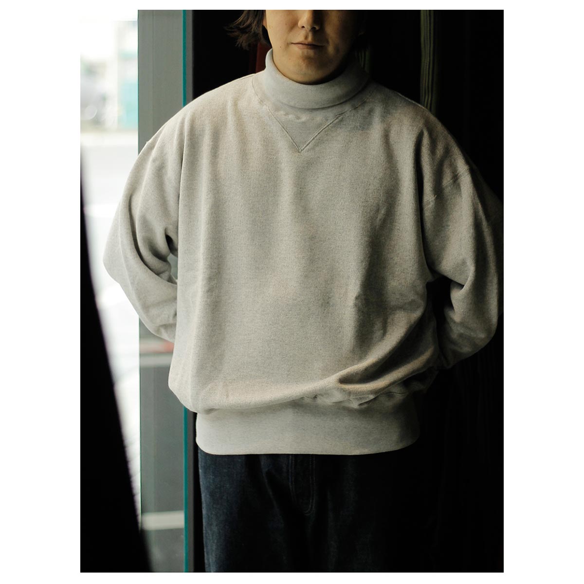 タートルネックのスウェット。